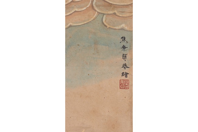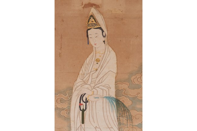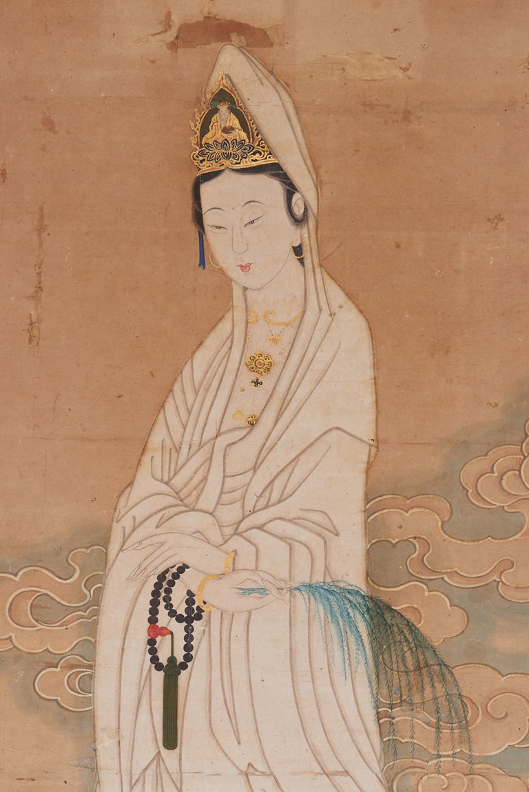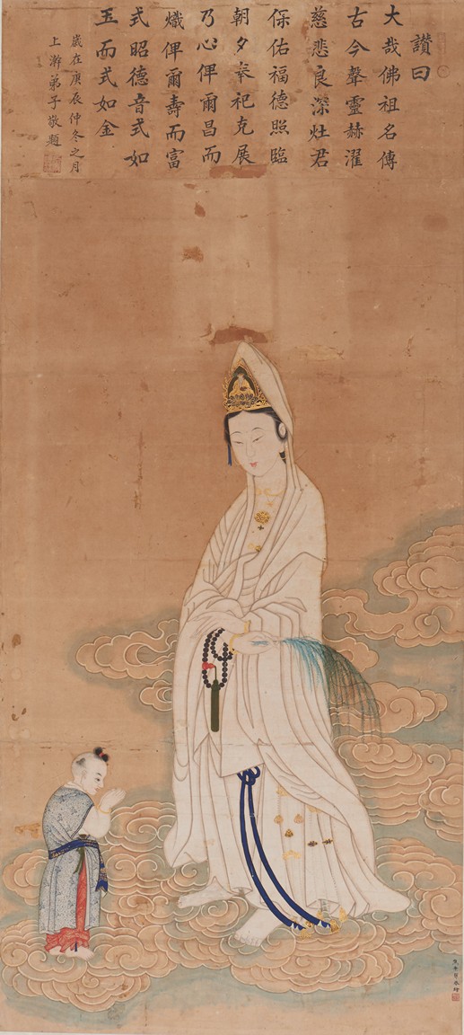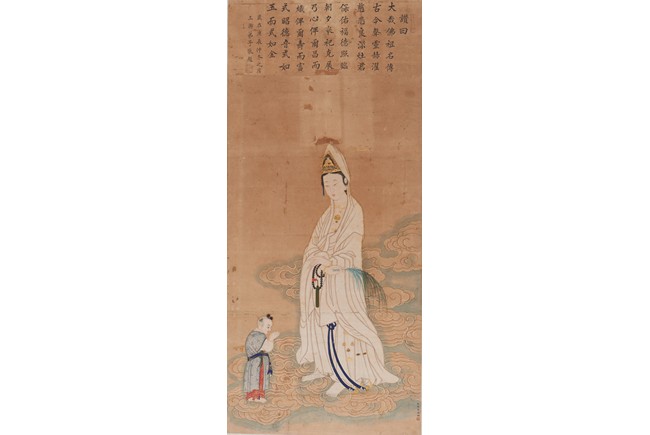 Color and ink on paper. Guan Yin and boy. Hanging scroll. Signed Jiao Bingzhen with one seal mark. With inscription above and one seal mark.