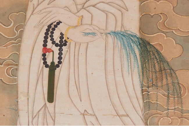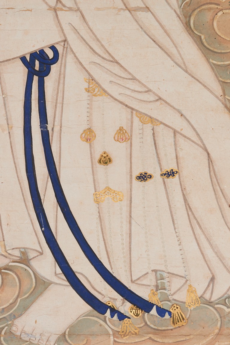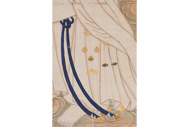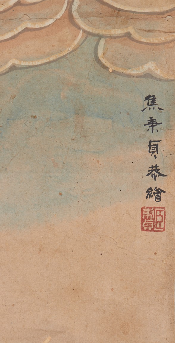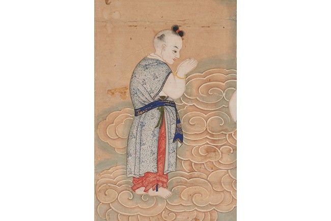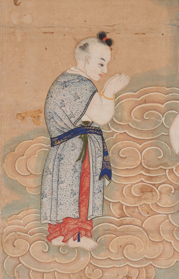 焦秉貞(焦秉貞,清代宮廷畫家。生卒年不詳,字爾正,山東濟寧人,康熙時官欽天監五官正,供奉內廷。擅畫人物,吸收西洋畫法)觀音身披天衣,面容和藹可親。有童子雙手合十立於身旁,拱手對觀音做揖。全畫墨色醇老,意趣清雅,風姿灑脫又飄逸嫻雅。菩薩在畫家筆下超凡入聖,端莊凝重,氣態渾然天成。