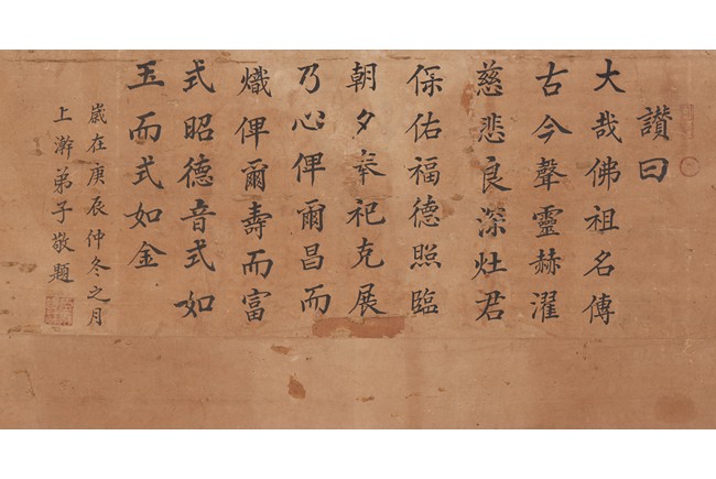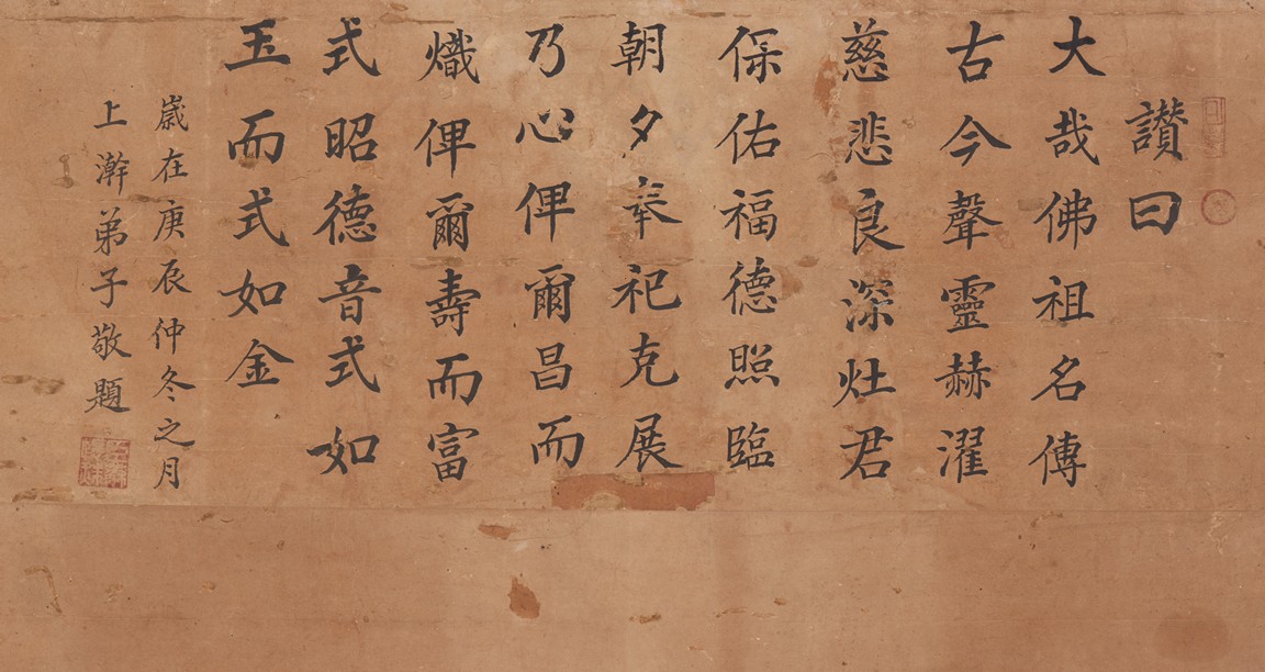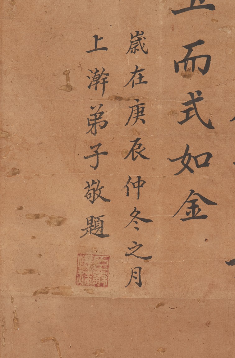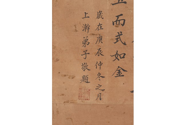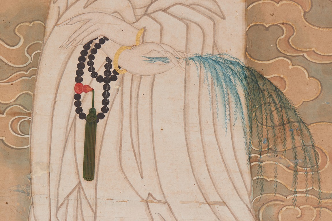 焦秉貞(焦秉貞,清代宮廷畫家。生卒年不詳,字爾正,山東濟寧人,康熙時官欽天監五官正,供奉內廷。擅畫人物,吸收西洋畫法)觀音身披天衣,面容和藹可親。有童子雙手合十立於身旁,拱手對觀音做揖。全畫墨色醇老,意趣清雅,風姿灑脫又飄逸嫻雅。菩薩在畫家筆下超凡入聖,端莊凝重,氣態渾然天成。