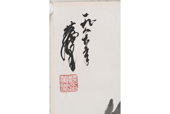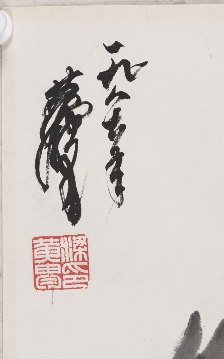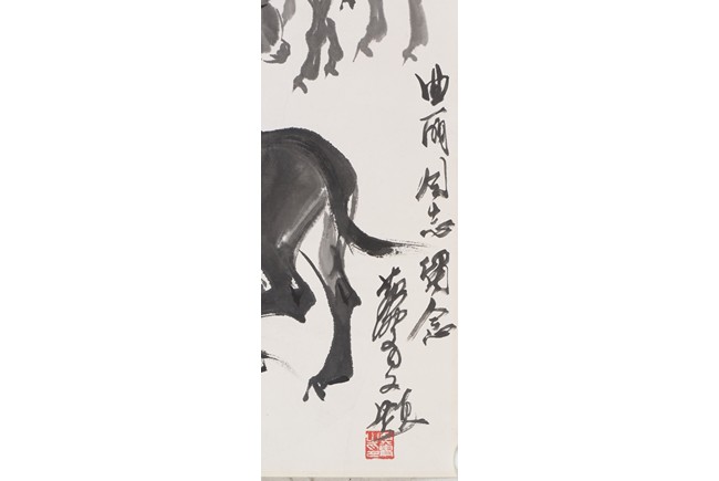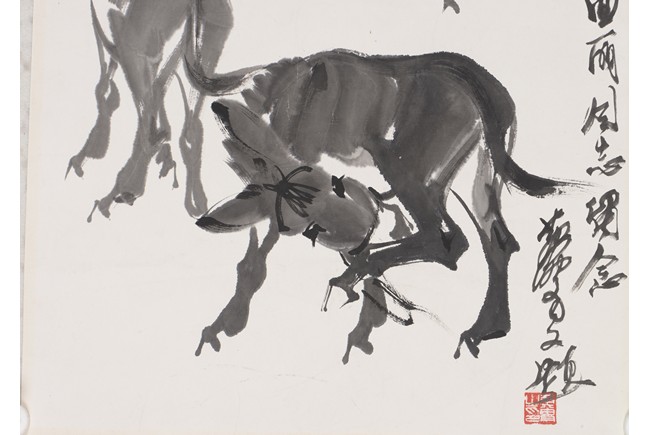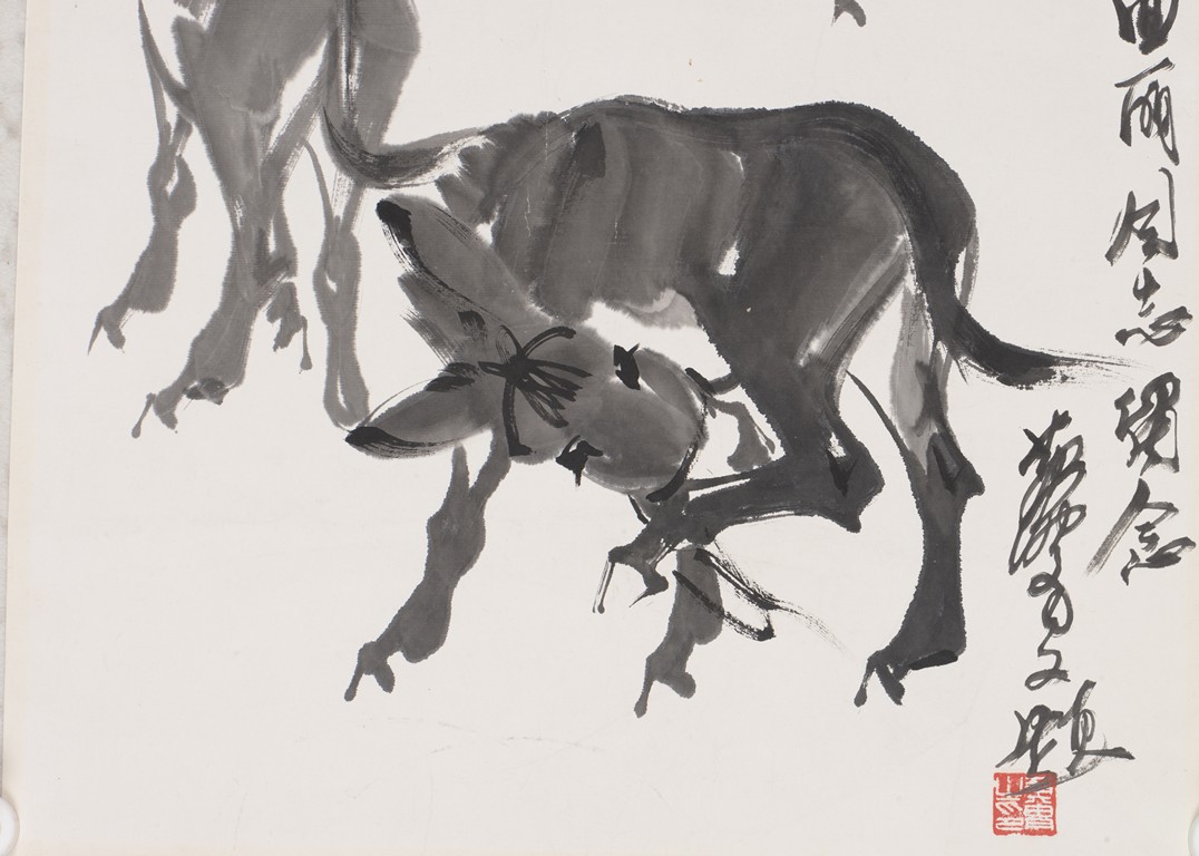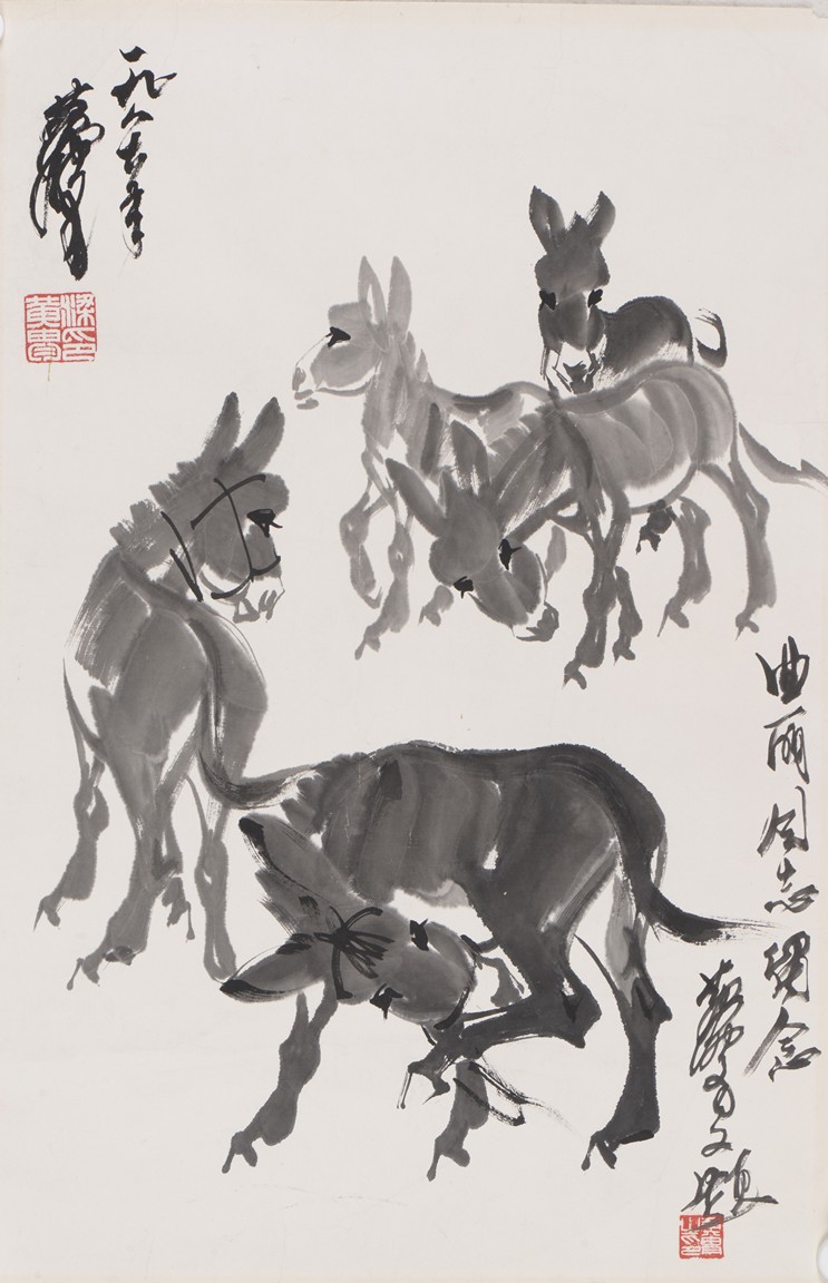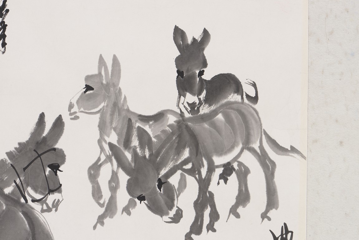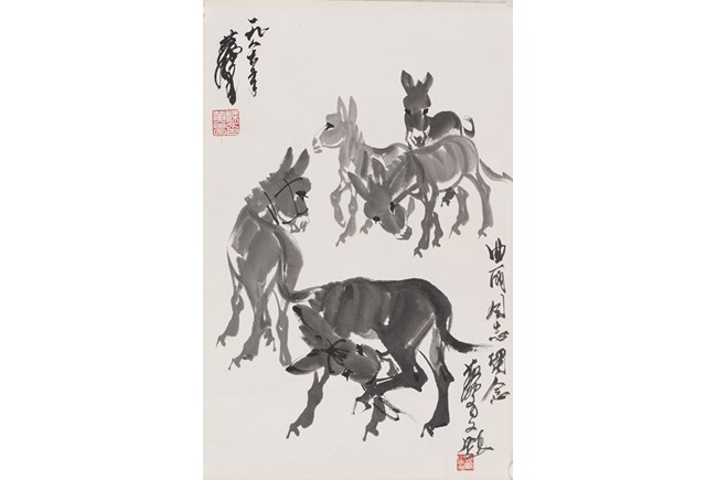 Ink on paper. Donkey. Unframed. Signed Huang Zhou and with inscription, with two seals of the artist.