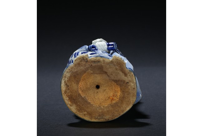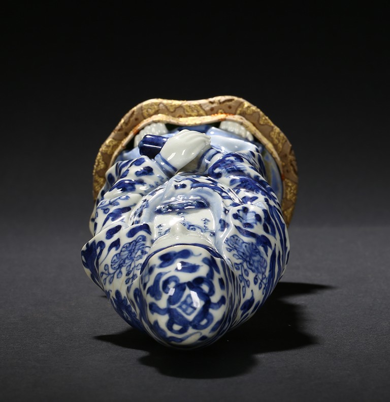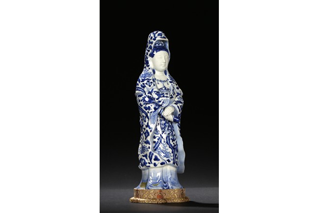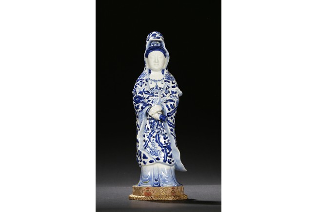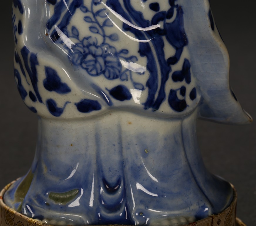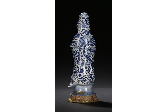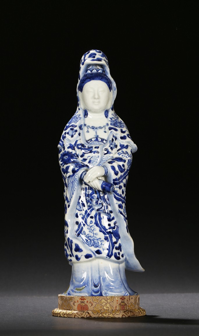 此觀音立像以青花瓷塑造,觀音儀態端莊,手持凈瓶,頭披布幔,身著長袍,袖擺似隨風飄逸,周身以青花裝飾,各式花卉密布。青花色澤純正雅靚,衣褶刻畫流暢,極具藝術感染力。