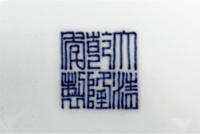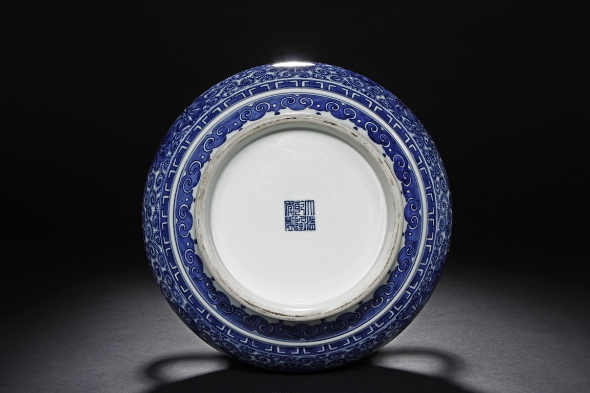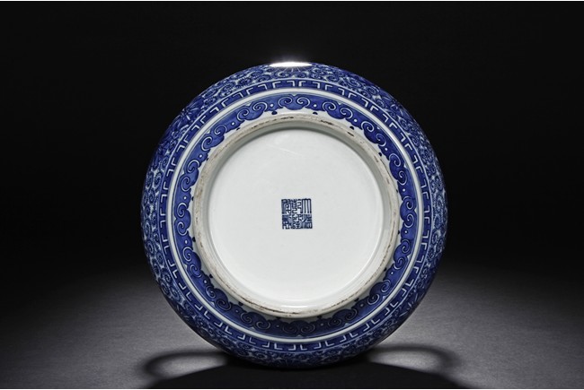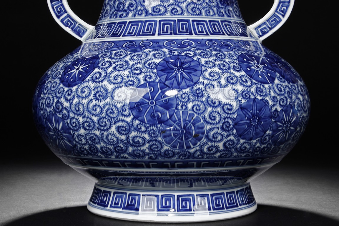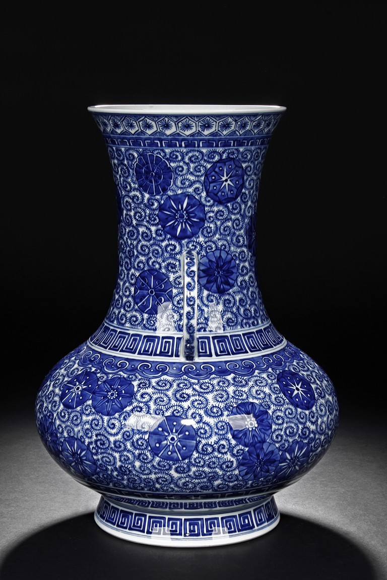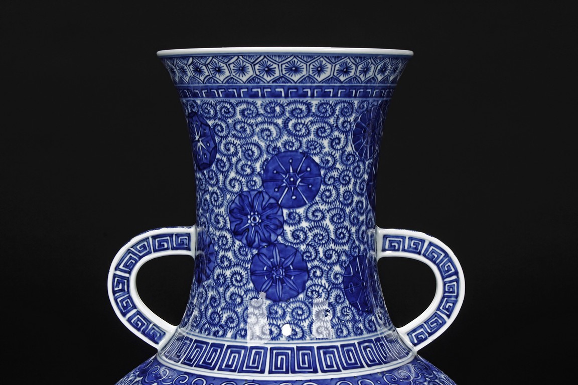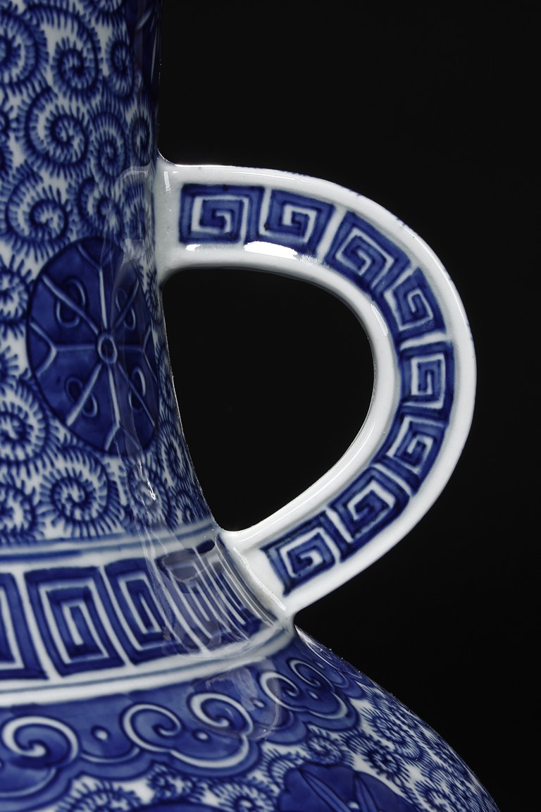 The body of flattened ovoid form, with waisted but still wide neck, with flared rim and splayed ring foot, the body decorated with flowers and vines patterns, the handle, shoulder, and foot decorated with key-fret patterns, the bottom bears six character 'DAQING QIANLONG NIANZHI' mark.