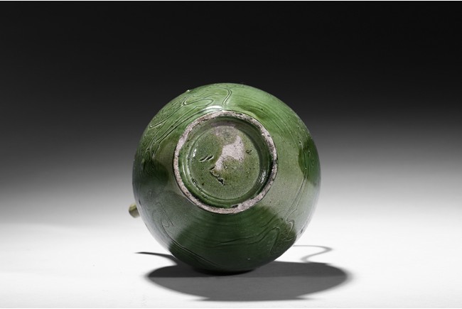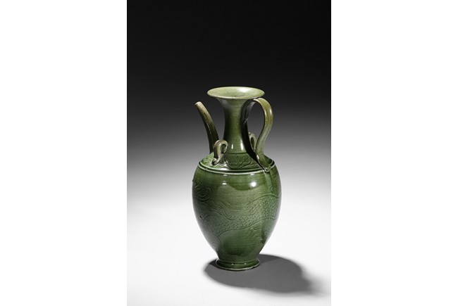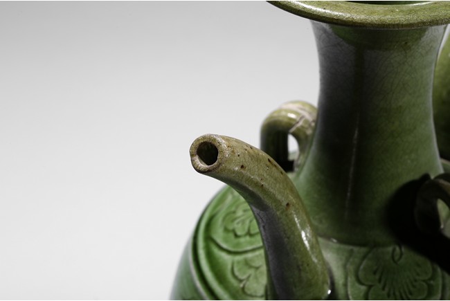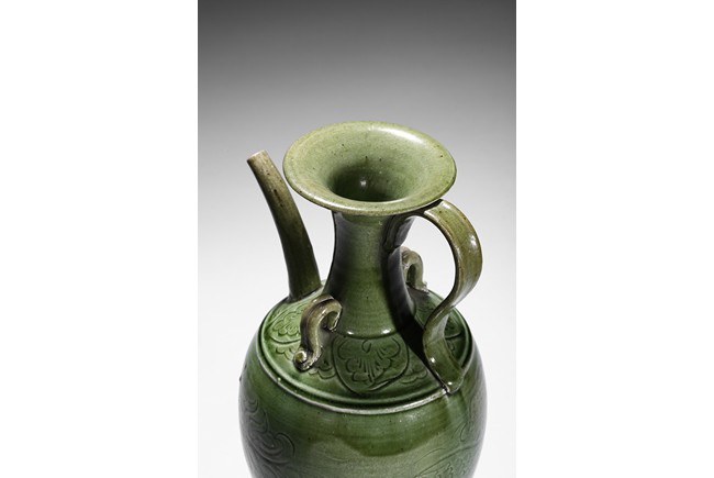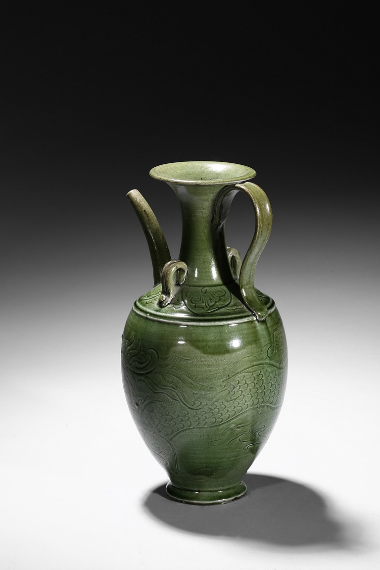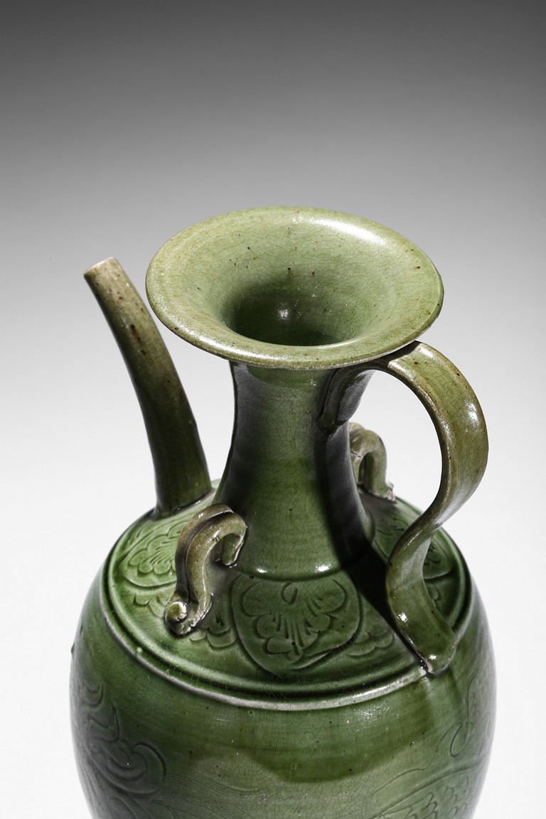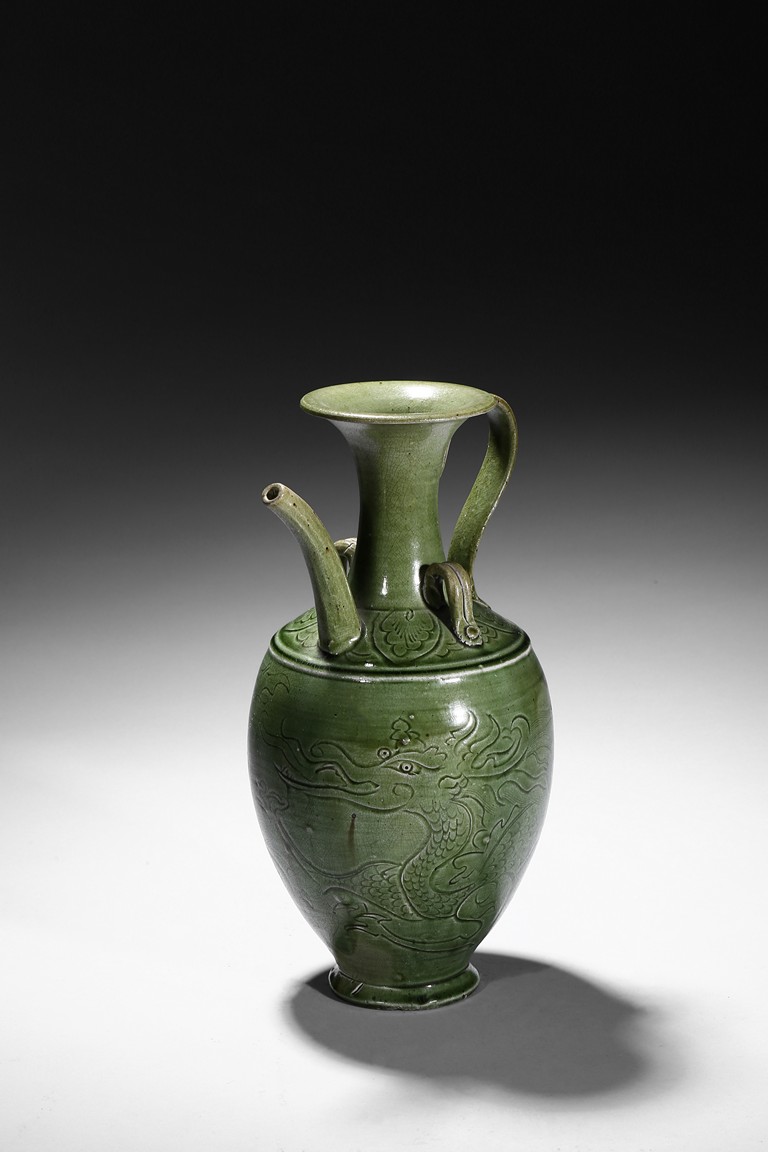 Supported on spreading foot, the body finely incised with dragon pattern, shoulders set with a loop handle opposite a curved spout and flanked by two small strap loops, the long waisted neck rising to an everted rim, overall suffused in green glazed. Ming Dynasty period.