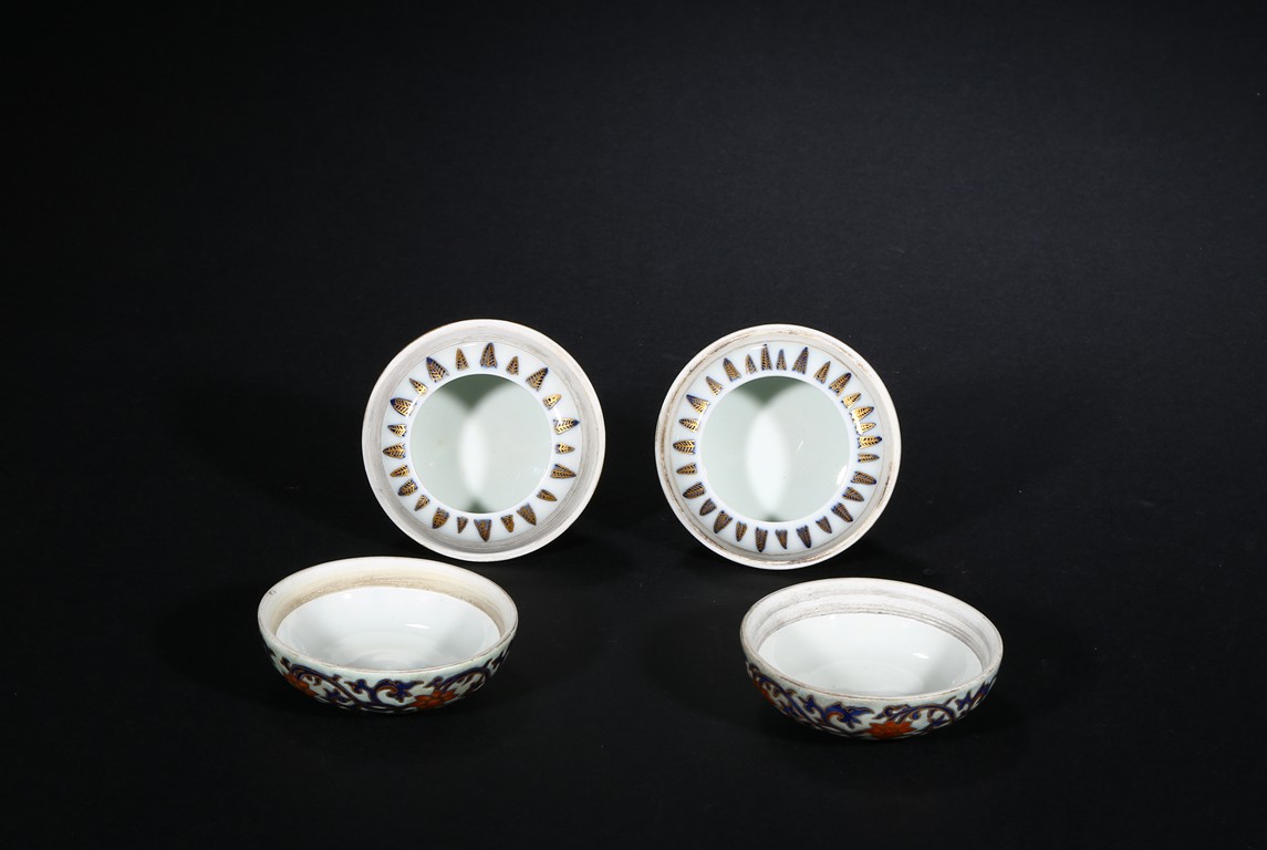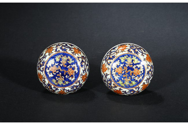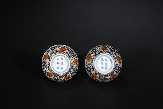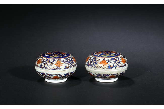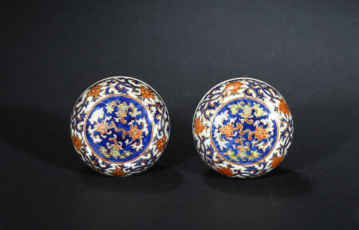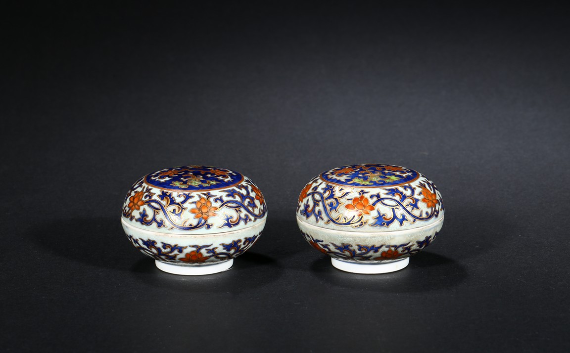 Each of compressed globular form, painted with scrolled floral pattern, base with apocryphal mark. Republic period.