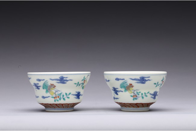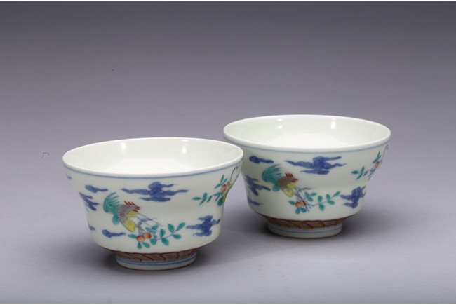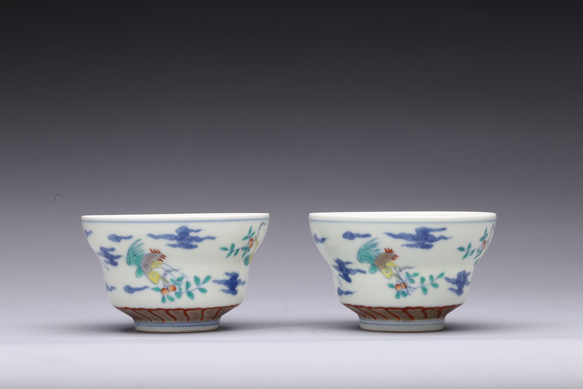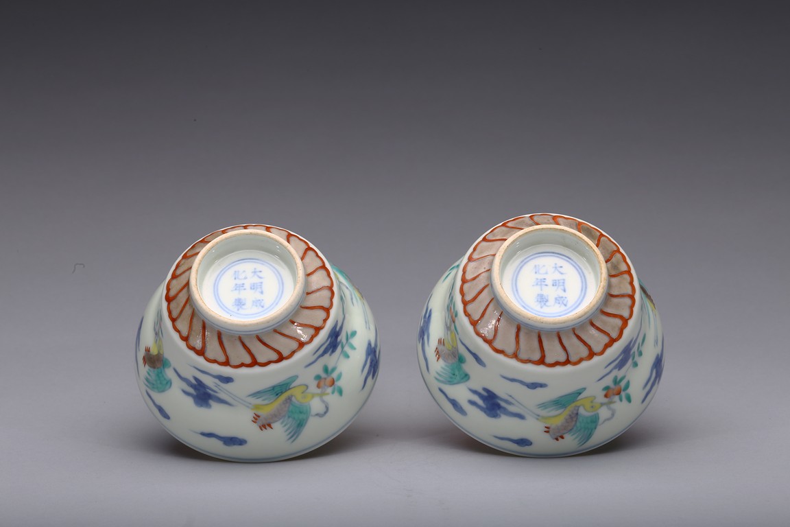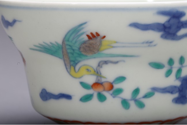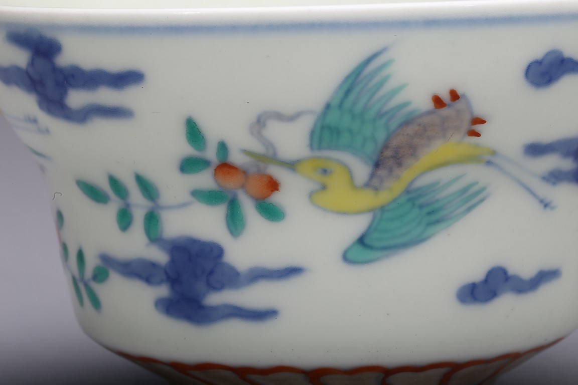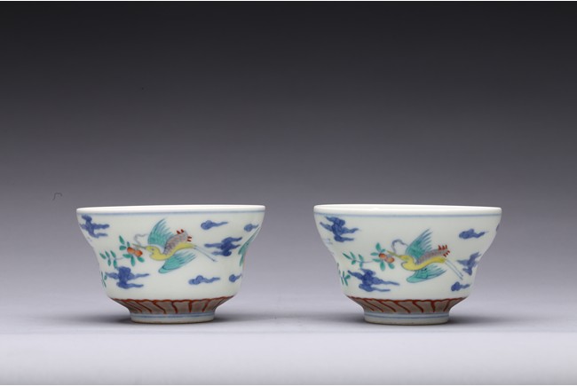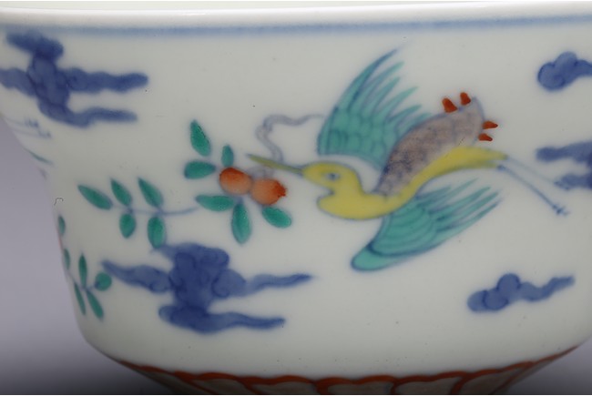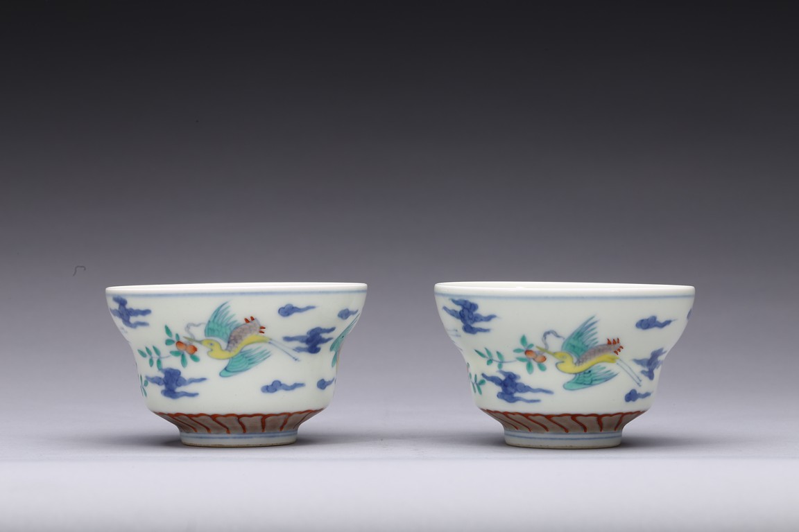 Each painted to the exterior with cranes in flight grasping peach sprig amidst clouds, base with apocryphal Chenghua mark. Qing Dynasty period.