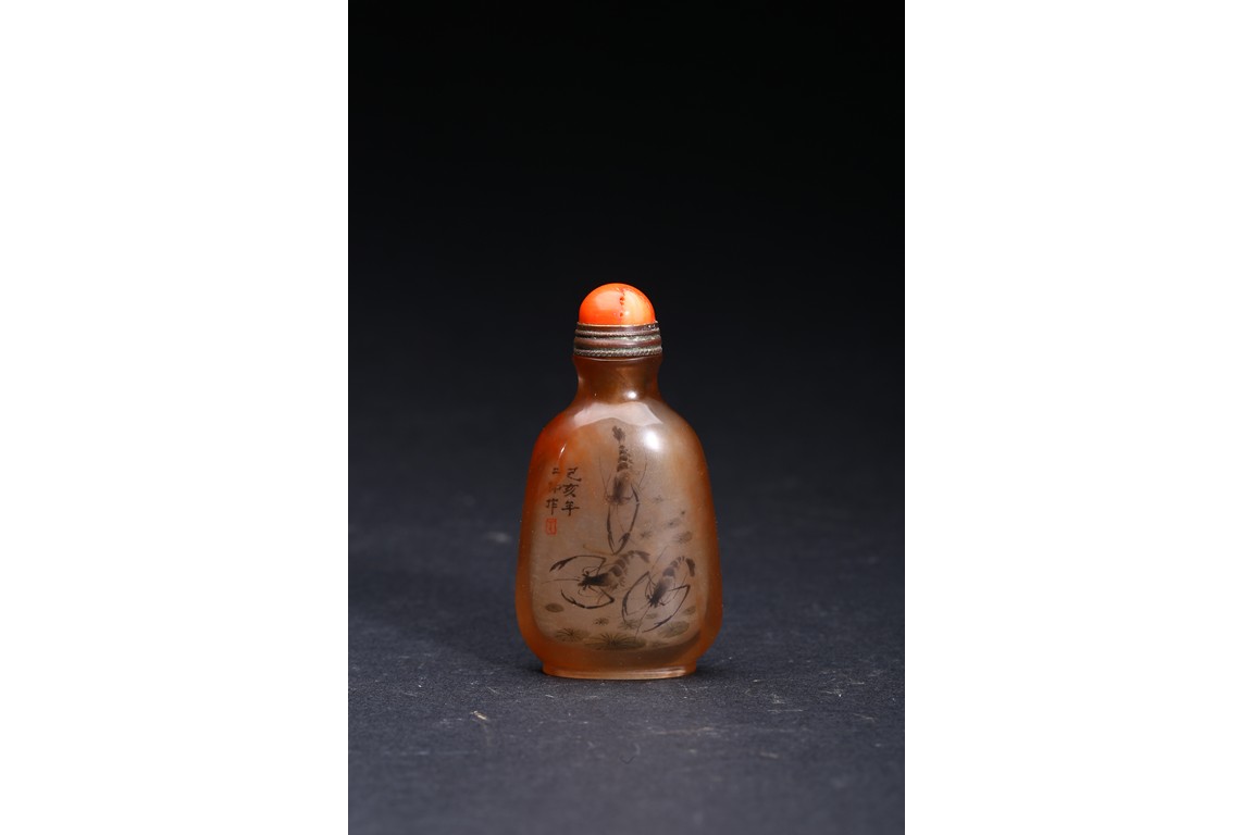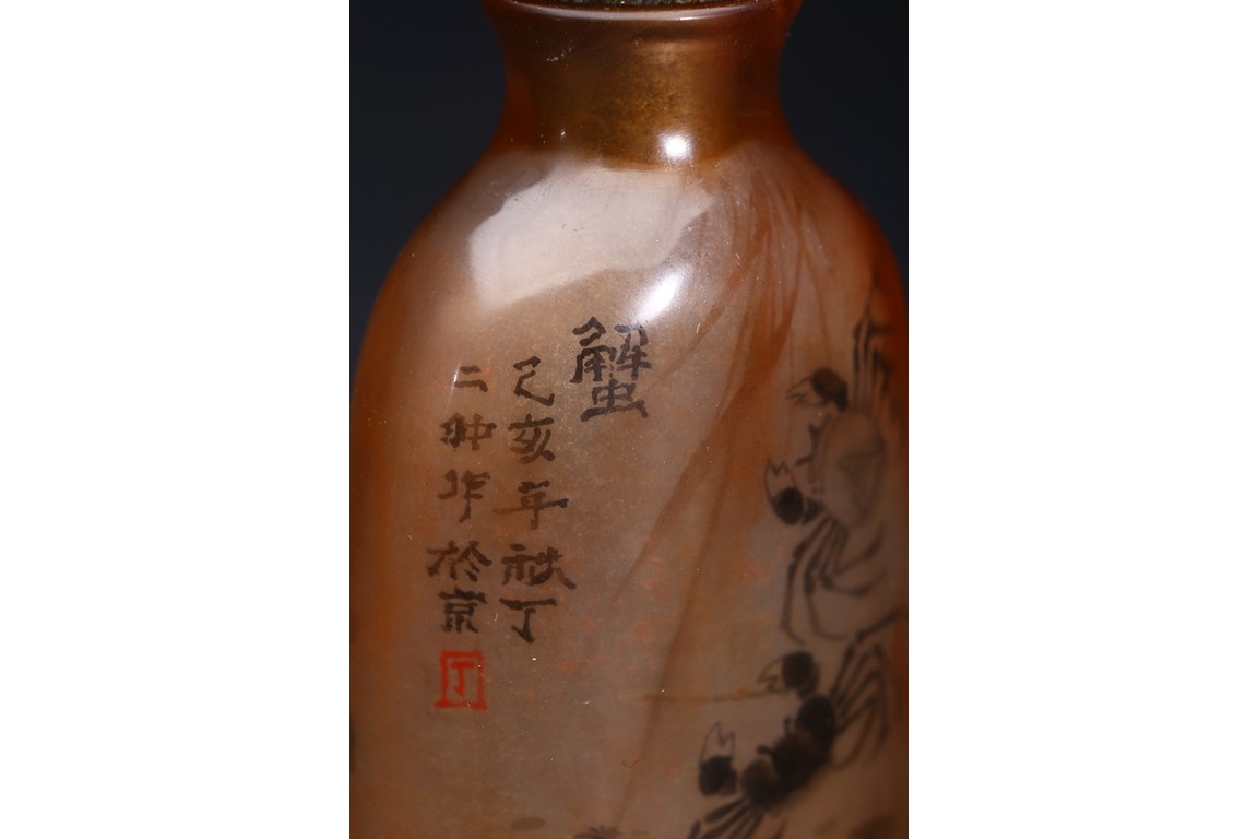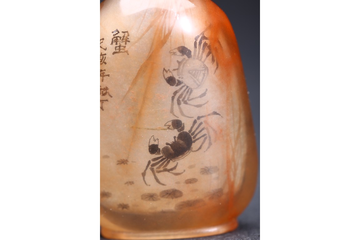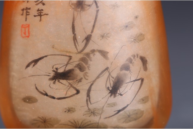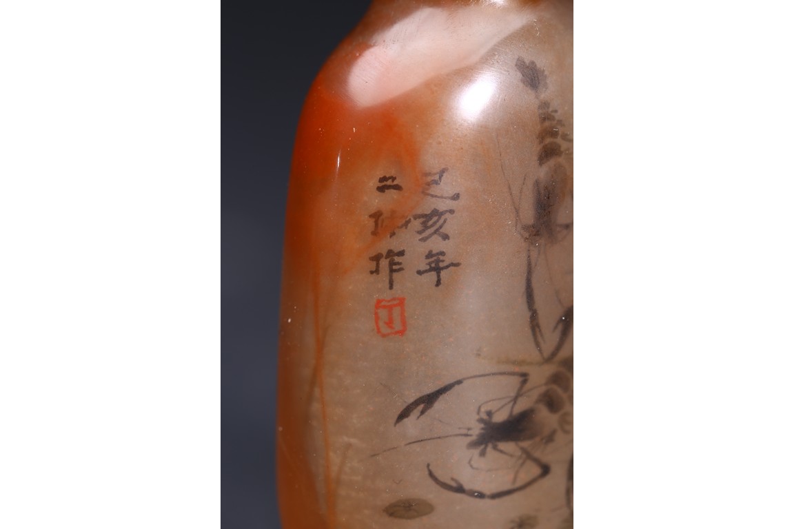AN INSIDE-PAINTED GLASS SNUFF BOTTLE 丁二仲 內畫蝦蟹鼻煙壺