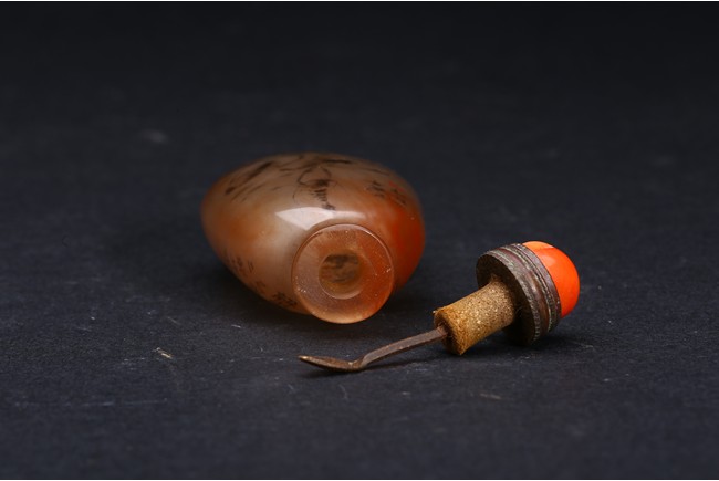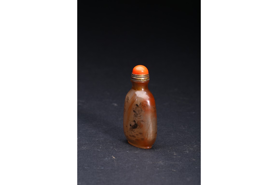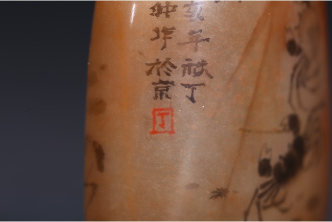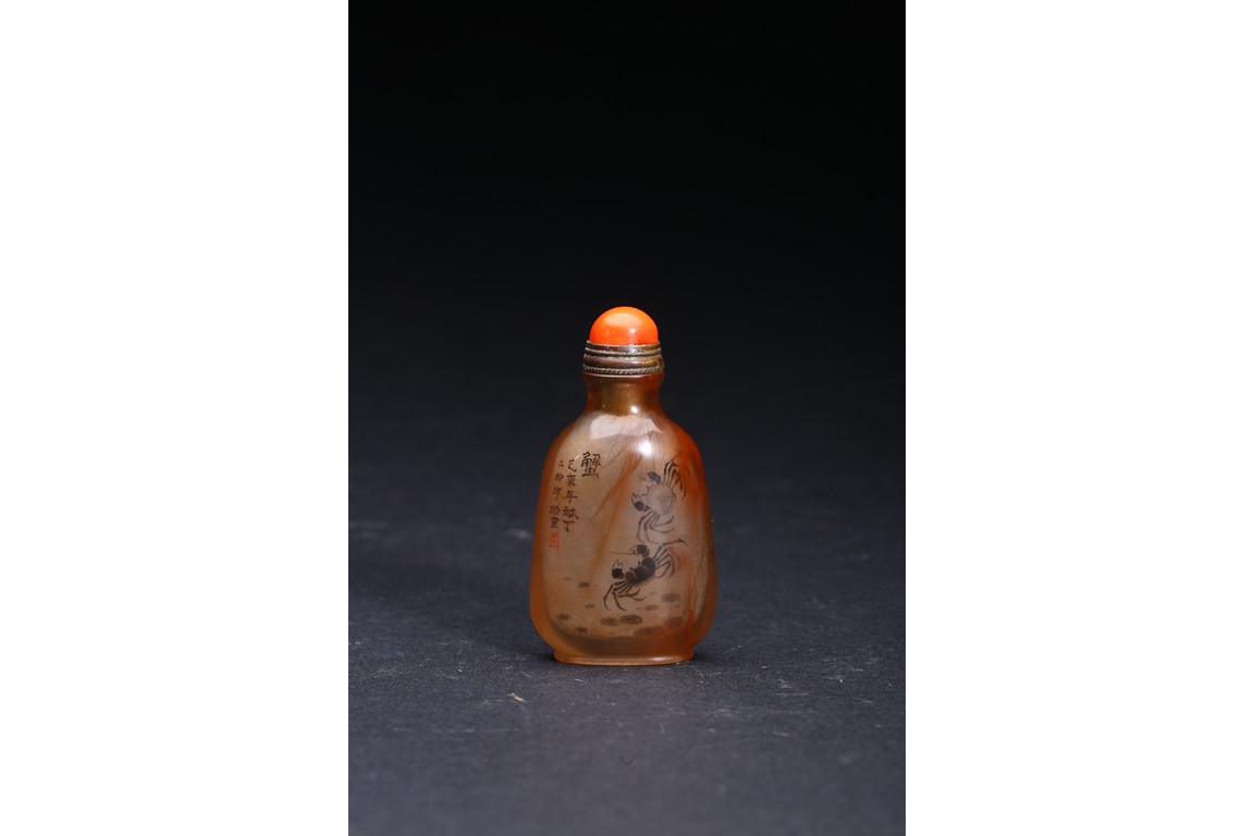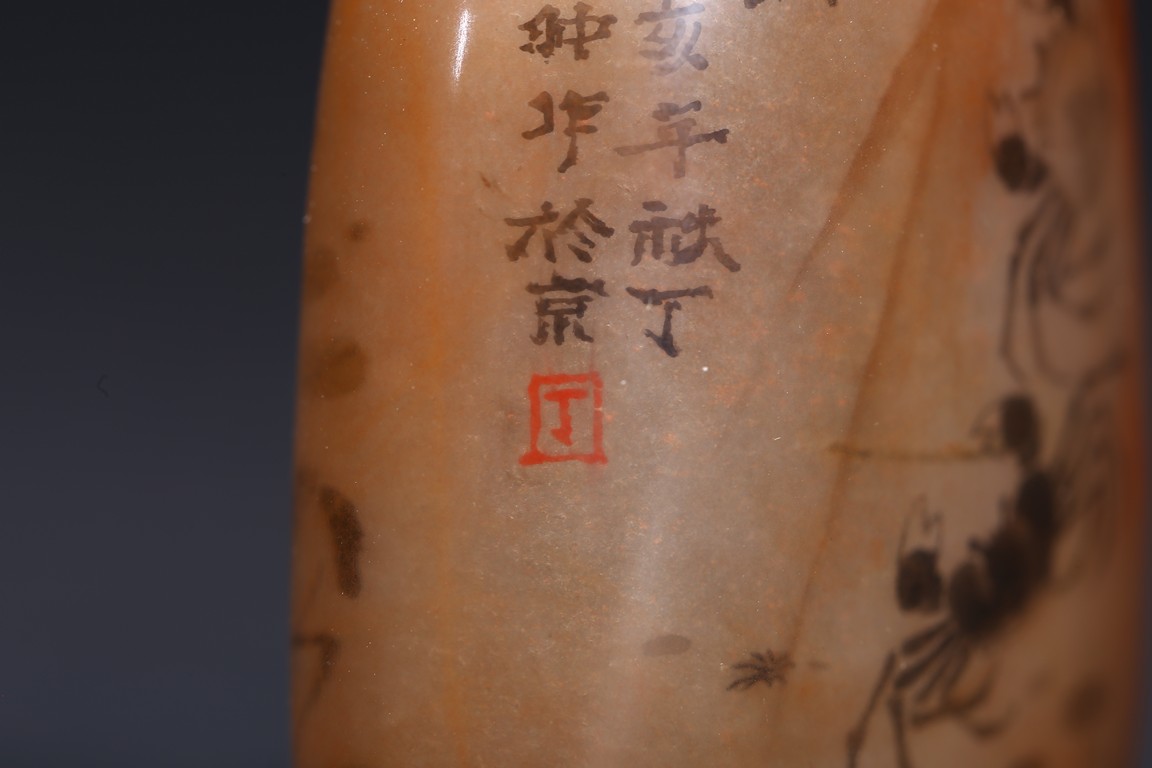 AN INSIDE-PAINTED GLASS SNUFF BOTTLE 丁二仲 內畫蝦蟹鼻煙壺