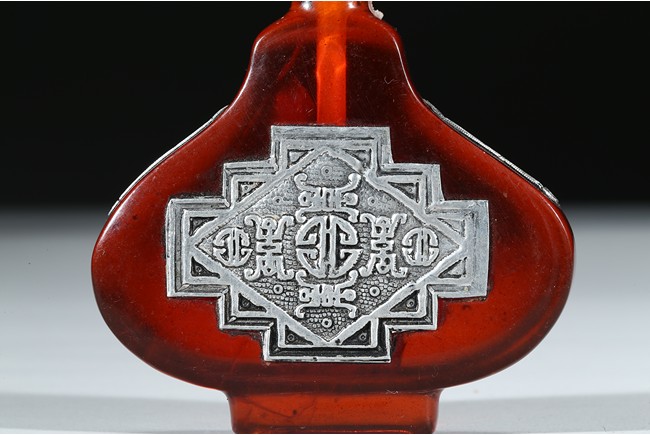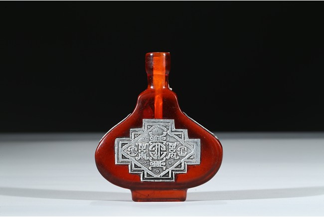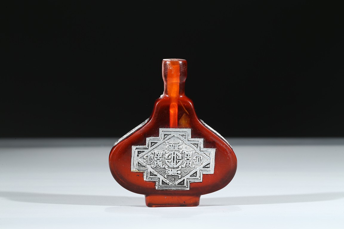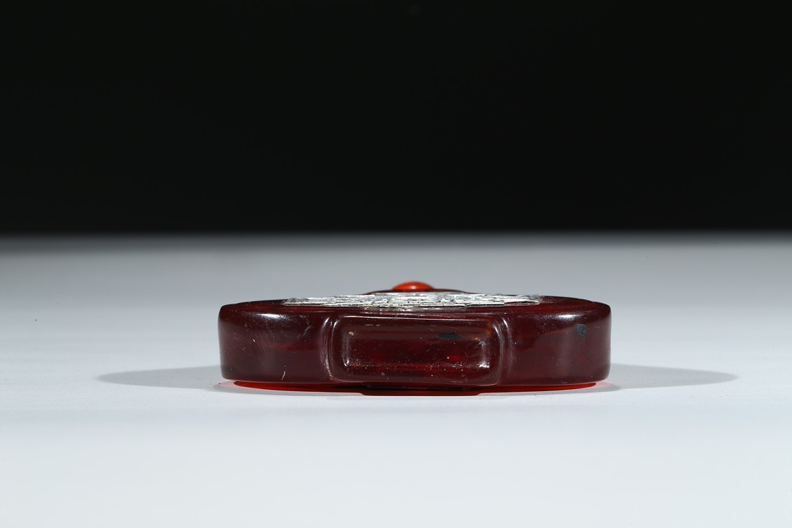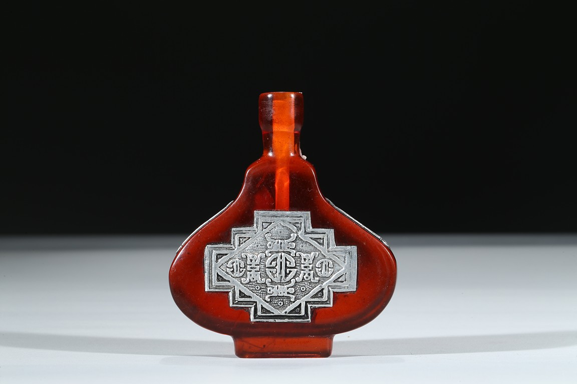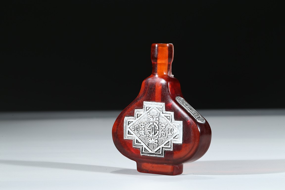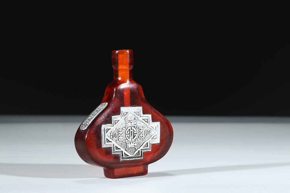 The red glass snuff bottle inlaid with silver decorations to front and reverse.