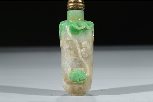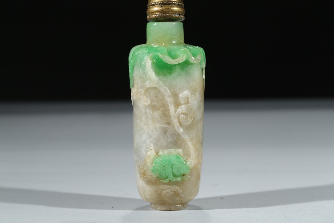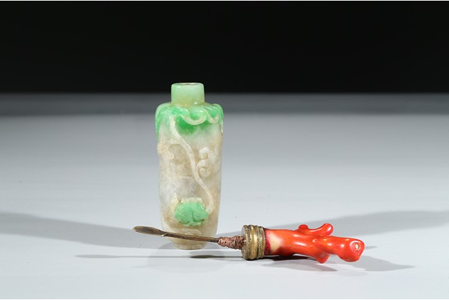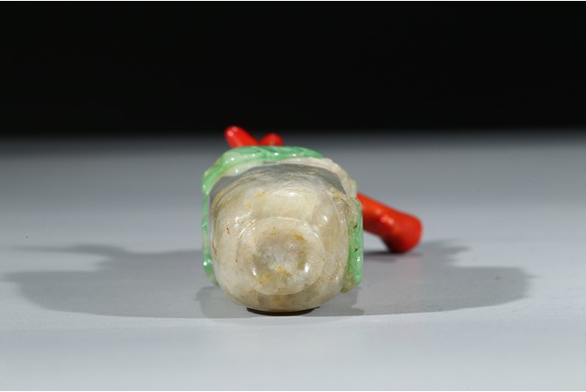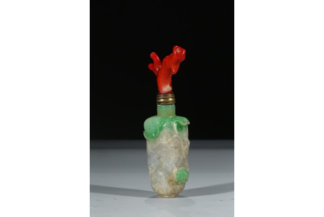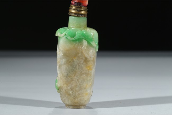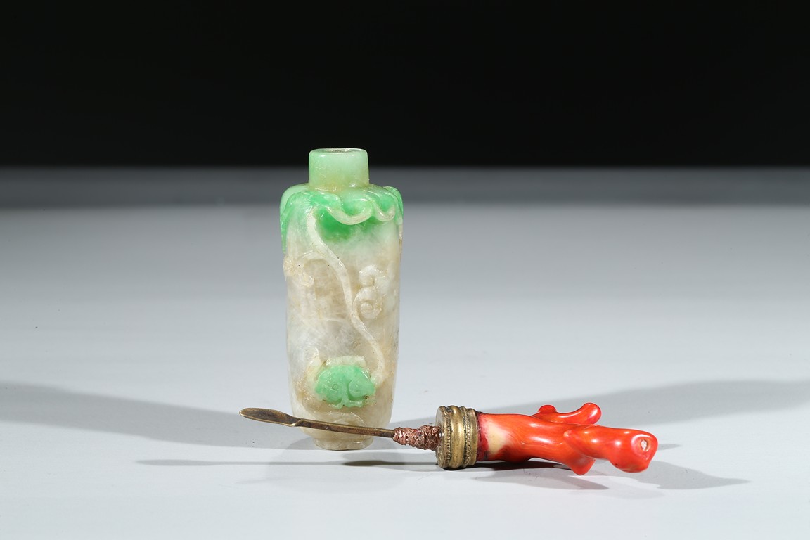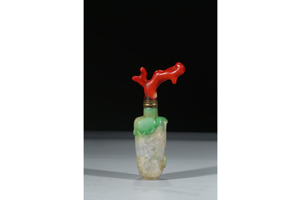 A CARVED JADEITE SNUFF BOTTLE 清 翡翠雕鼻煙壺 配原裝珊瑚蓋