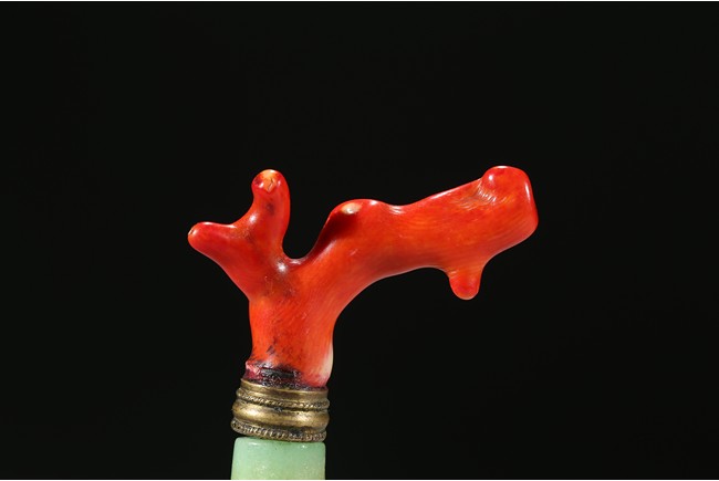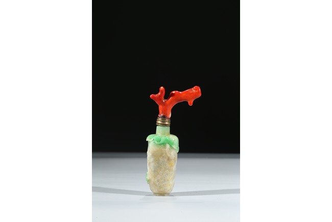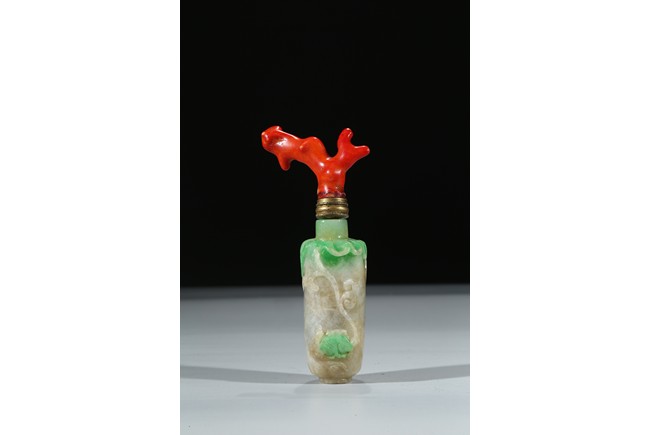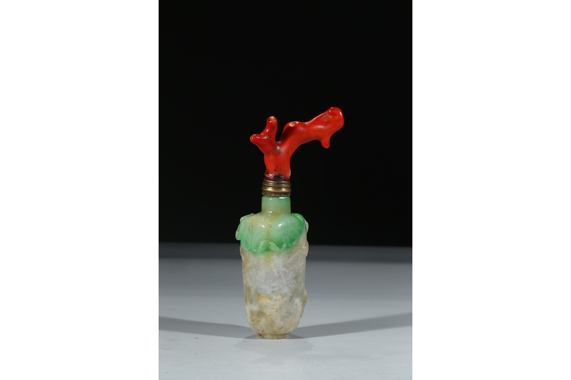 The green jadeite snuff bottle with a natural red coral cover. Qing Dynasty period.