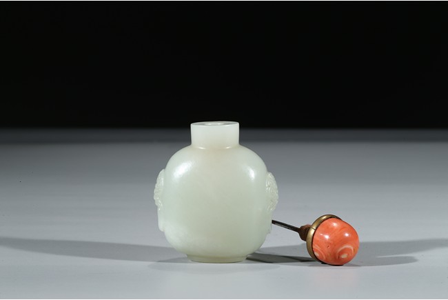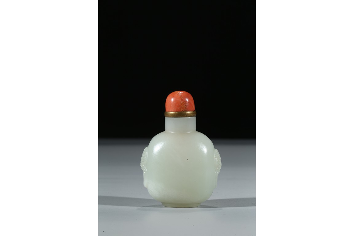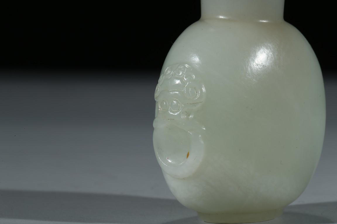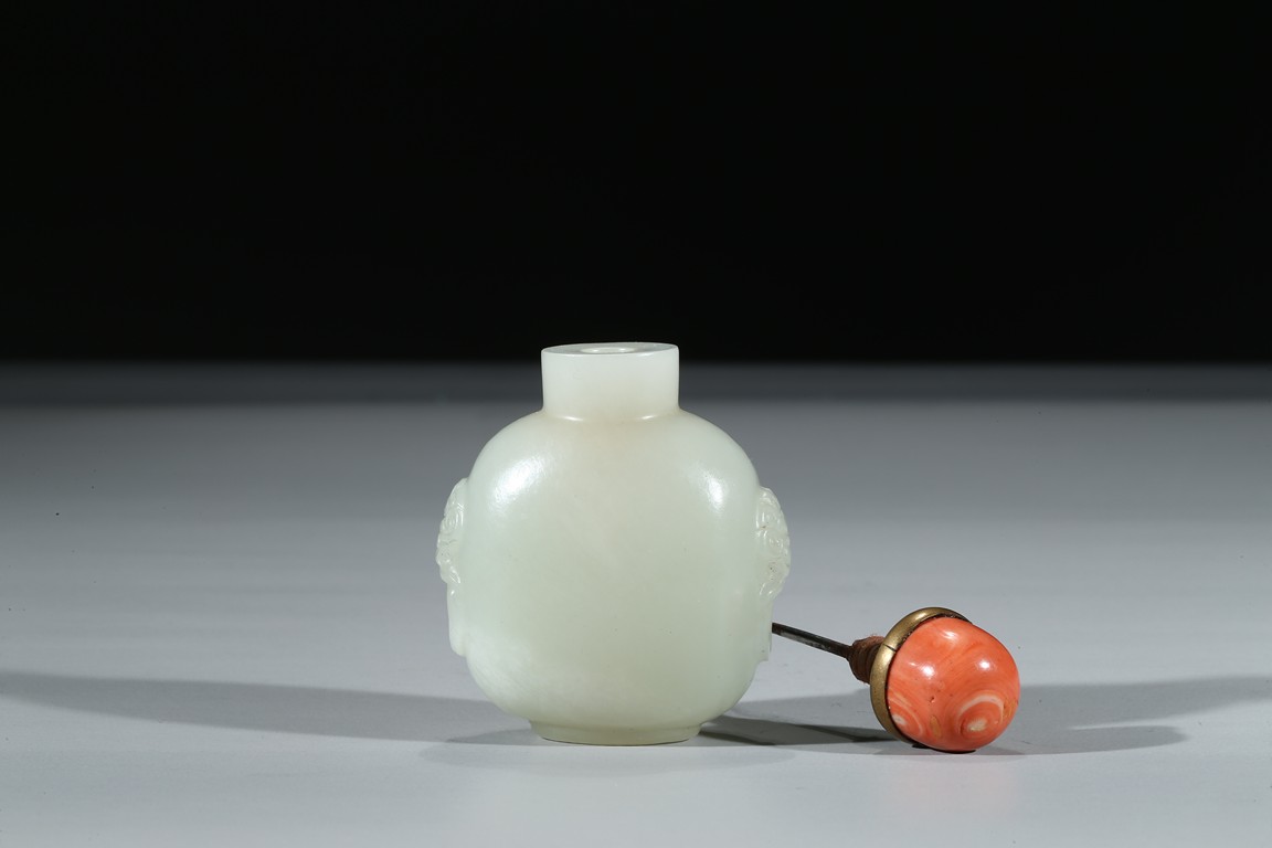 The white jade snuff bottle moulded with two raised lion handles. Qing Dynasty period.