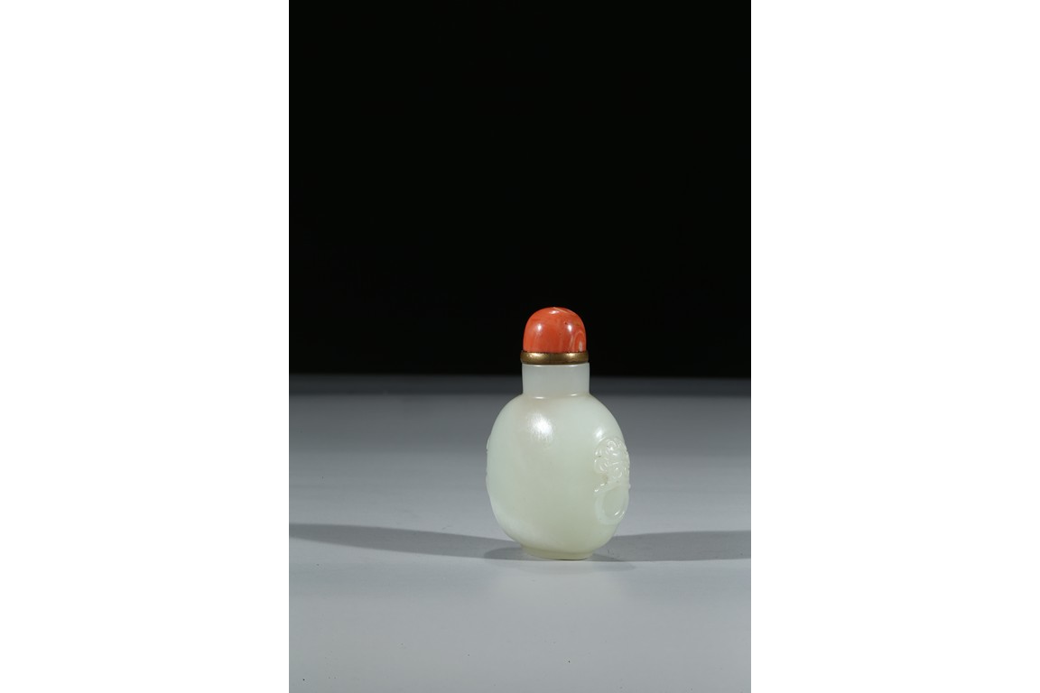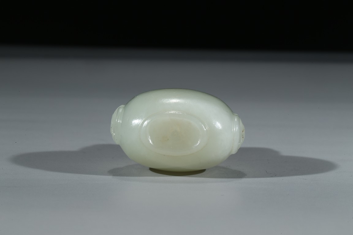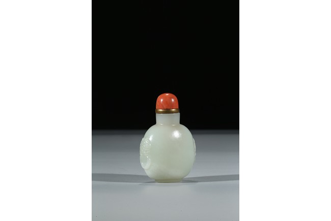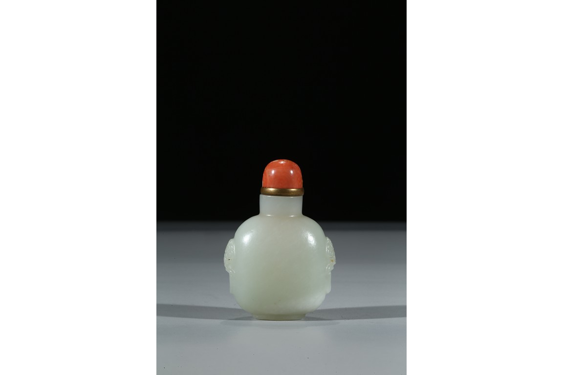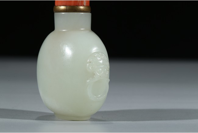 The white jade snuff bottle moulded with two raised lion handles. Qing Dynasty period.