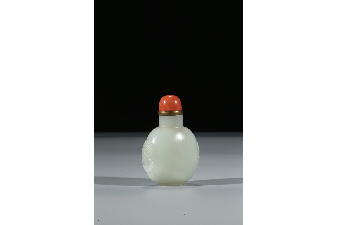 A CARVED WHITE JADE SNUFF BOTTLE 清 白玉鼻煙壺