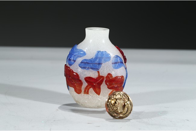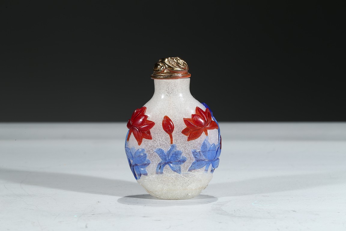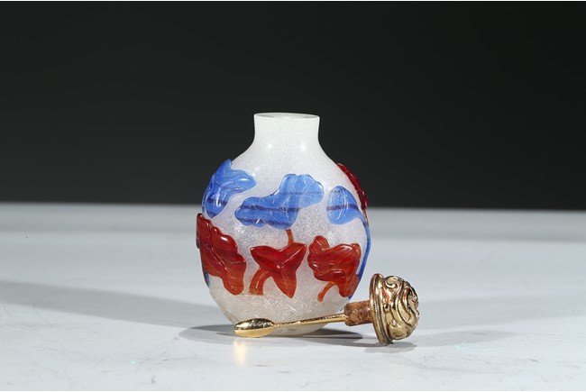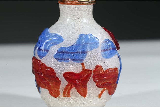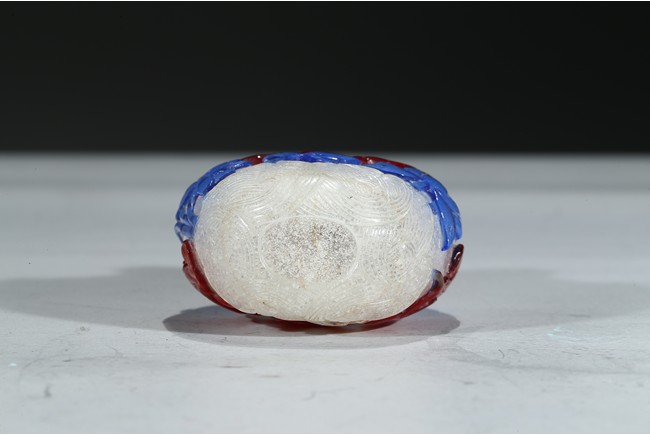 Of ovoid form, carved through the blue and red layers to the front and back face with lotus leaves.Qing Dynasty period.