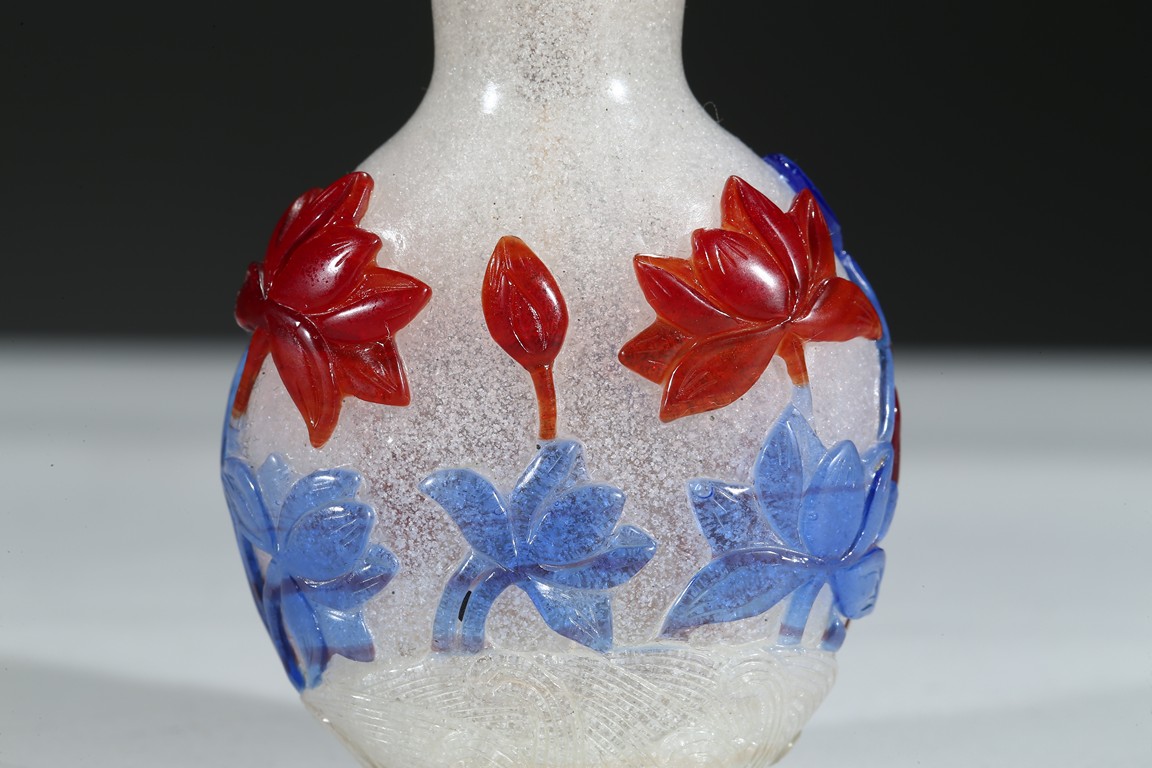此壺兼套雙彩,工藝繁複,壺身呈扁瓶形,底子勻淨,於唾沫地上套紅,藍雙色料。別有雅趣地雕琢荷花圖,工整樸拙。整壺顏色搭配協調,濃淡相宜,獨具古雅之氣。