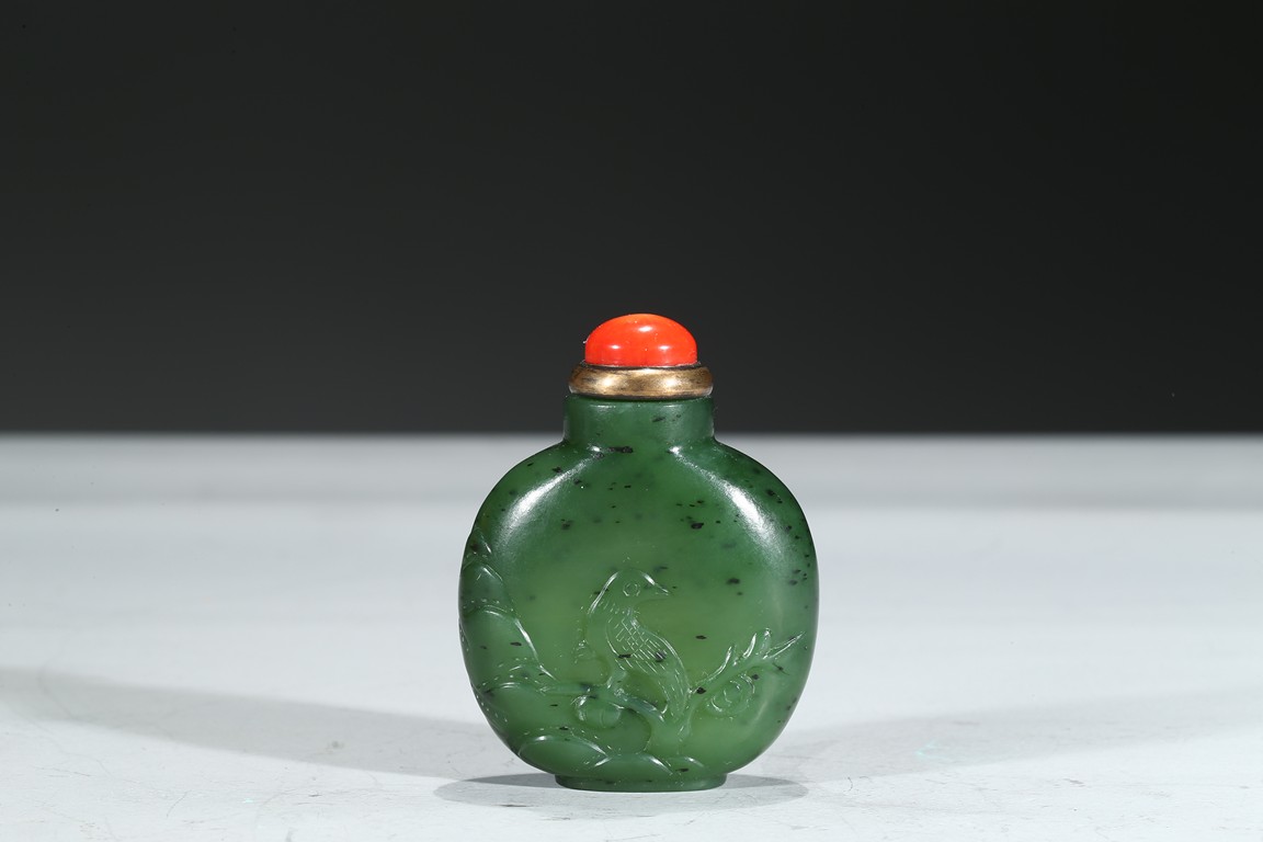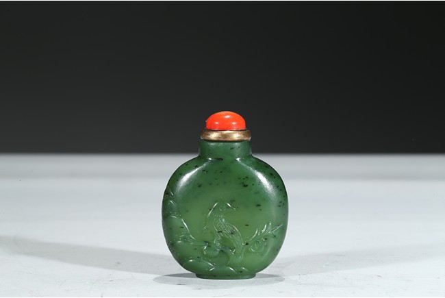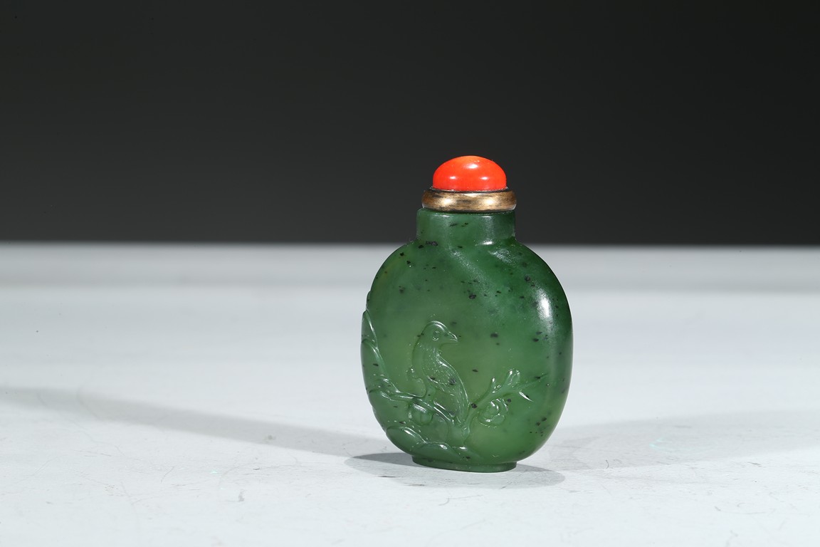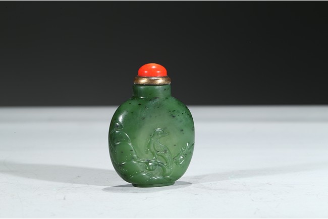 Carved with a magpie perching on a branch, with a red coral cover. Qing Dynasty period.