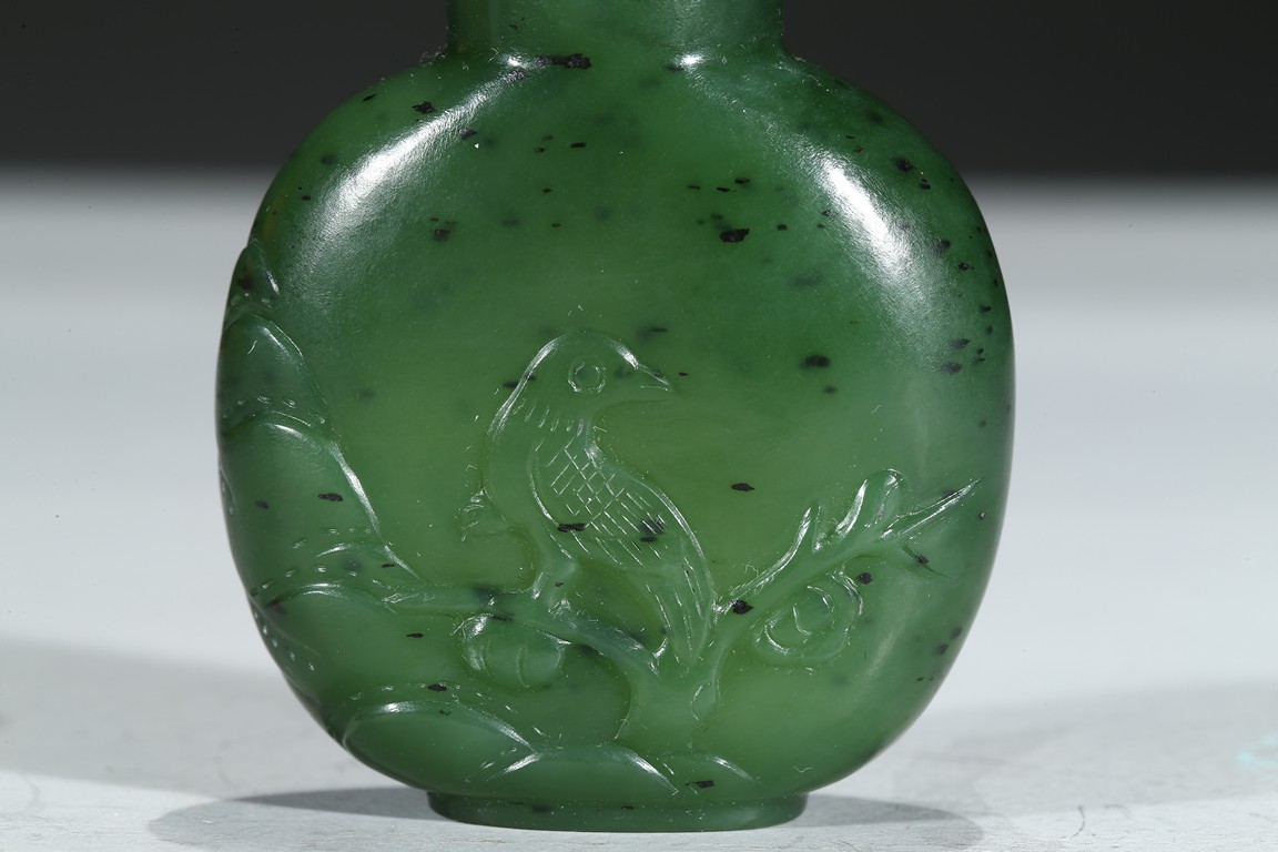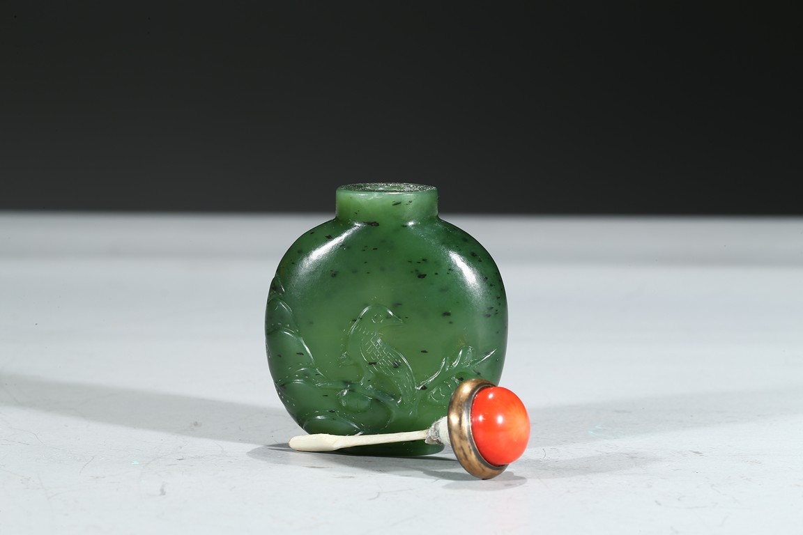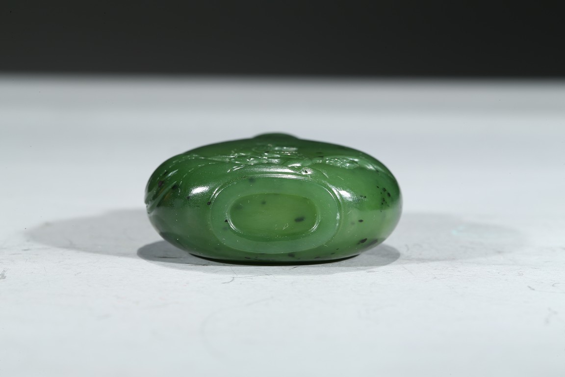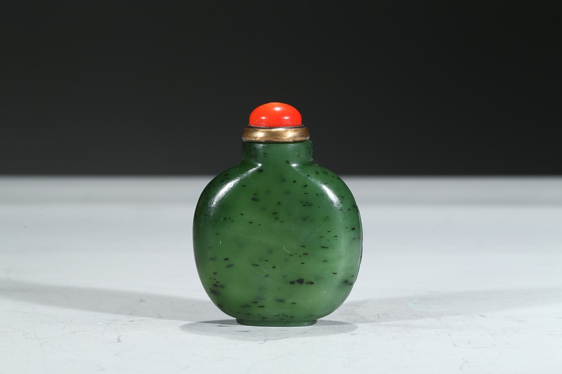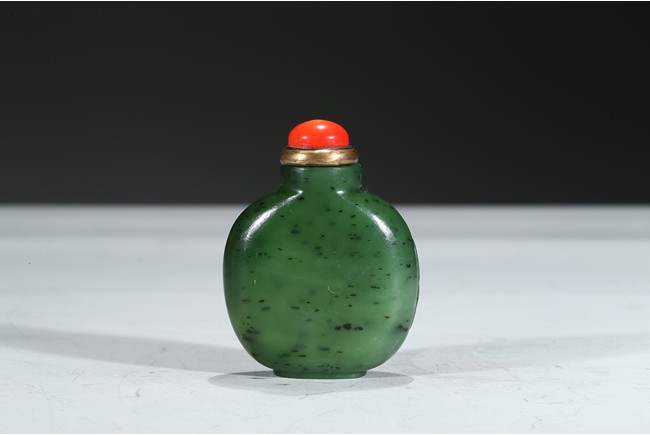此壺瓶型,圓口,直頸,圓肩,橢圓形足底。整器以碧玉磨製,沉雅光澤,點以紅鈕,顯華貴之韻。觀之,壺身規矩可人,碧玉質地蘊絮如棉,柔美憐愛。