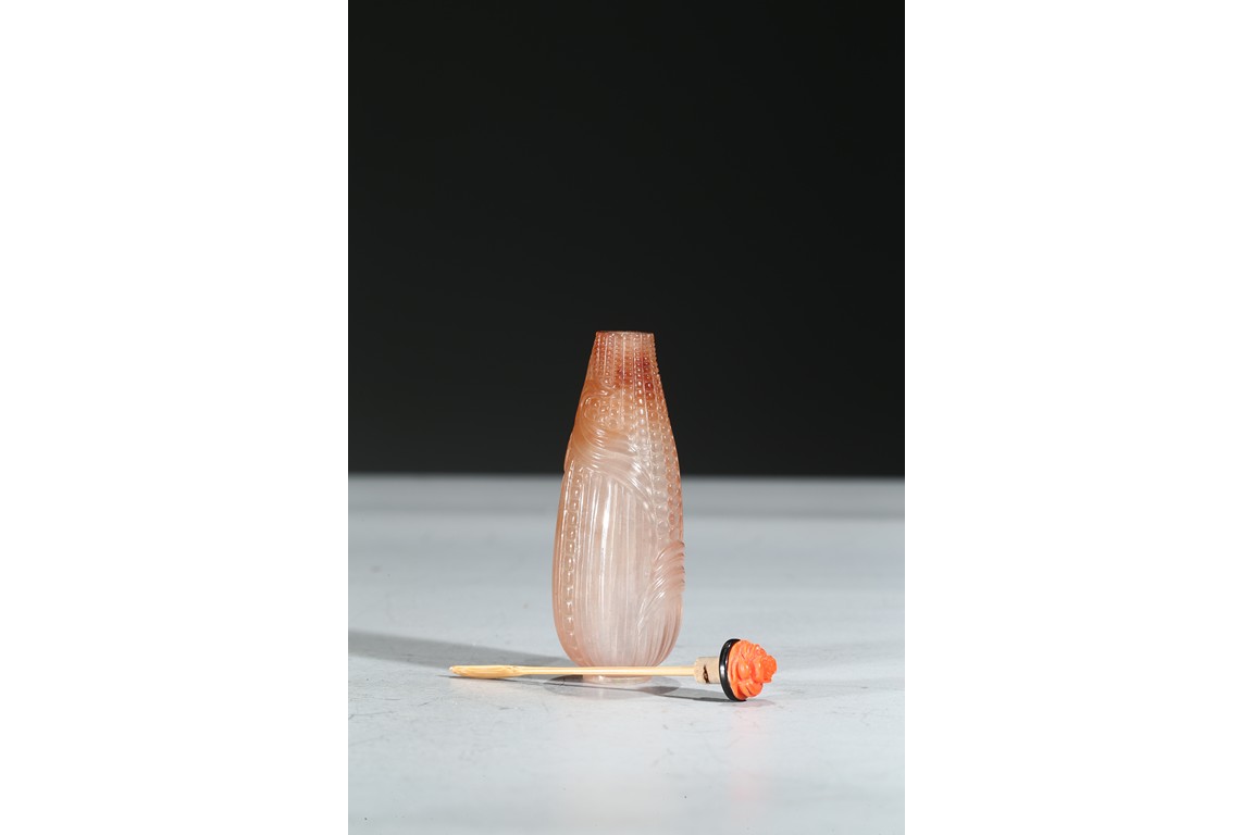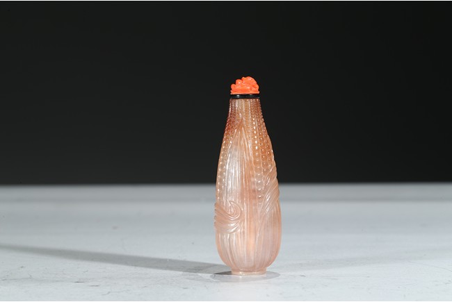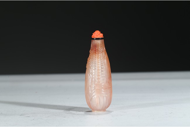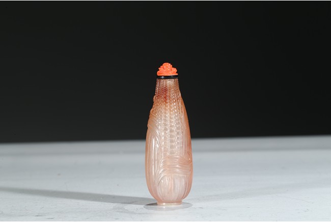 Modelled in the form of a corn wrapped with leaves, completed with a flower-form coral stopper. Qing Dynasty period.