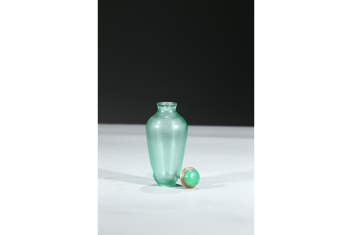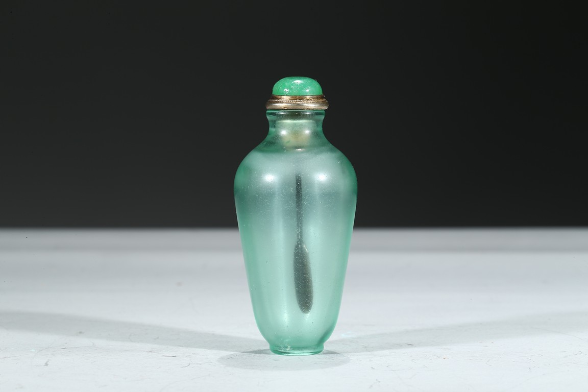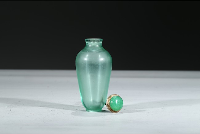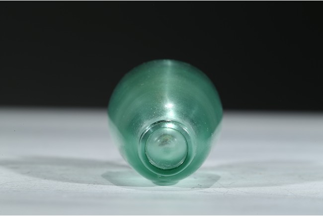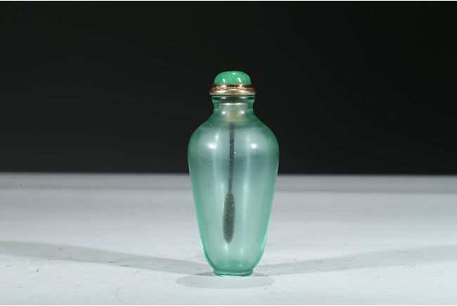 此件煙壺瓶形通體光素,圓口弧頸,壺身下斂,圈足。以藍玻璃為胎,色澤淡雅,心生平靜。器身光素,形制秀巧,古樸中現朝氣。