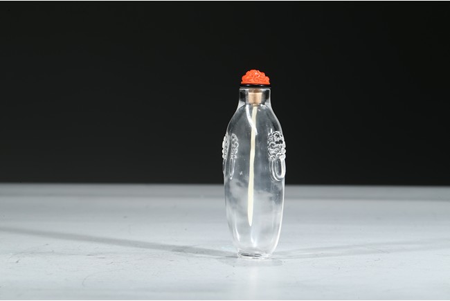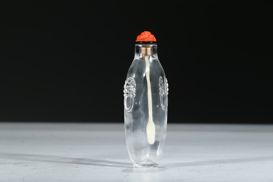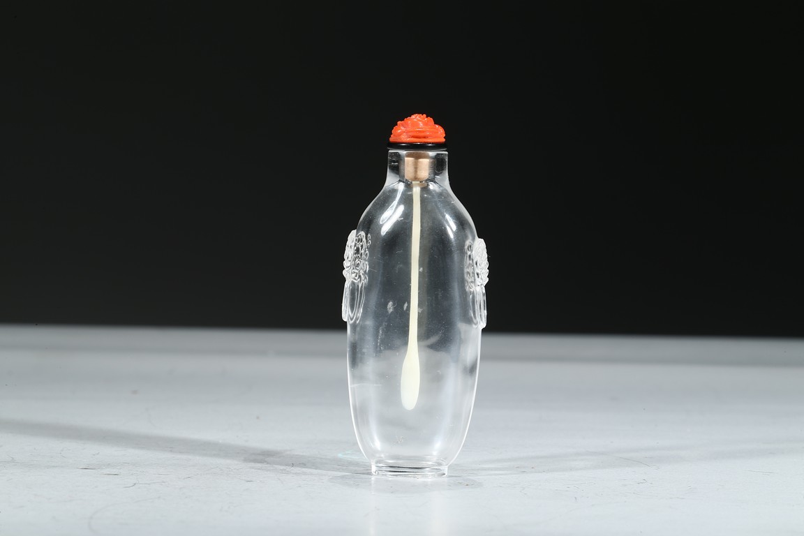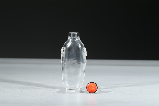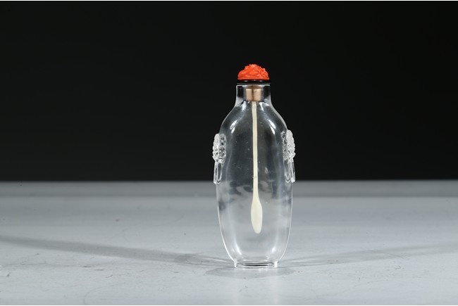The elongate transparent crystal snuff bottle carved with two beast head shape relief ears on both sides. Qing Dynasty period.