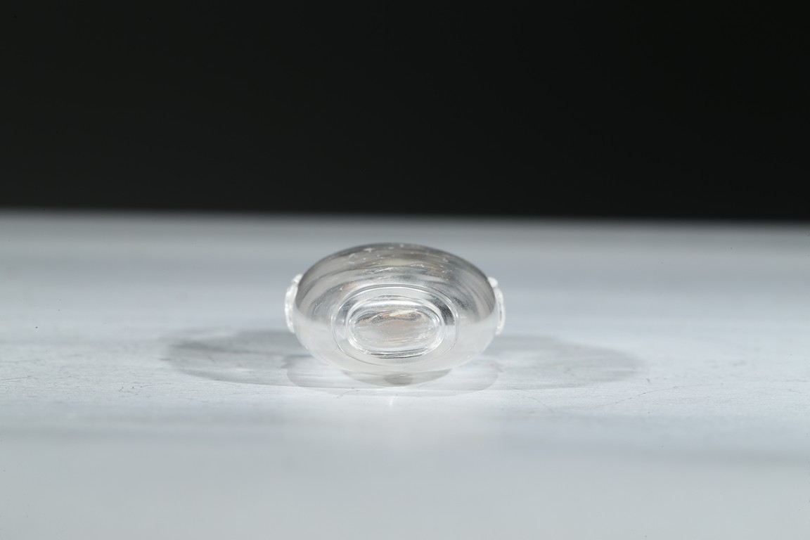 鼻煙壺瓶形,圓口,直頸,扁體,至下漸收,雙耳貼身,橢圓形凹足。通體天然水晶,碾磨精緻,光透瑩亮。整器壺形巧製,溫潤規整而端莊秀麗,盈握於手,歡喜至極。