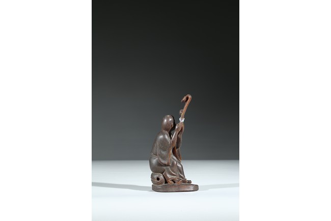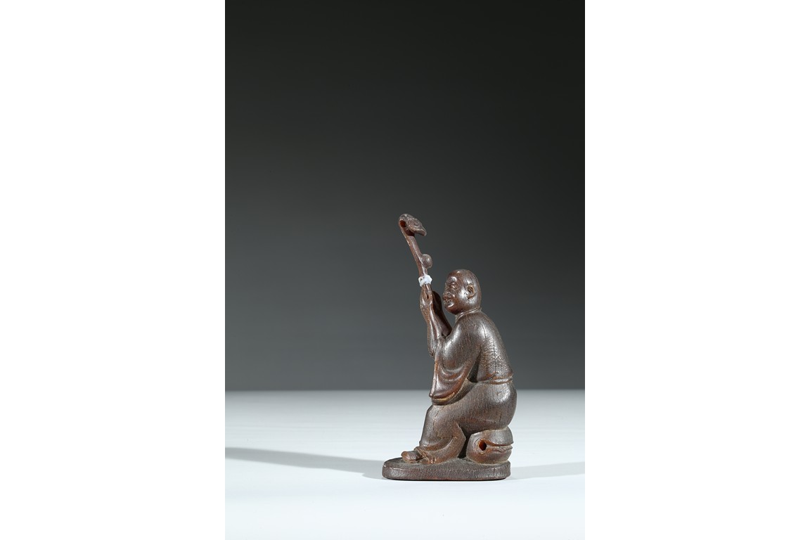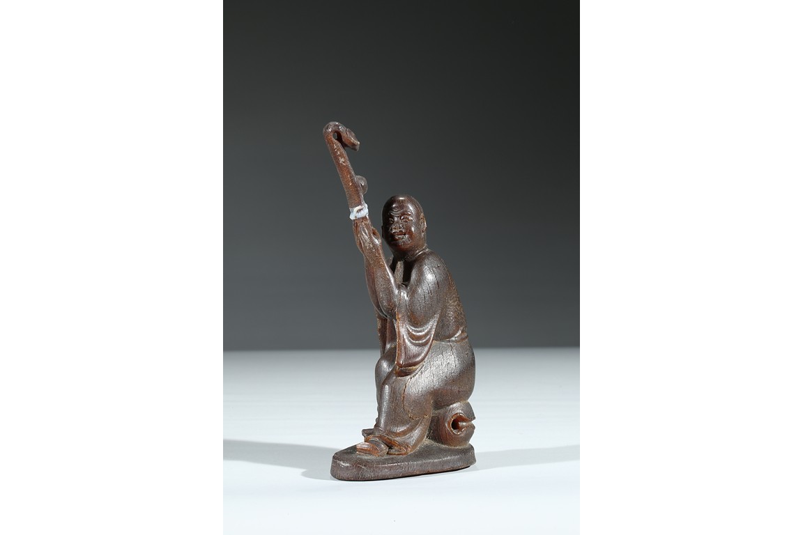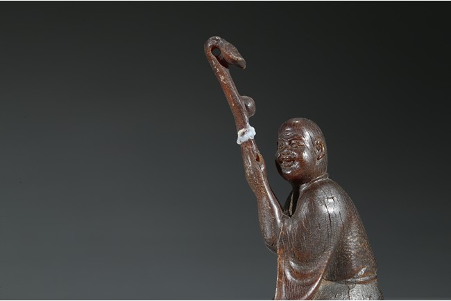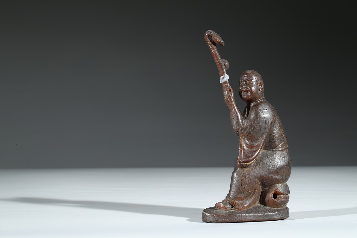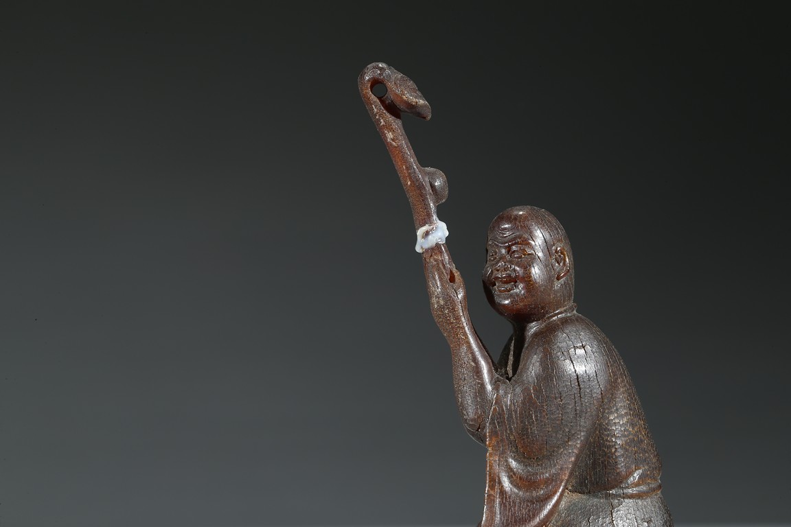 Carved with a monk sitting on a wood stand, with a smiling face, and a large ruyi scepter on hands. Qing Dynasty Period.
