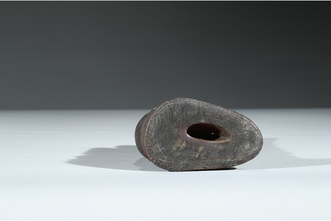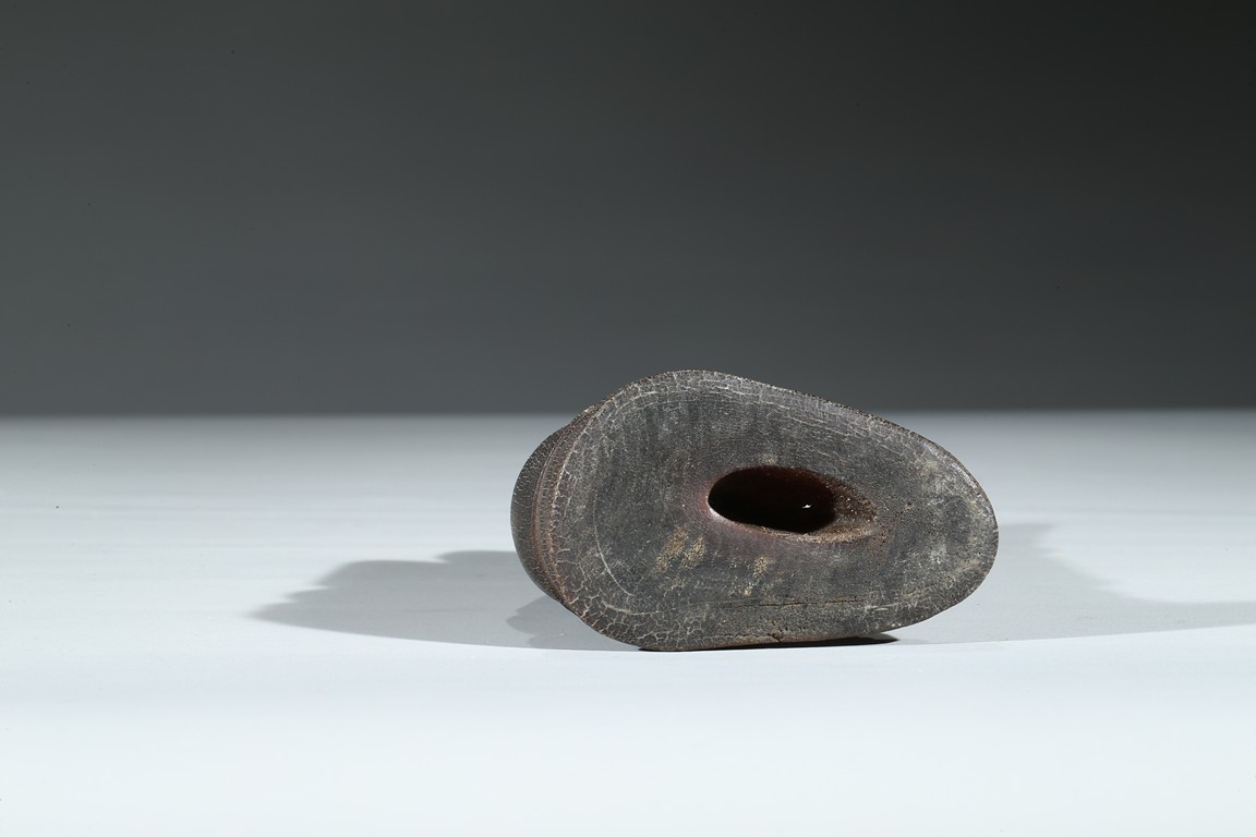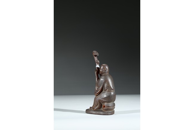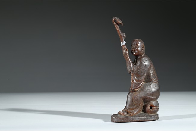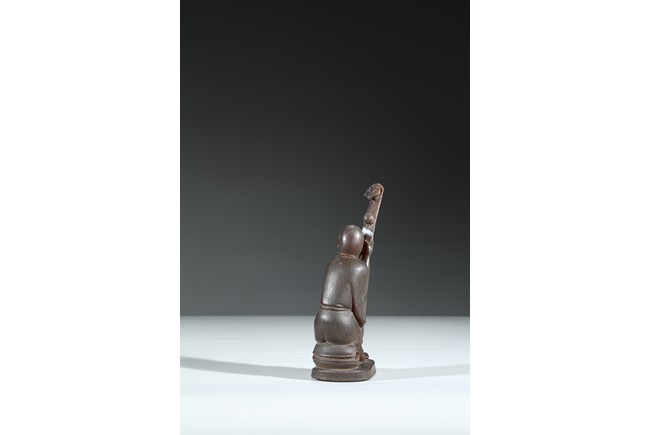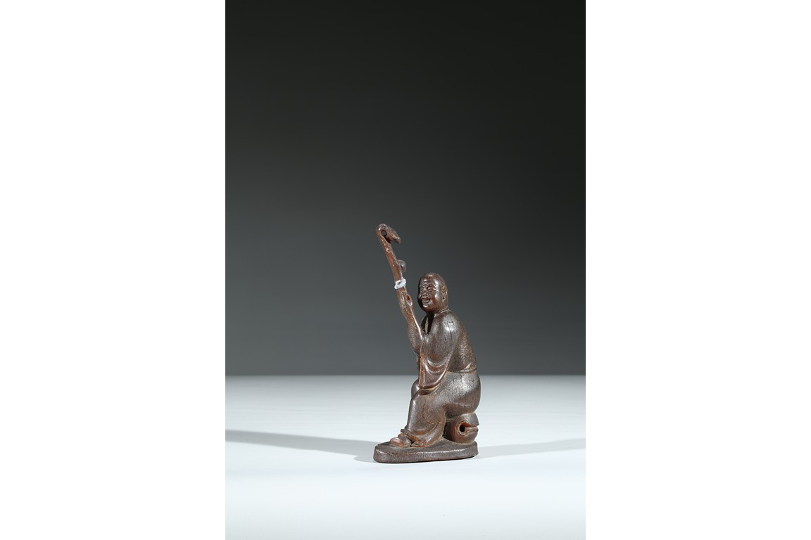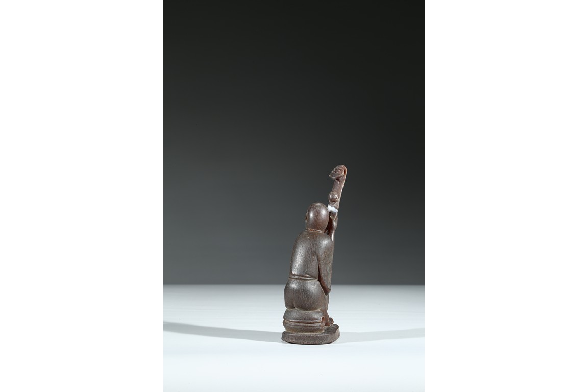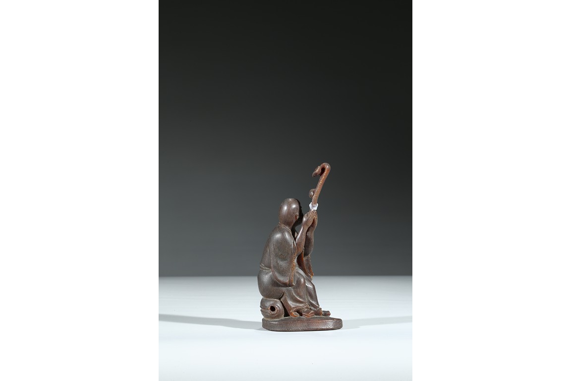 Carved with a monk sitting on a wood stand, with a smiling face, and a large ruyi scepter on hands. Qing Dynasty Period.