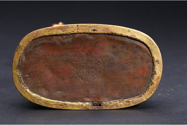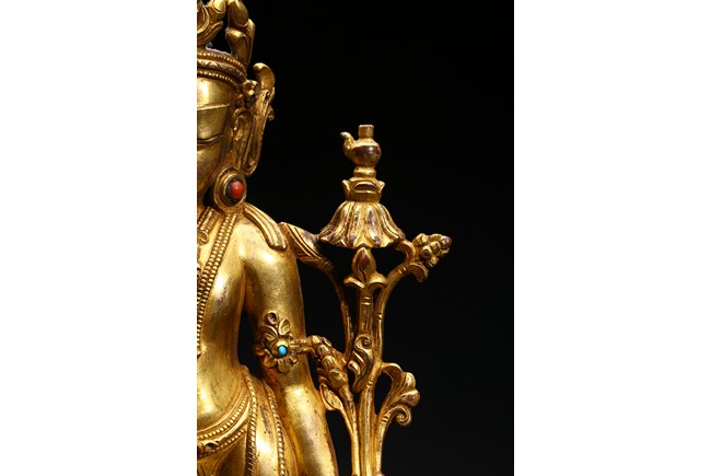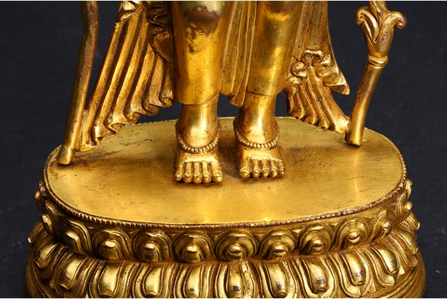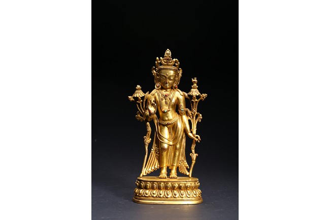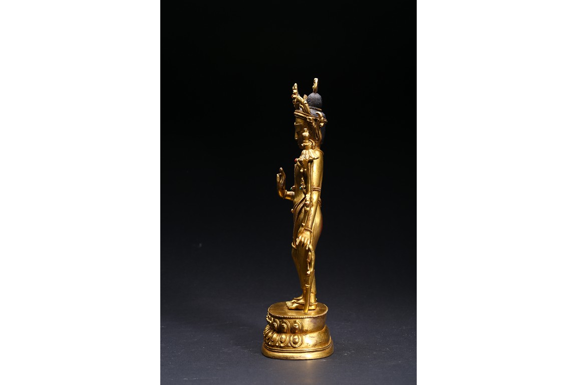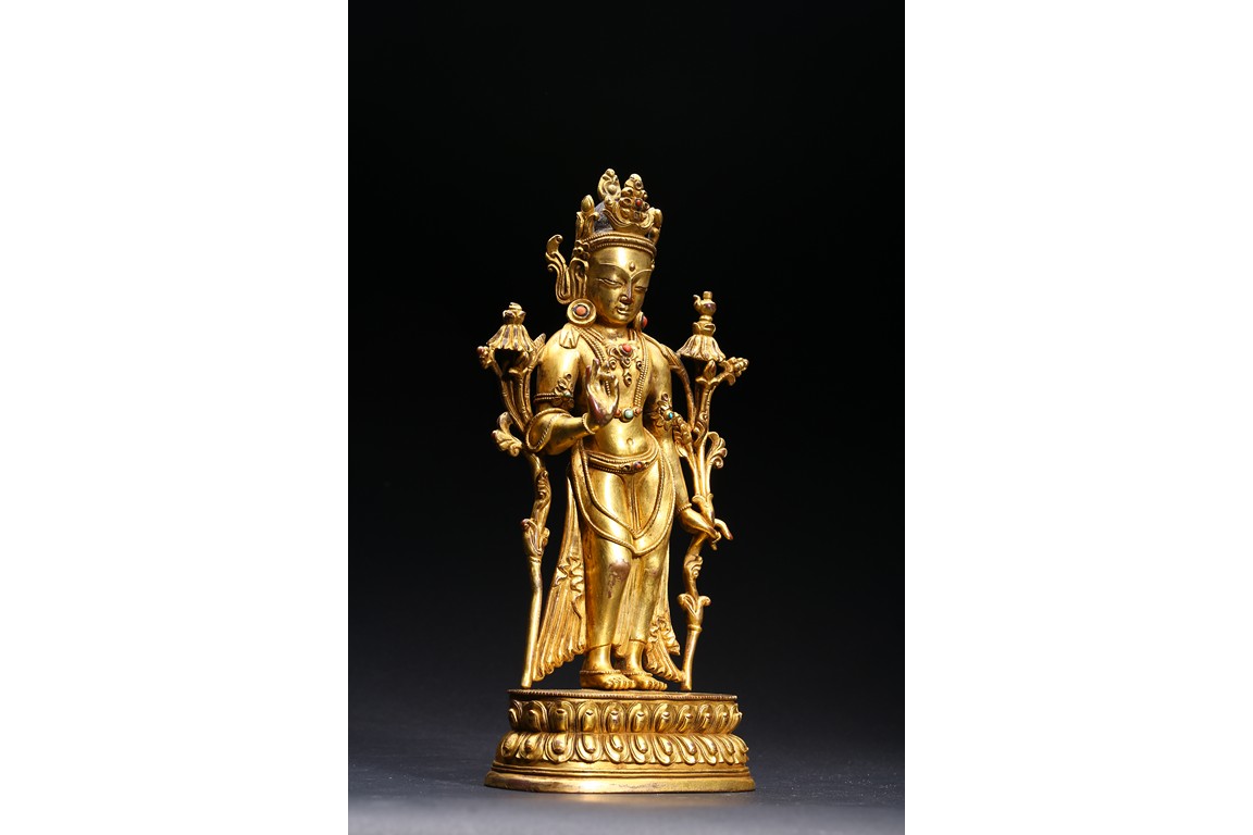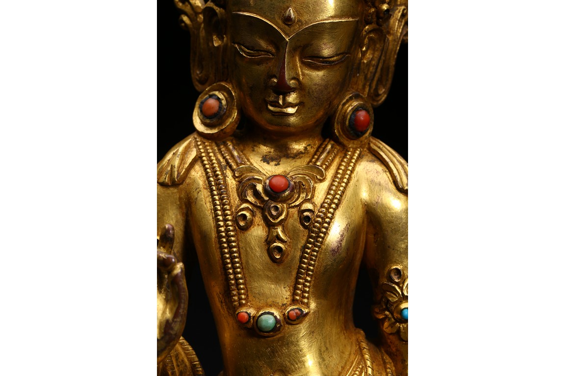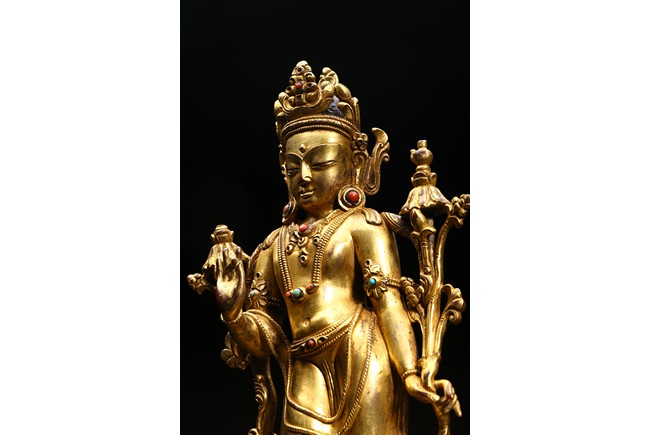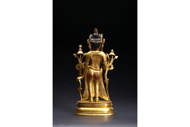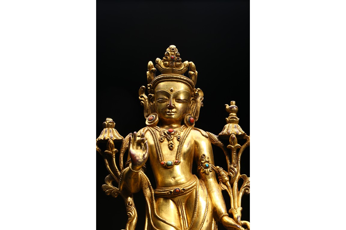 Standing on a lotus base, the face with downcast eyes, framed by elongated earlobes, suspending two coral-bead decorated earrings. The hair is tied in a top knot, and wearing a tiara set. Qing Dynasty period.