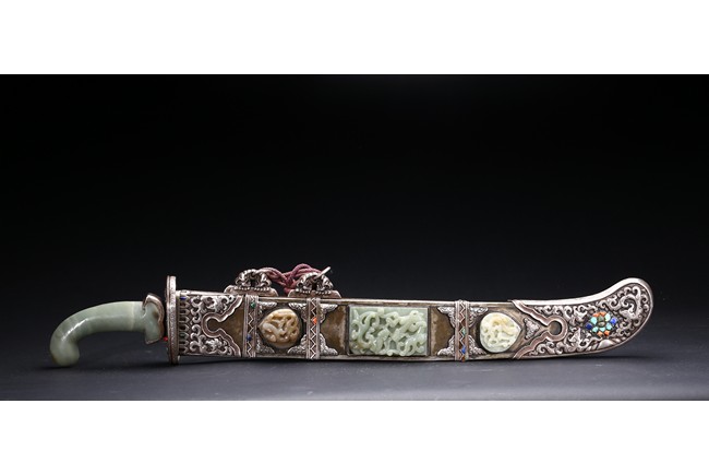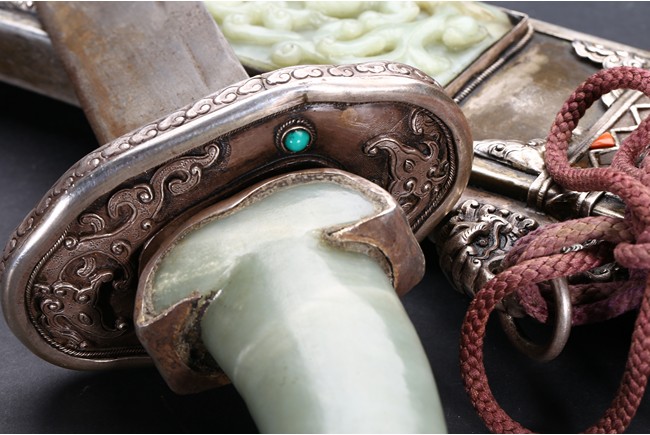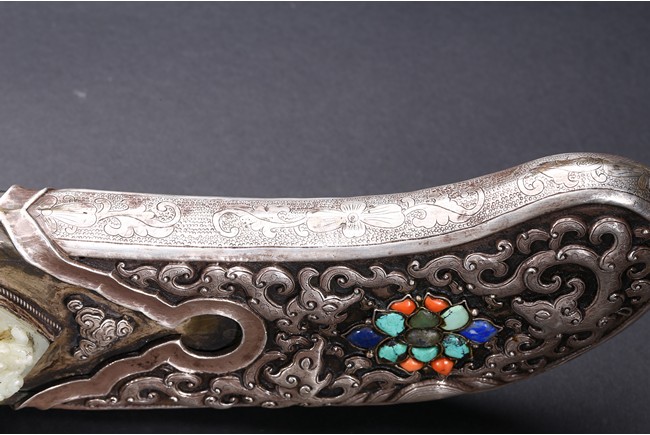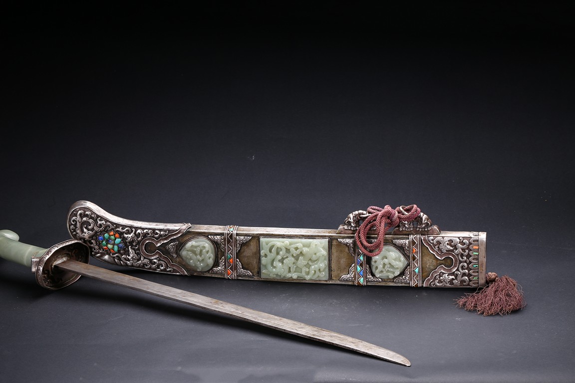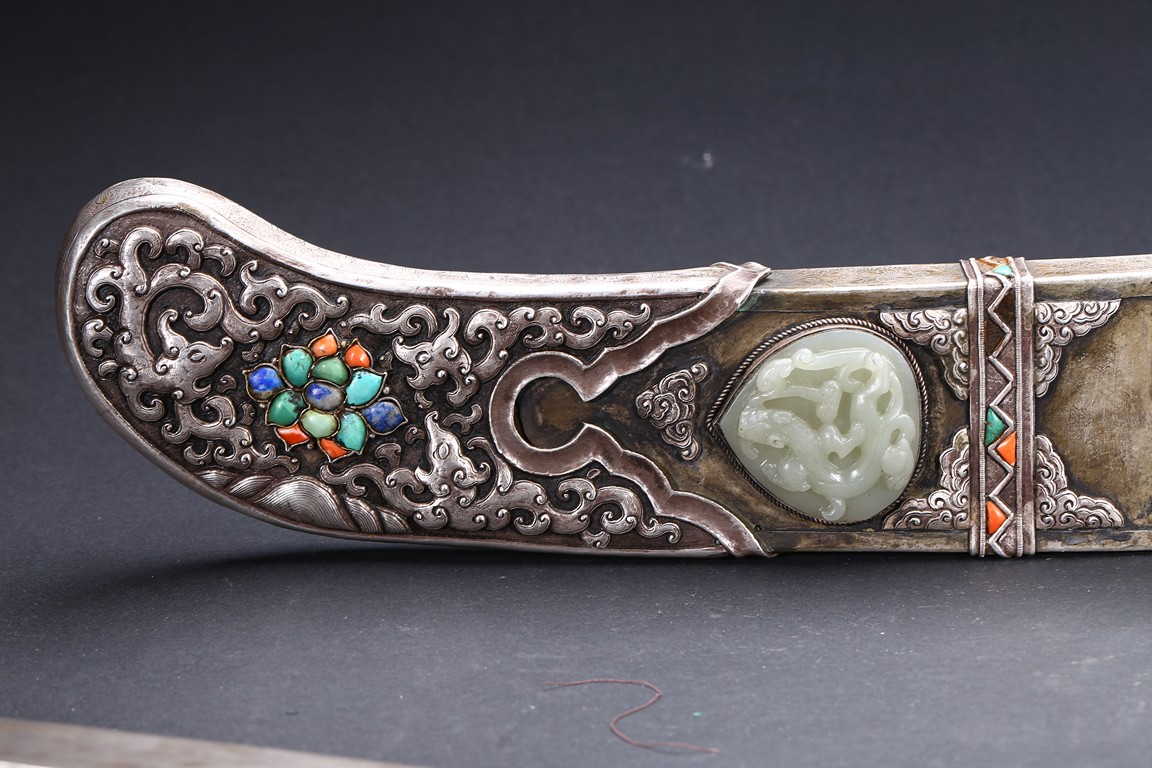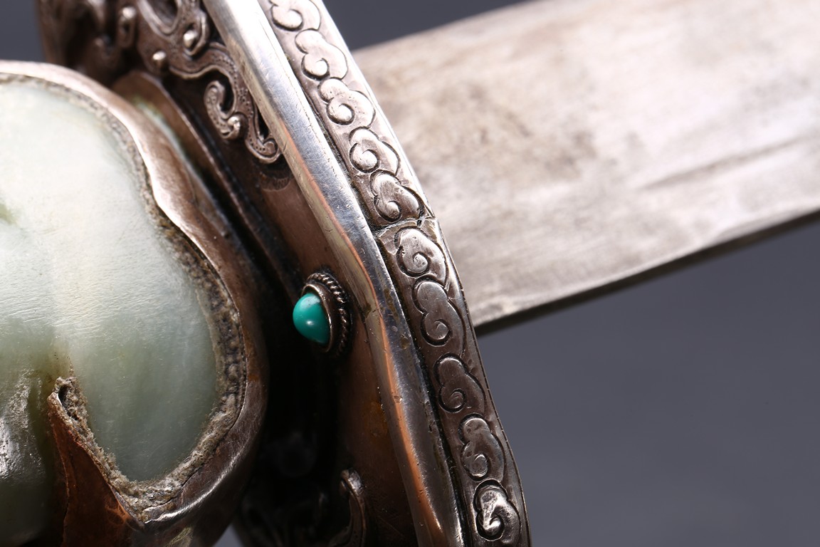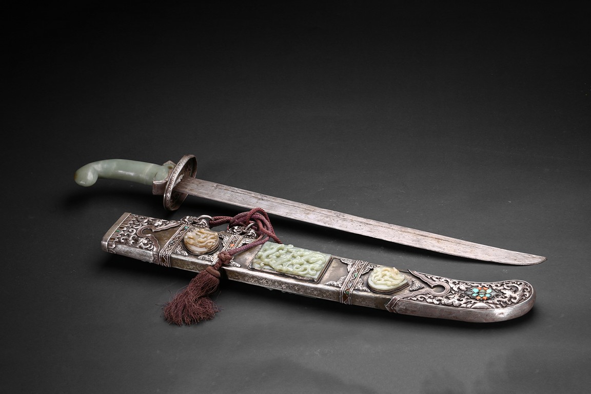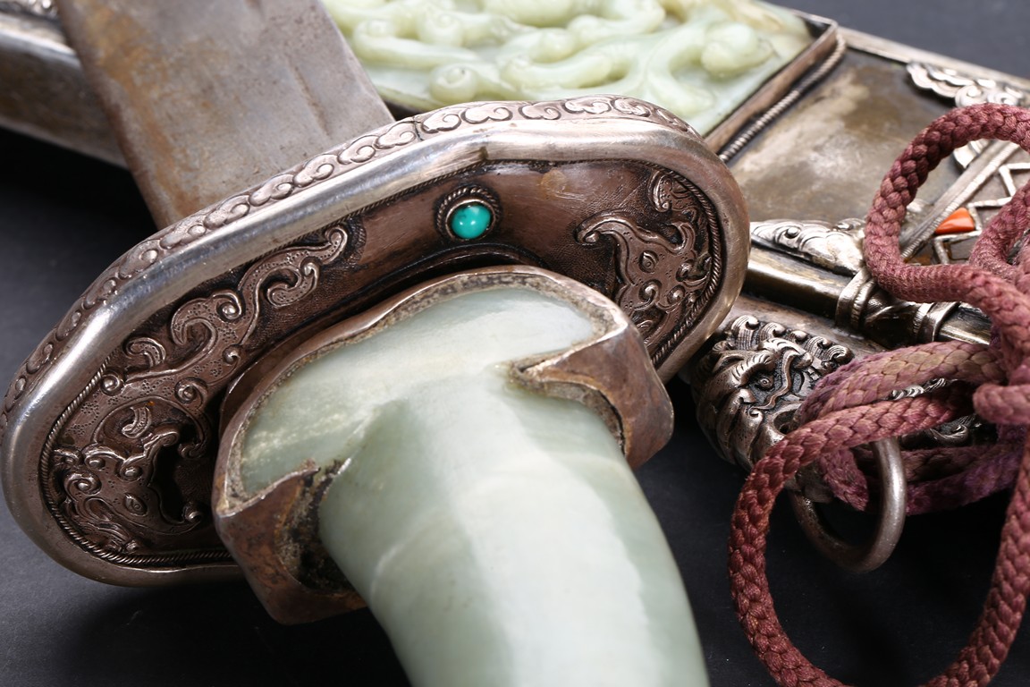 Finely cast silver jade inlaid scabbard with carved jade hilt. Qing Dynasty period.