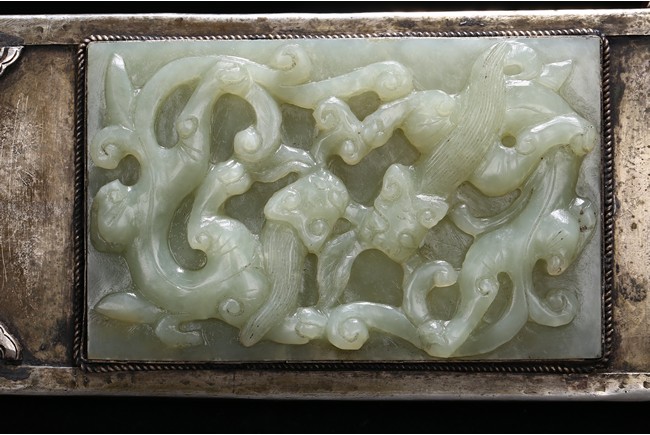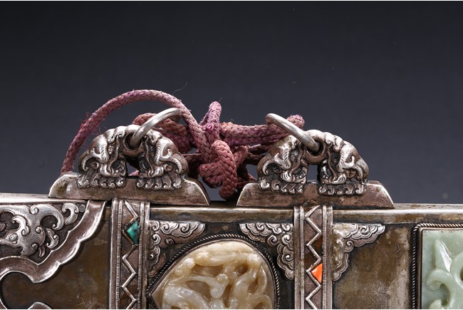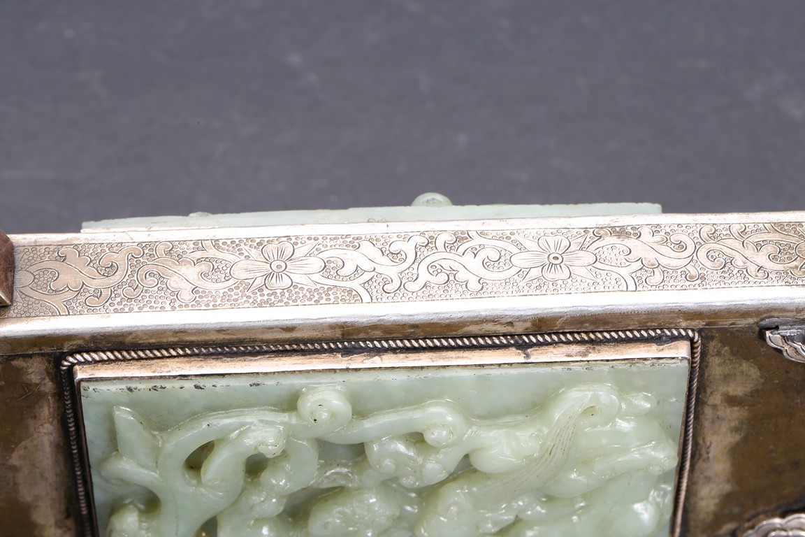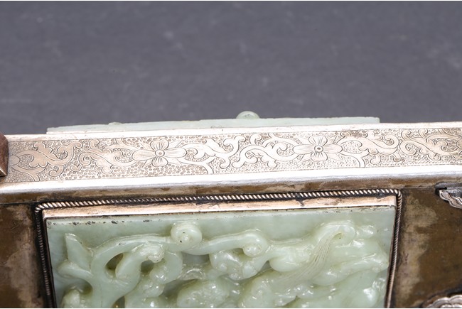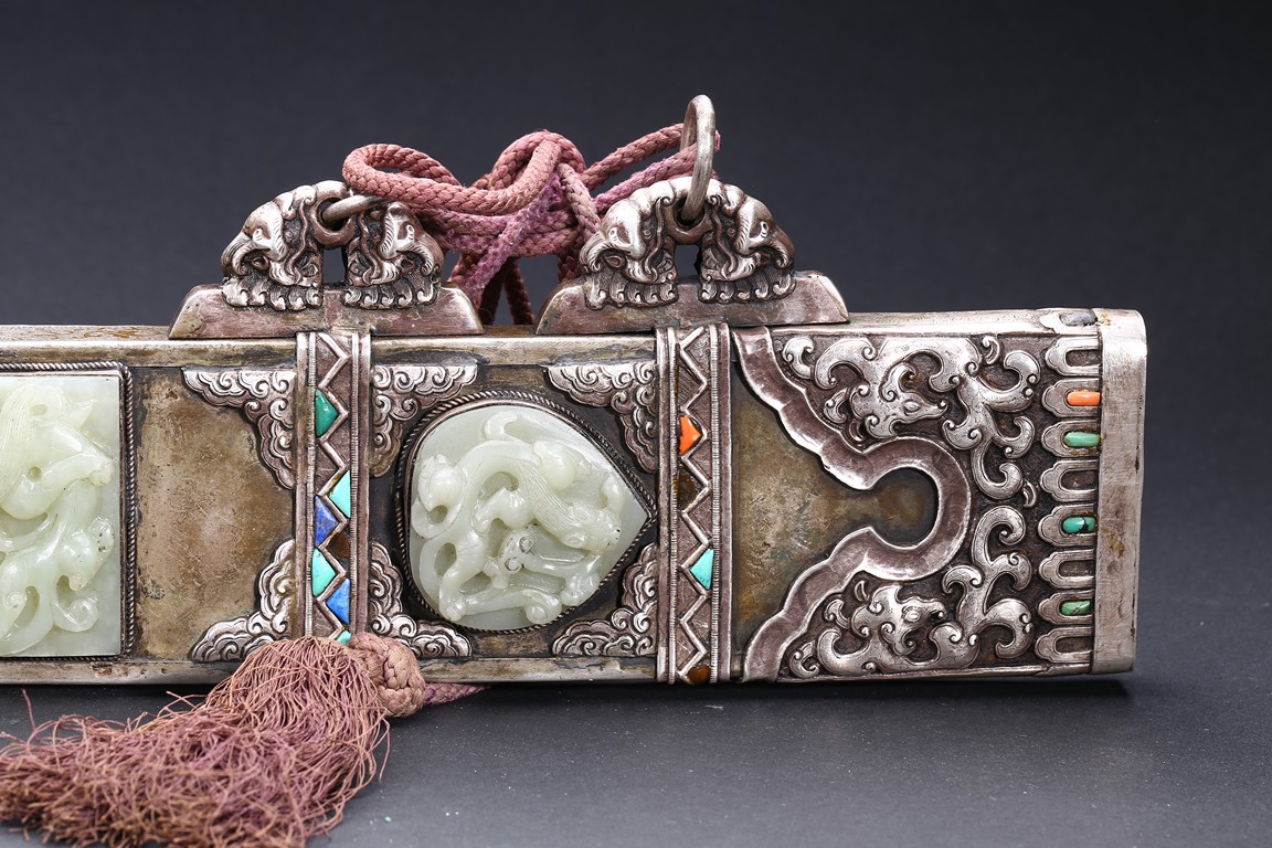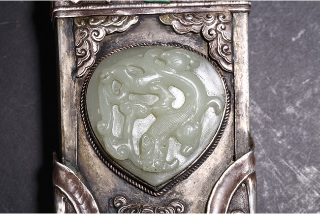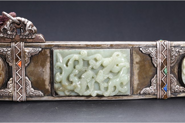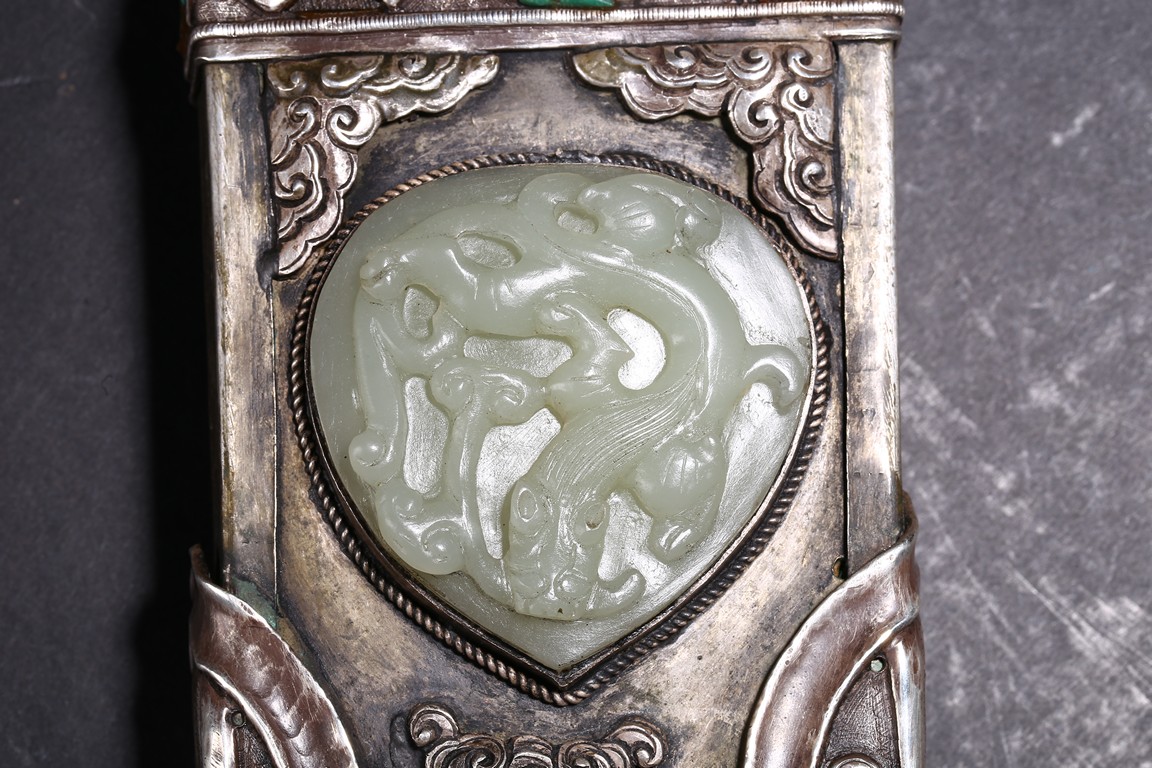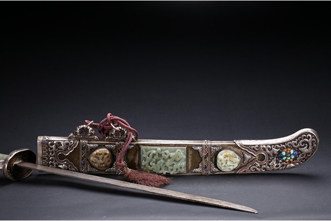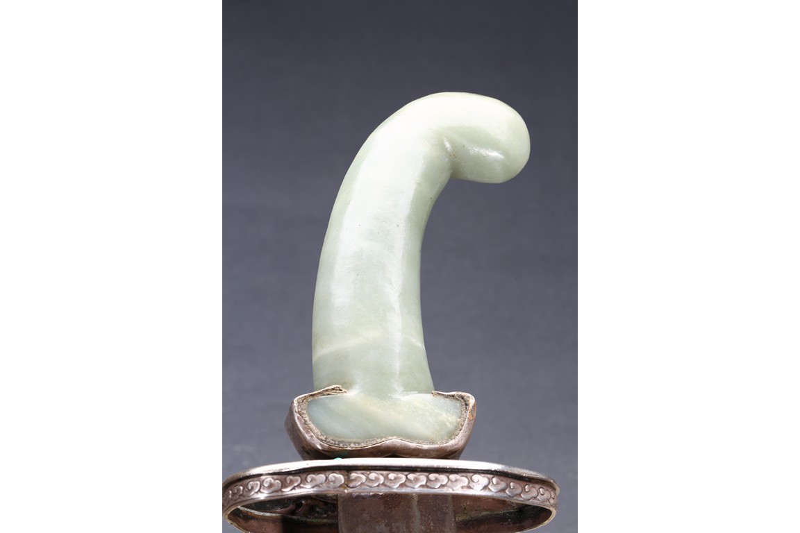 Finely cast silver jade inlaid scabbard with carved jade hilt. Qing Dynasty period.
