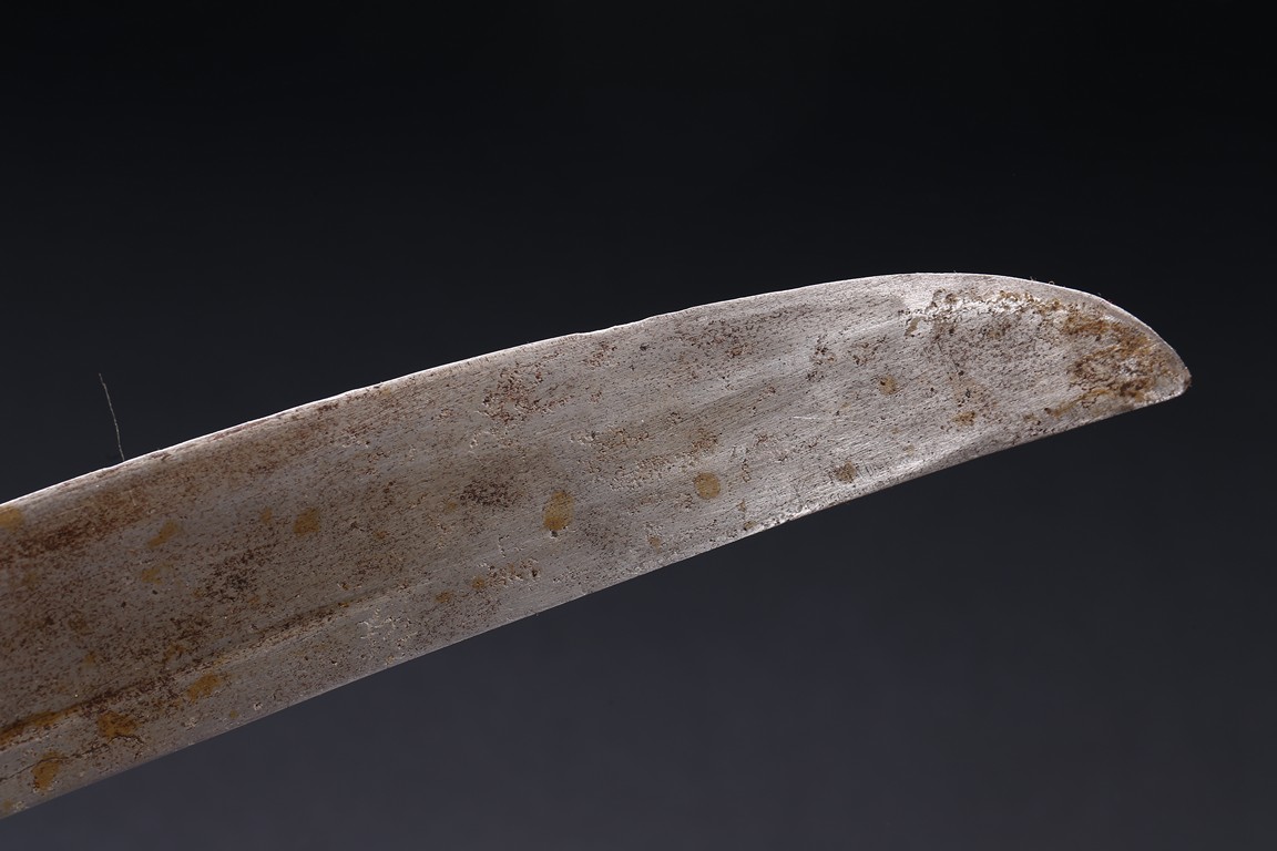 銀質暗花鑲青玉鞘佩刀長81.3釐米,寬11.7釐米。銀質暗花鑲青玉刀鞘,刀柄為青玉所製,整把刀鞘全部暗刻花卉、花鳥,刀鞘兩邊鑲有雕刻的青玉,此刀外觀精緻華麗,工藝複雜,難得少見。