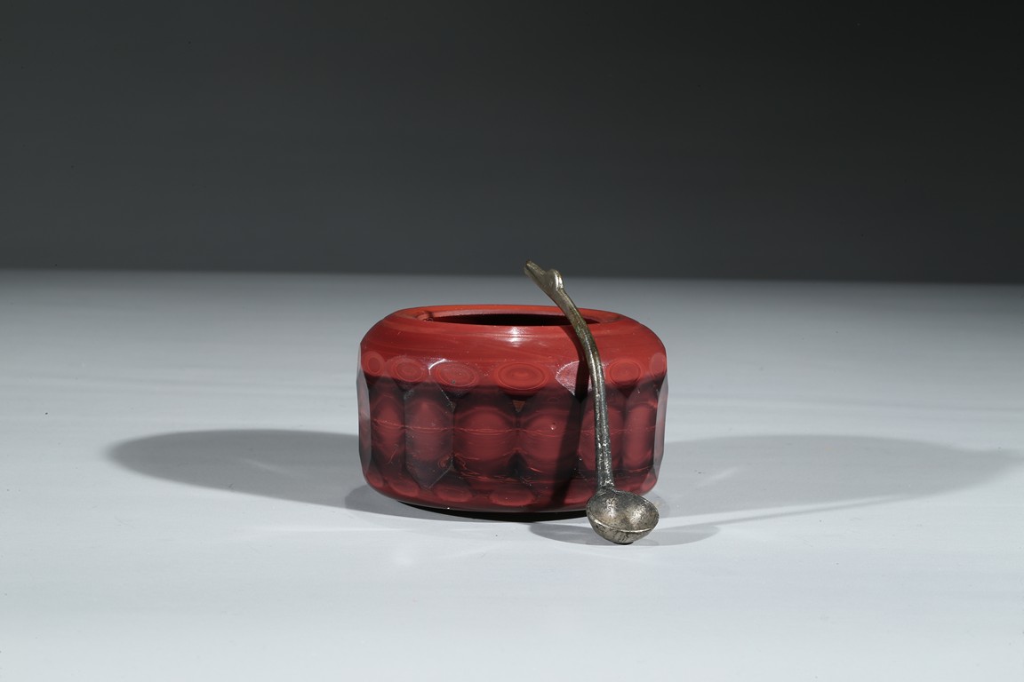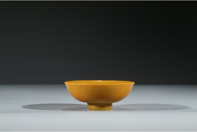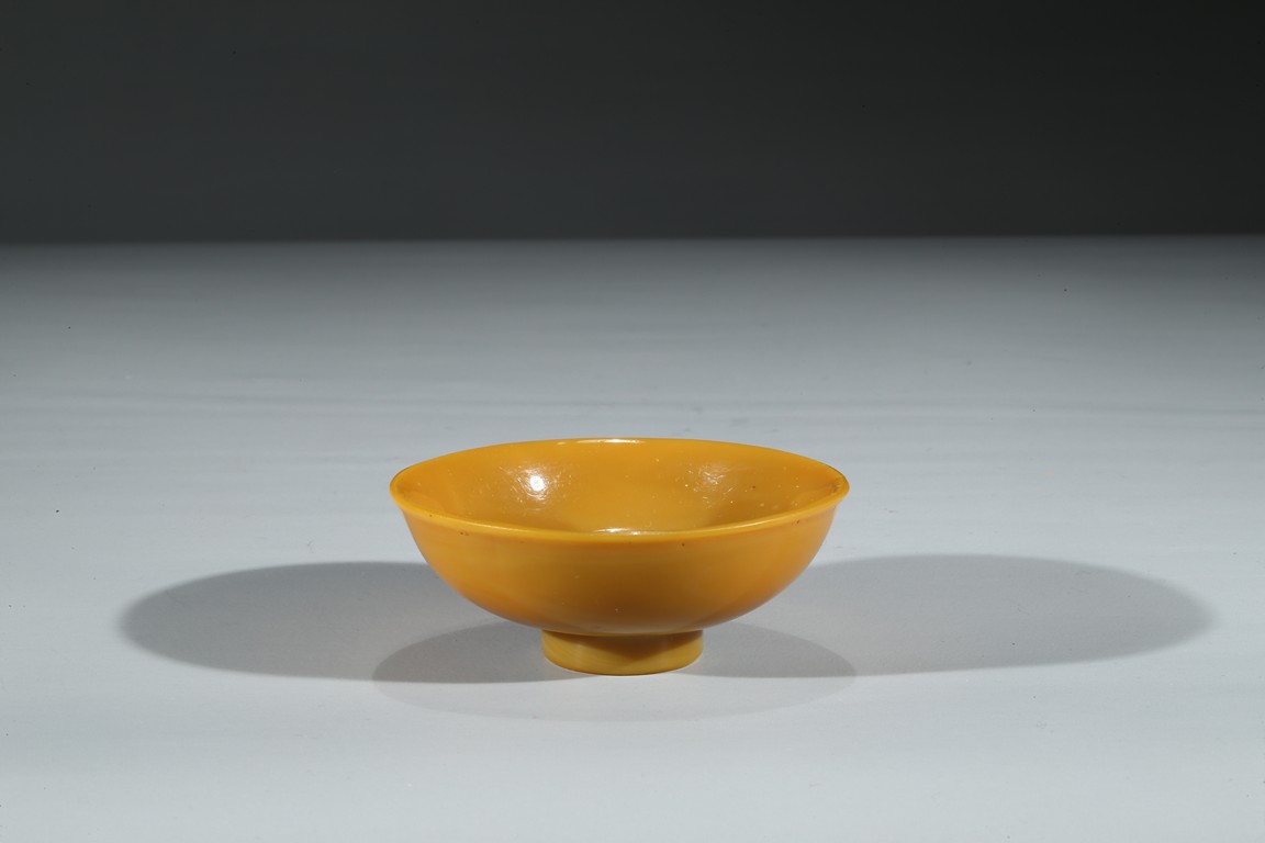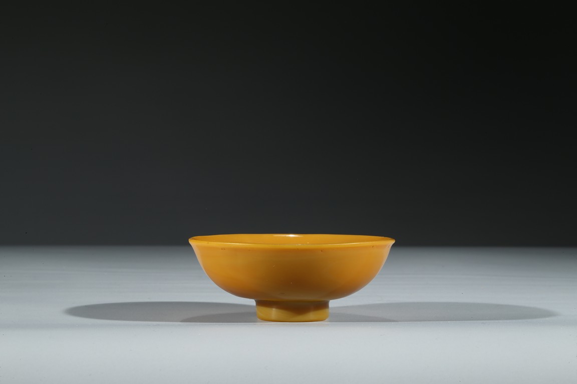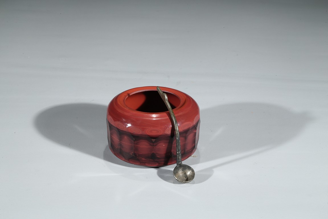 Consisting of a yellow glass bowl and a red glass water coupe with a silver spoon. Qing Dynasty period.