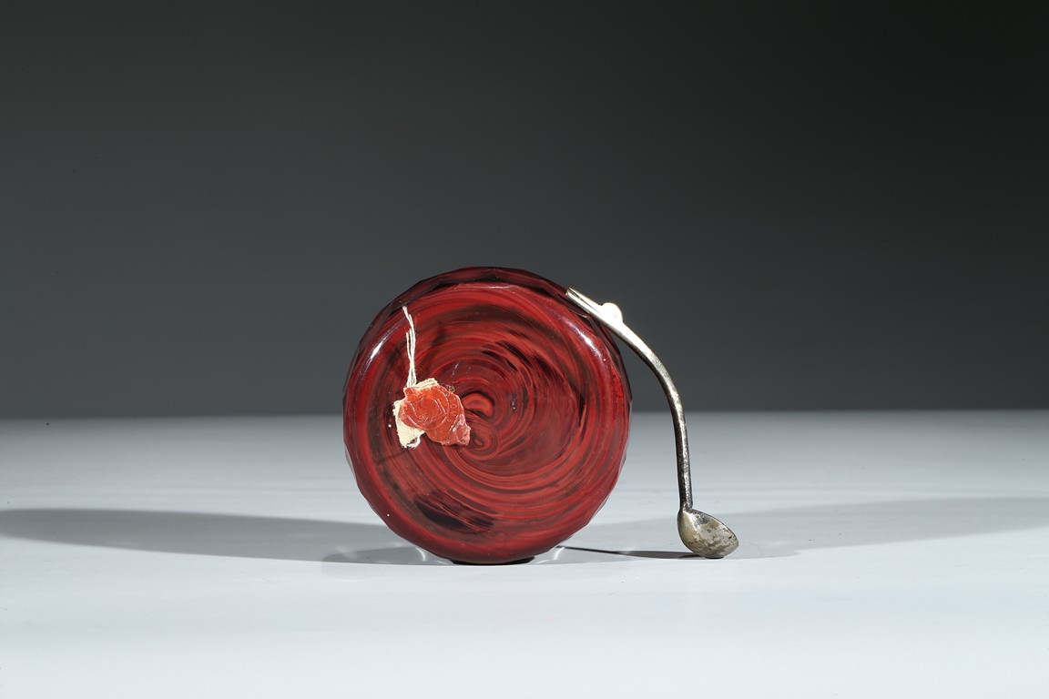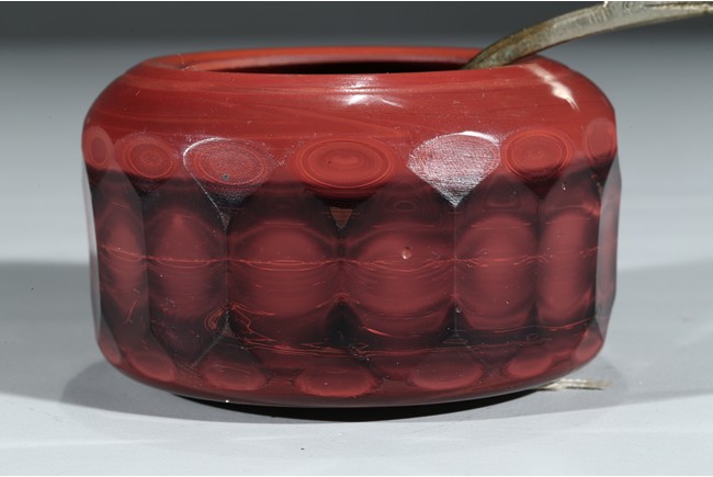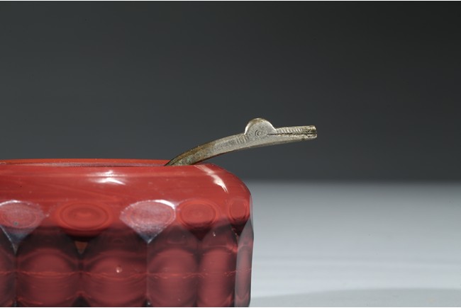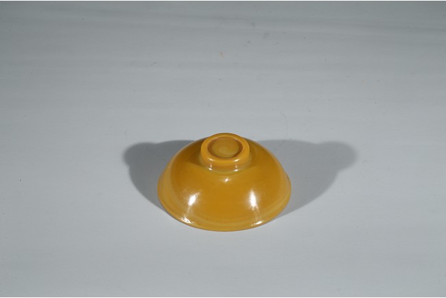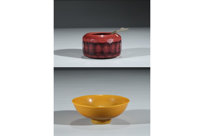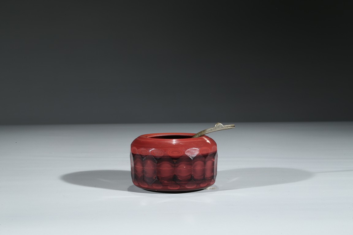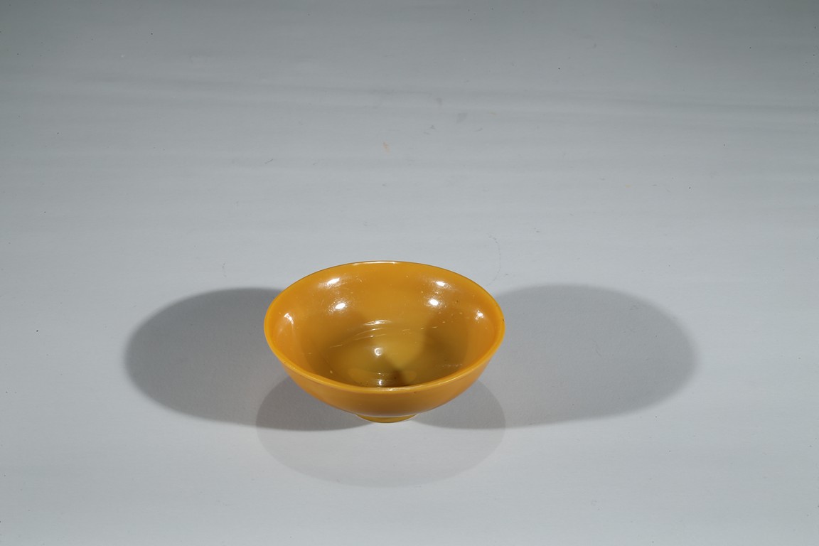 Consisting of a yellow glass bowl and a red glass water coupe with a silver spoon. Qing Dynasty period.
