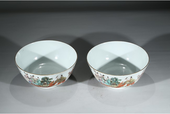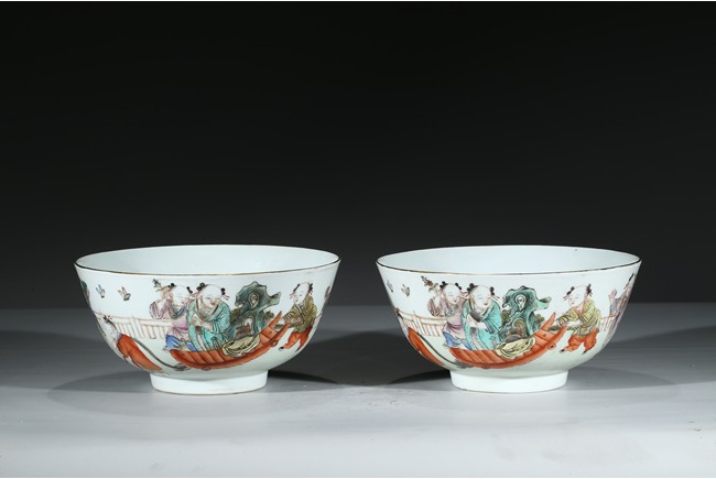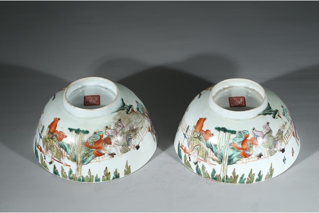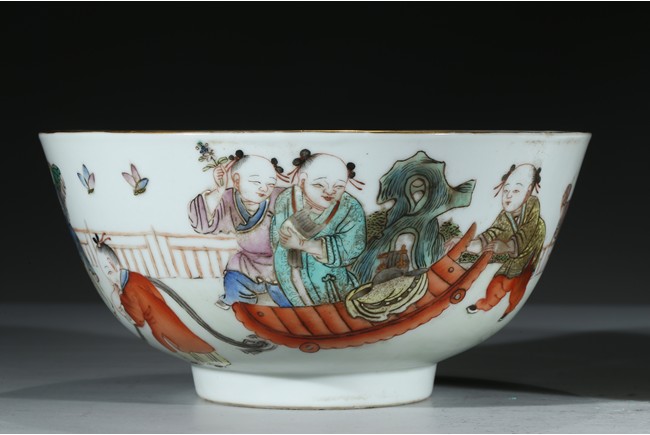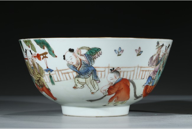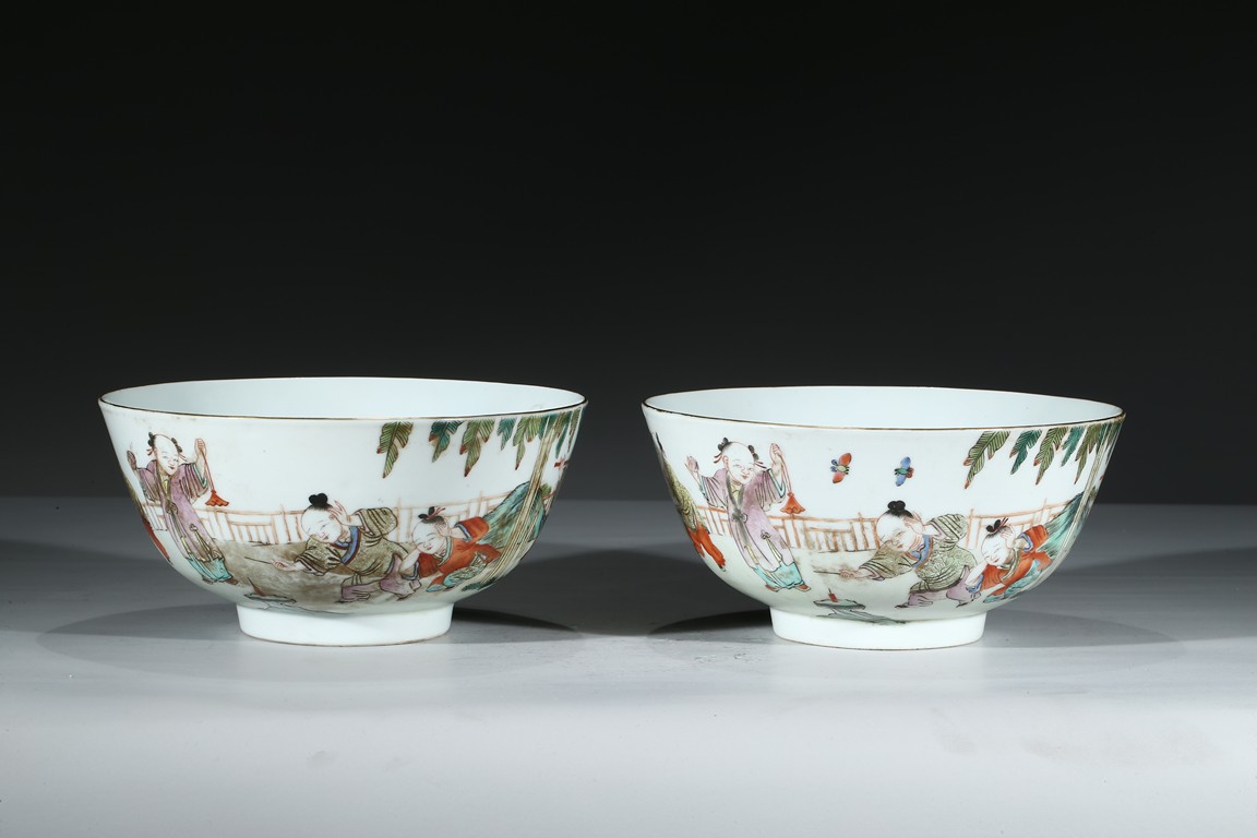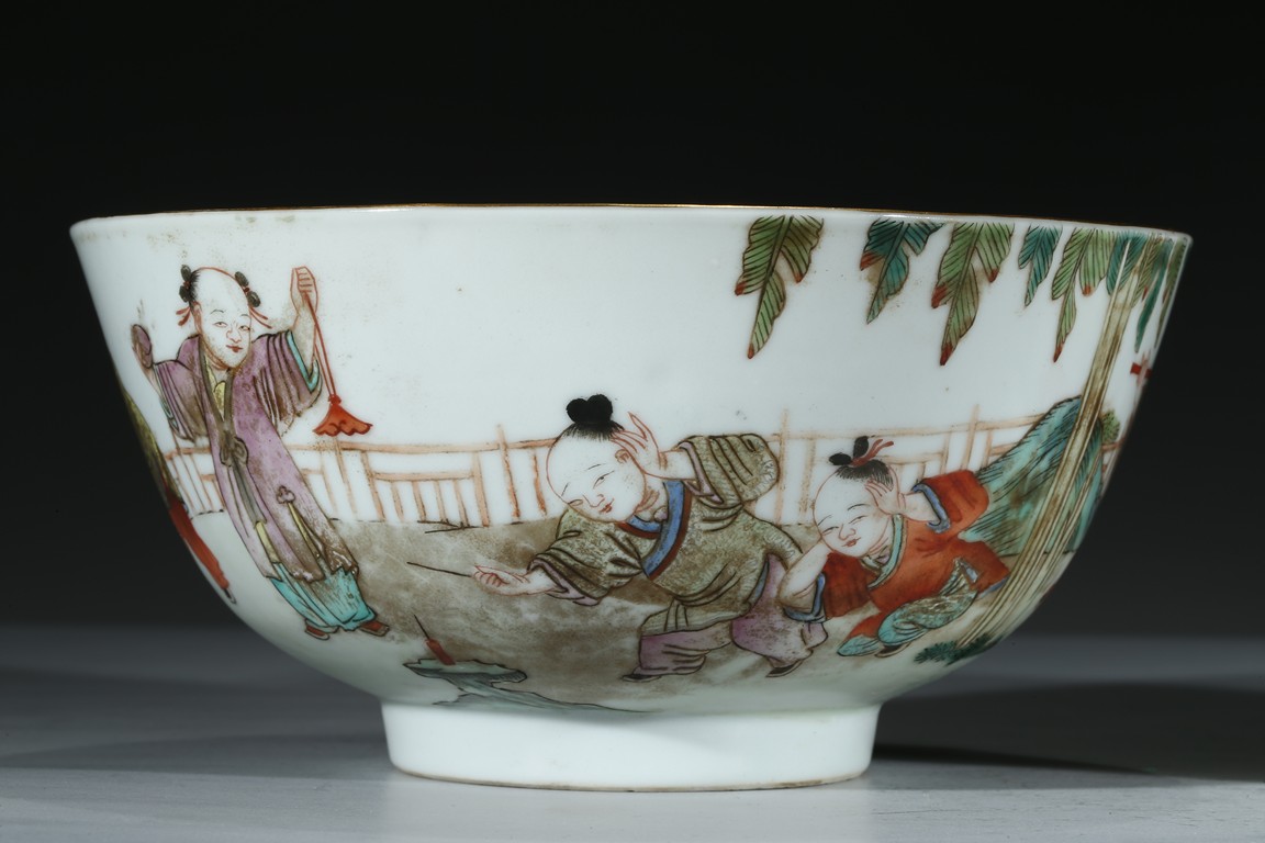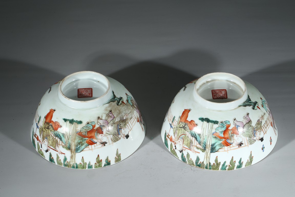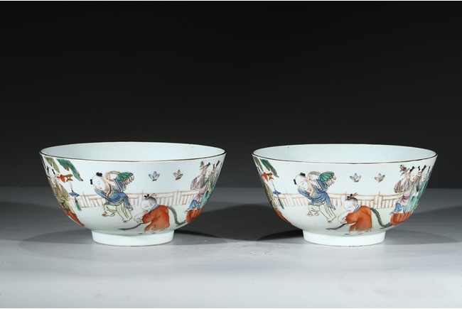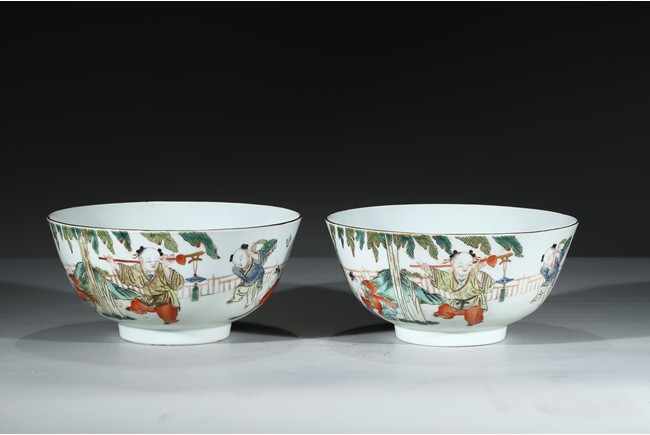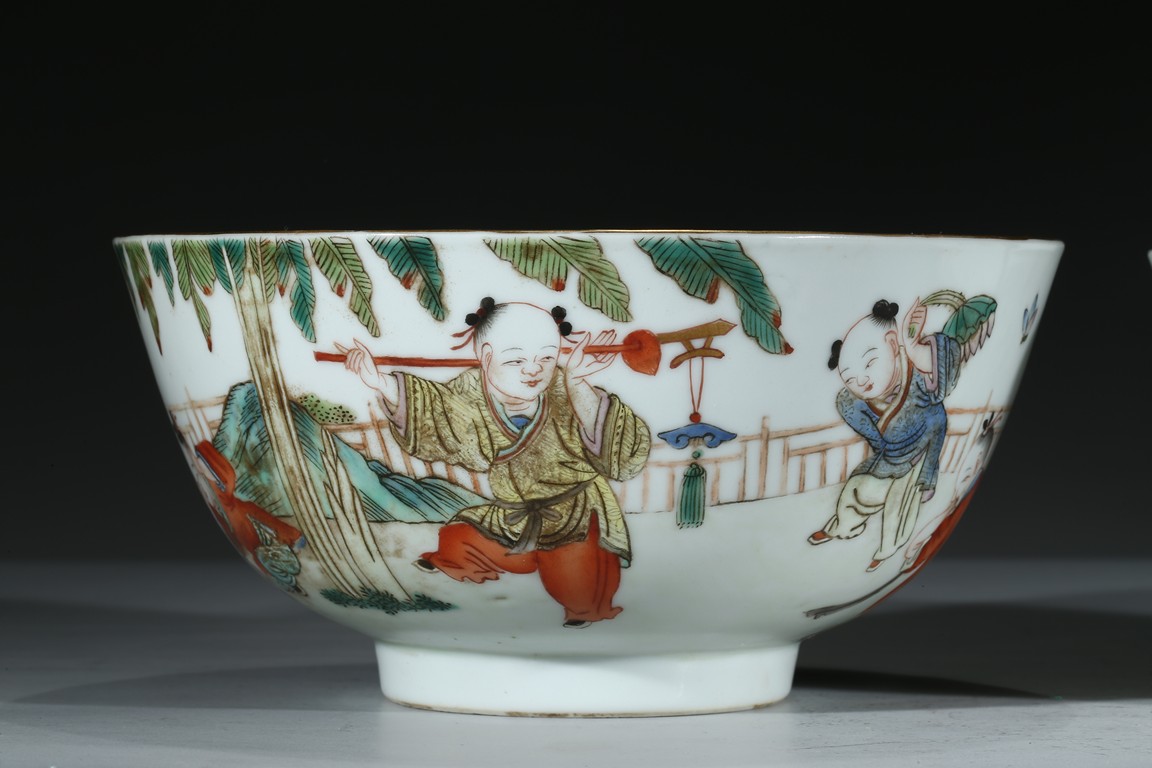 Each bowl finely enamelled with boys playing in a garden scene. Qing Dynasty Daoguang Period.