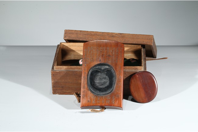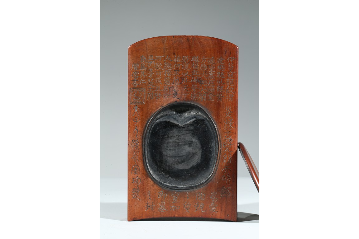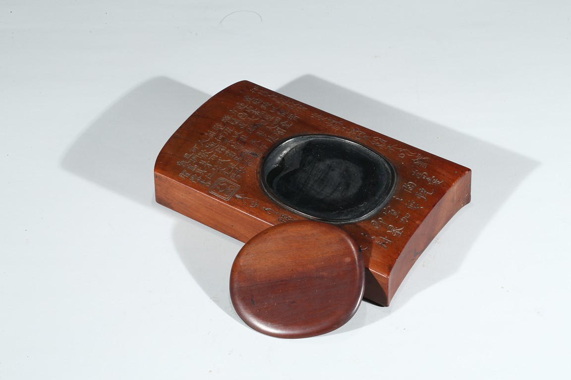 The Huanghuali inscribed with imperial inscriptions and inlaid with Duan stone to the center. Qing Dynasty period.