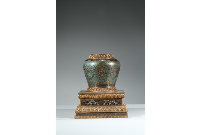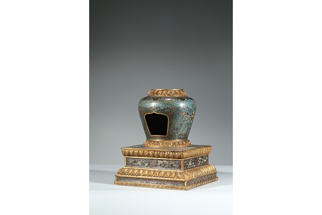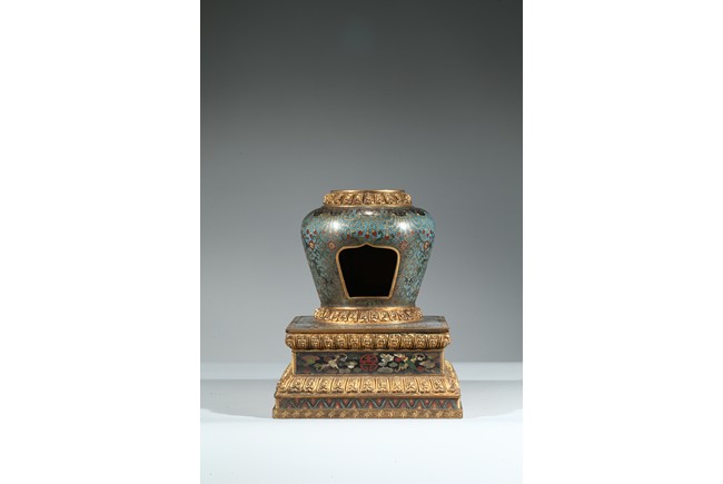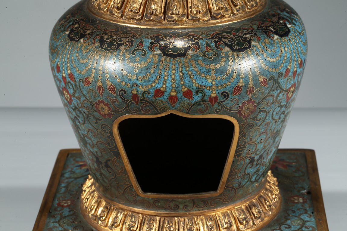 The ovoid body set on a seat of radial petal lappets, raised on a plinth, the sides decorated with lotus blossoms borne on meandering scrolls beneath an elaborate mythical beast masks encircling the shoulders, with top pagoda missing. Qing Dynasty period.