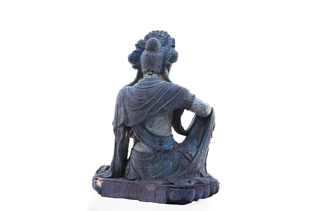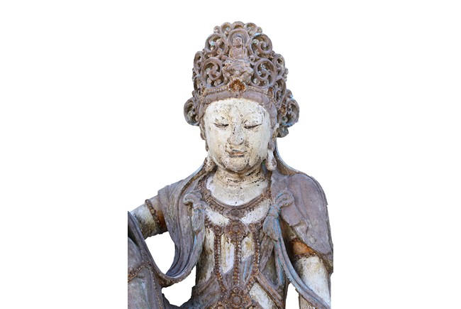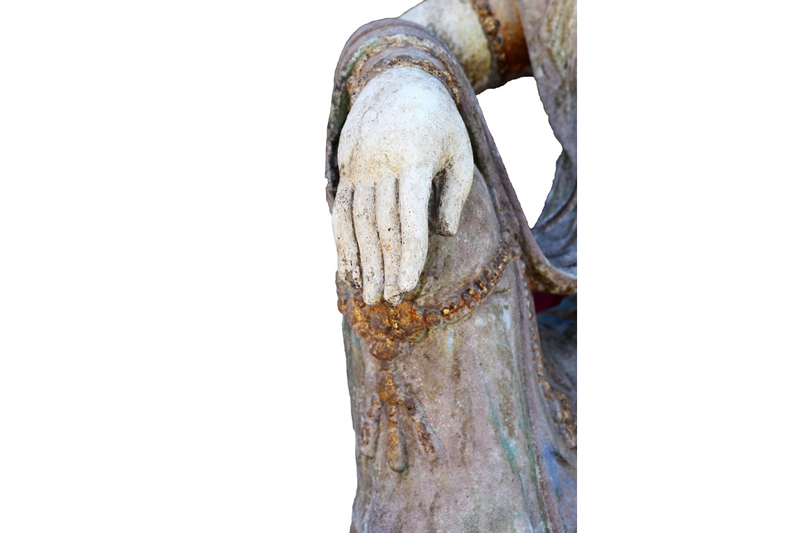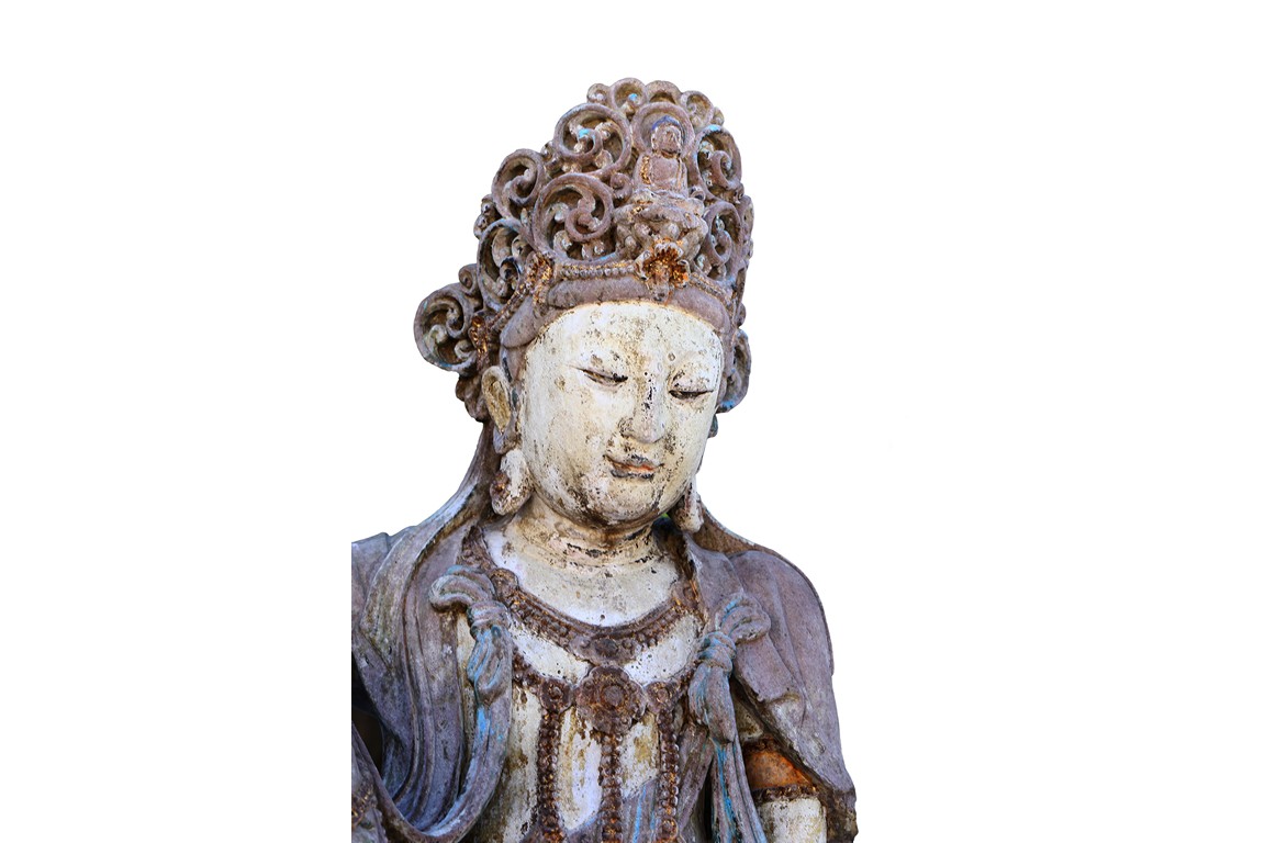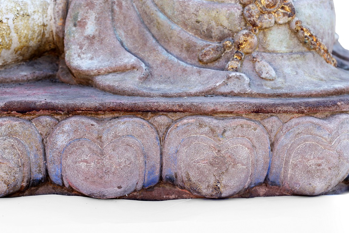 此尊觀音坐像體積宏大,分上下兩個部分。上部為觀音悠坐於蓮花座上,面部眼、耳、鼻及手、足雕工自然,神態慈愛安詳,身體線條優美柔和,頭飾為精緻的佛雕,穿著服飾有華美飄逸之感,頭飾與服飾上均有貼金裝飾痕跡。下部為八隻小鬼將蓮花座托起,八隻小鬼的雕刻採用逼真的浮雕工藝,每隻形態各不相同,活靈活現,精彩異常。整座觀音雕像包漿自然,保存完好。此類彩繪觀音坐像在歷次的拍賣會上極為少見,可謂個人及博物館首選藏寶。