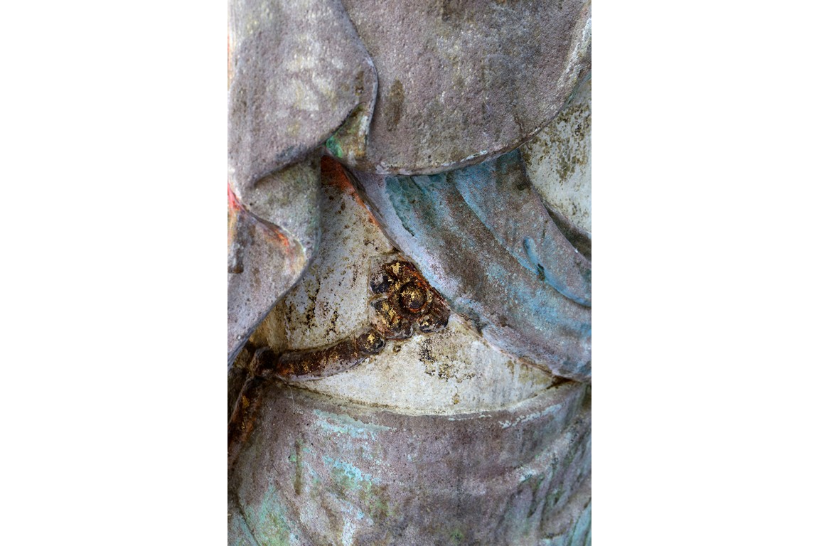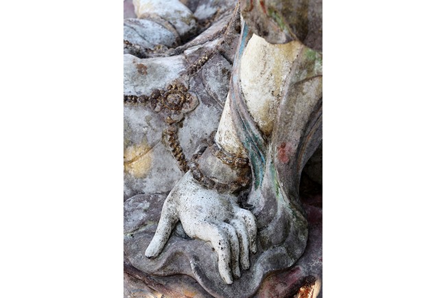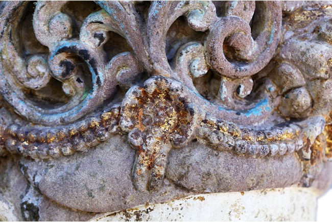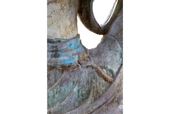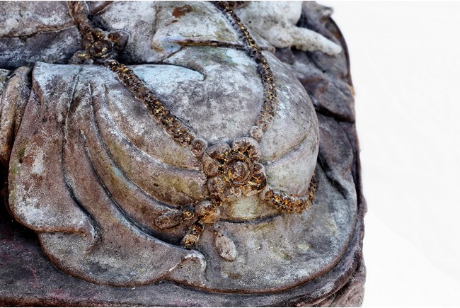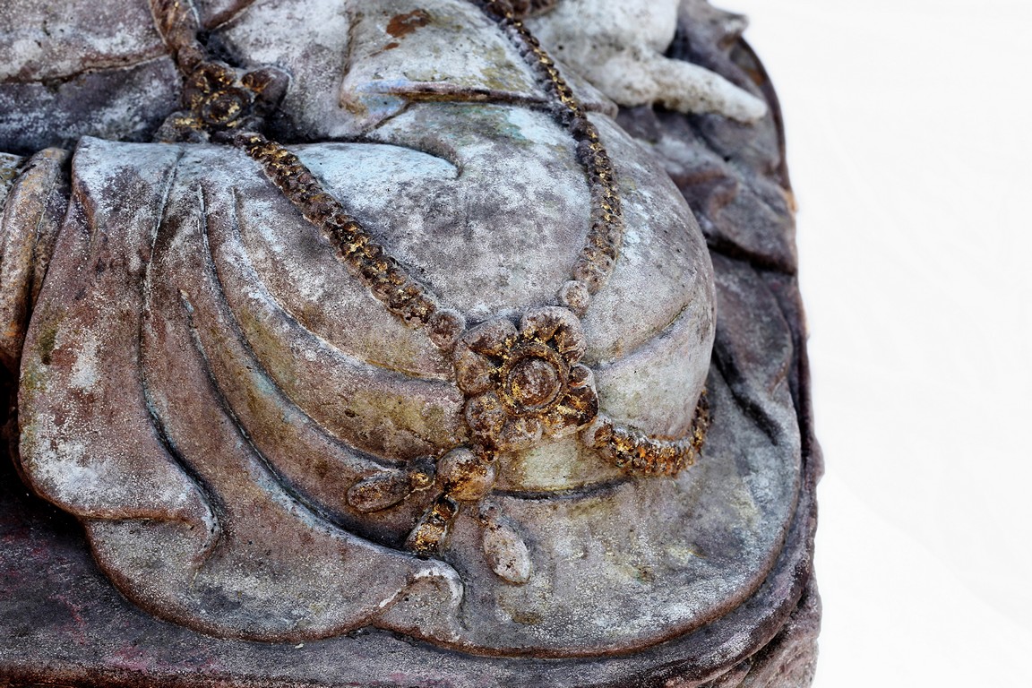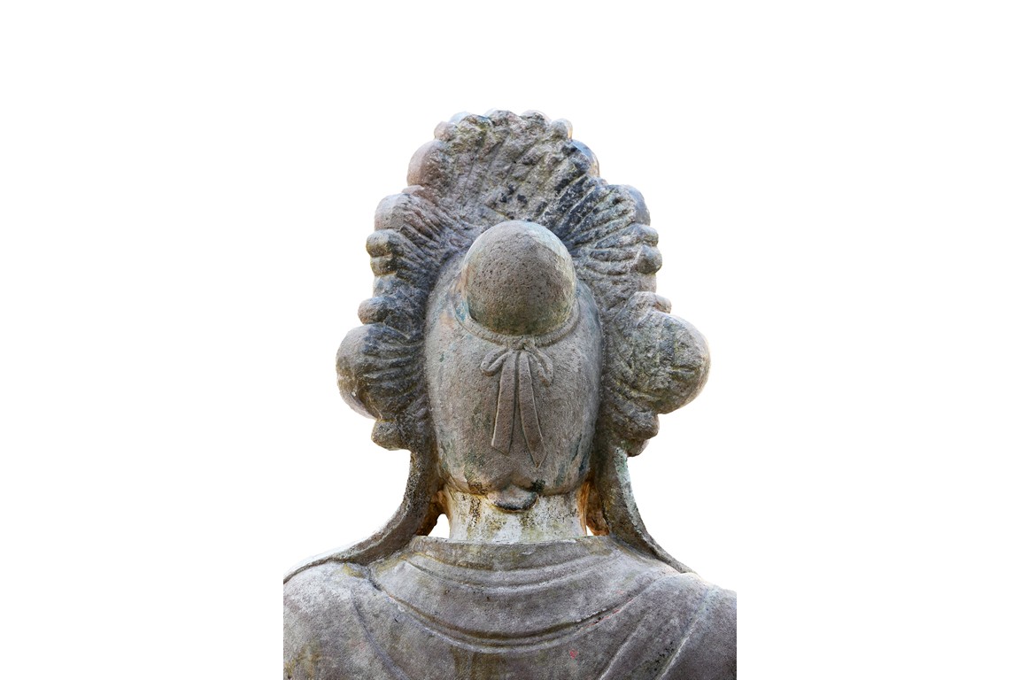 此尊觀音坐像體積宏大,分上下兩個部分。上部為觀音悠坐於蓮花座上,面部眼、耳、鼻及手、足雕工自然,神態慈愛安詳,身體線條優美柔和,頭飾為精緻的佛雕,穿著服飾有華美飄逸之感,頭飾與服飾上均有貼金裝飾痕跡。下部為八隻小鬼將蓮花座托起,八隻小鬼的雕刻採用逼真的浮雕工藝,每隻形態各不相同,活靈活現,精彩異常。整座觀音雕像包漿自然,保存完好。此類彩繪觀音坐像在歷次的拍賣會上極為少見,可謂個人及博物館首選藏寶。