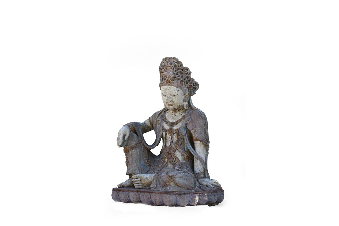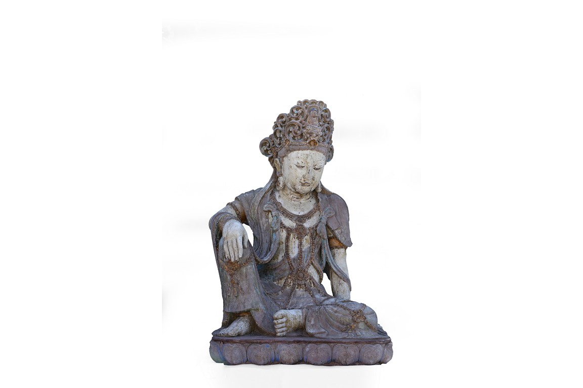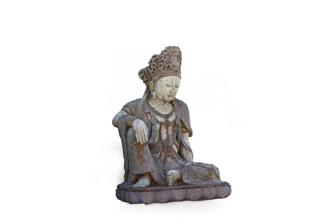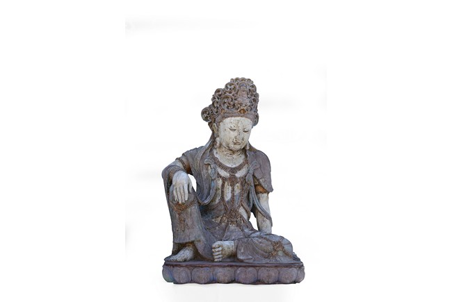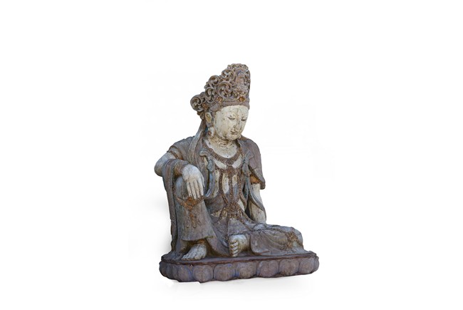The Guanyin is sitting with the right arm rested on the raised right leg. The face is carved with downcast eyes and smile lips, framed by the elongated earlobes suspending flower earrings. The Guanyin is dressed in loose robes elaborately decorated with gold flowers and beads jewelry, the hair is tied in a top knot, and wearing a tiara set at the front with a figure of buddha. It all supported on a lotus carrying by eight immortals with different poses and faces. 17th century.