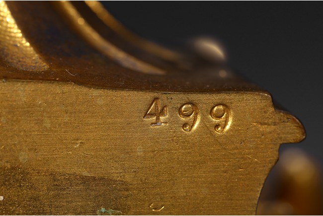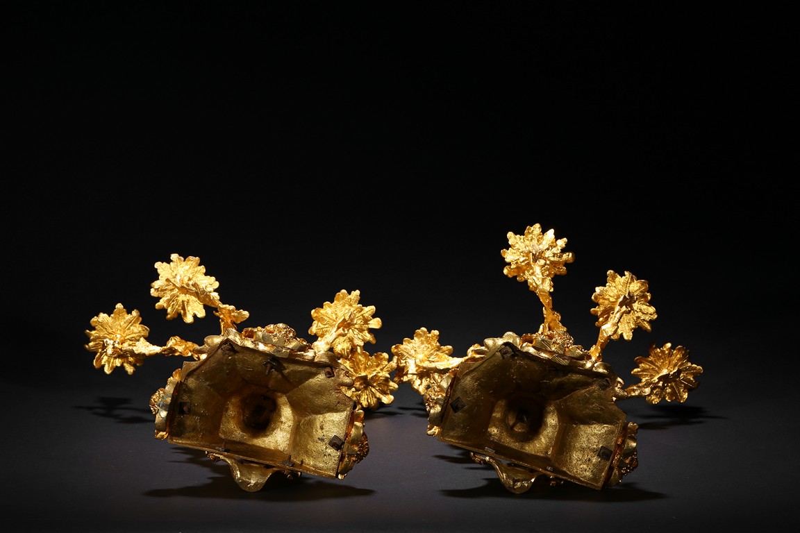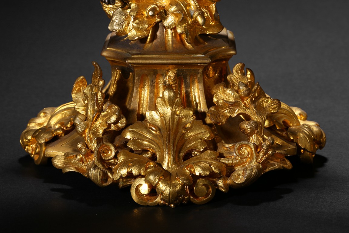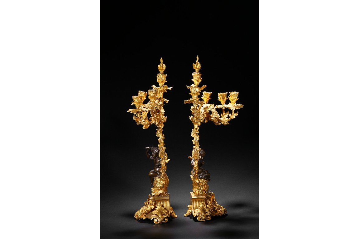 A pair of gilt candlesticks, each of irregular shape with bronze boy figure. 19th century.