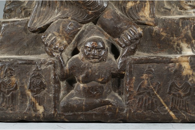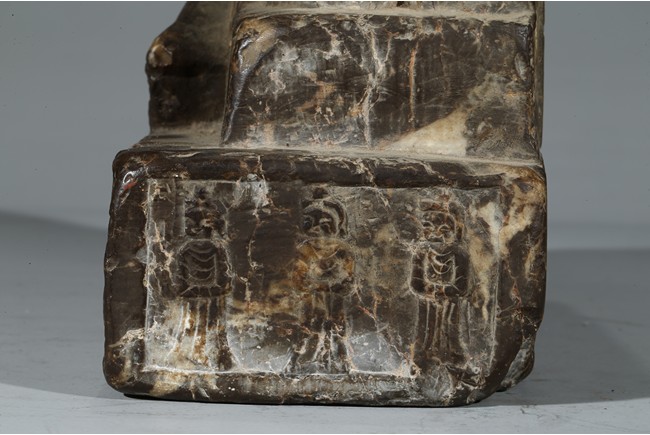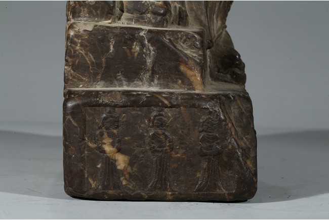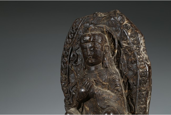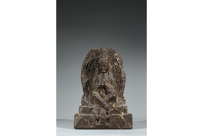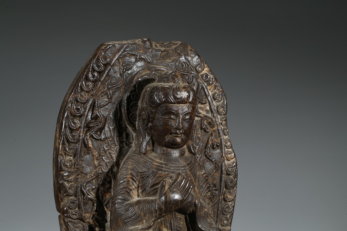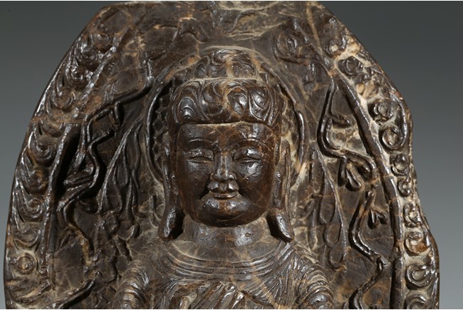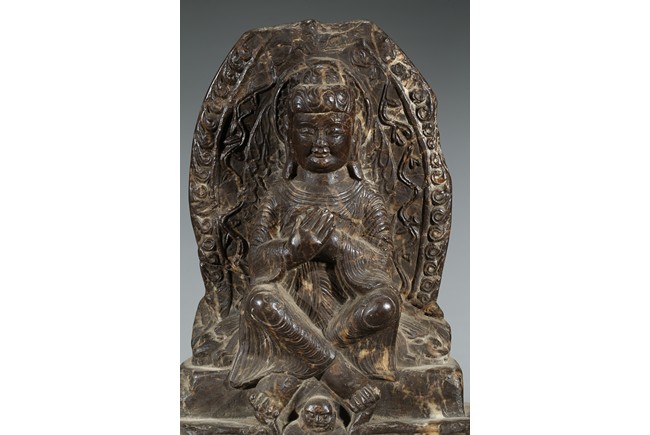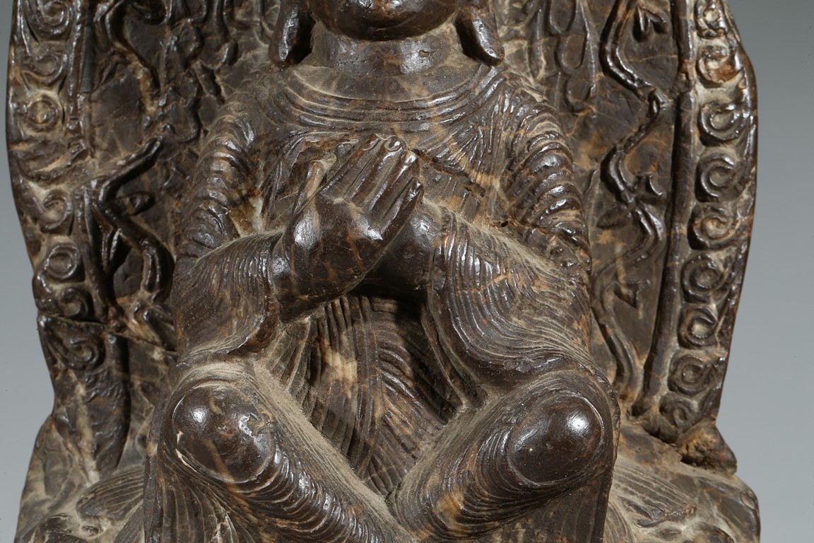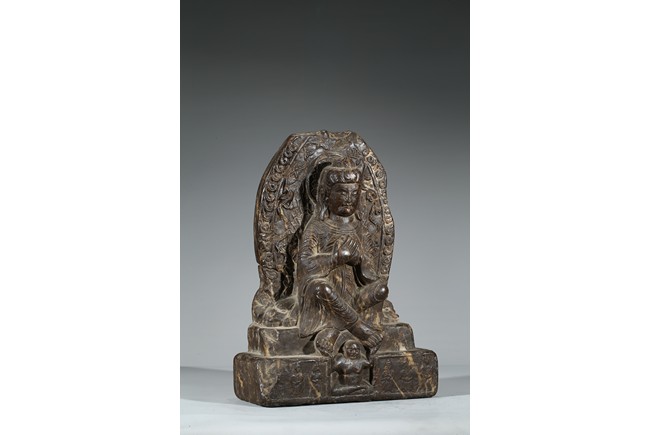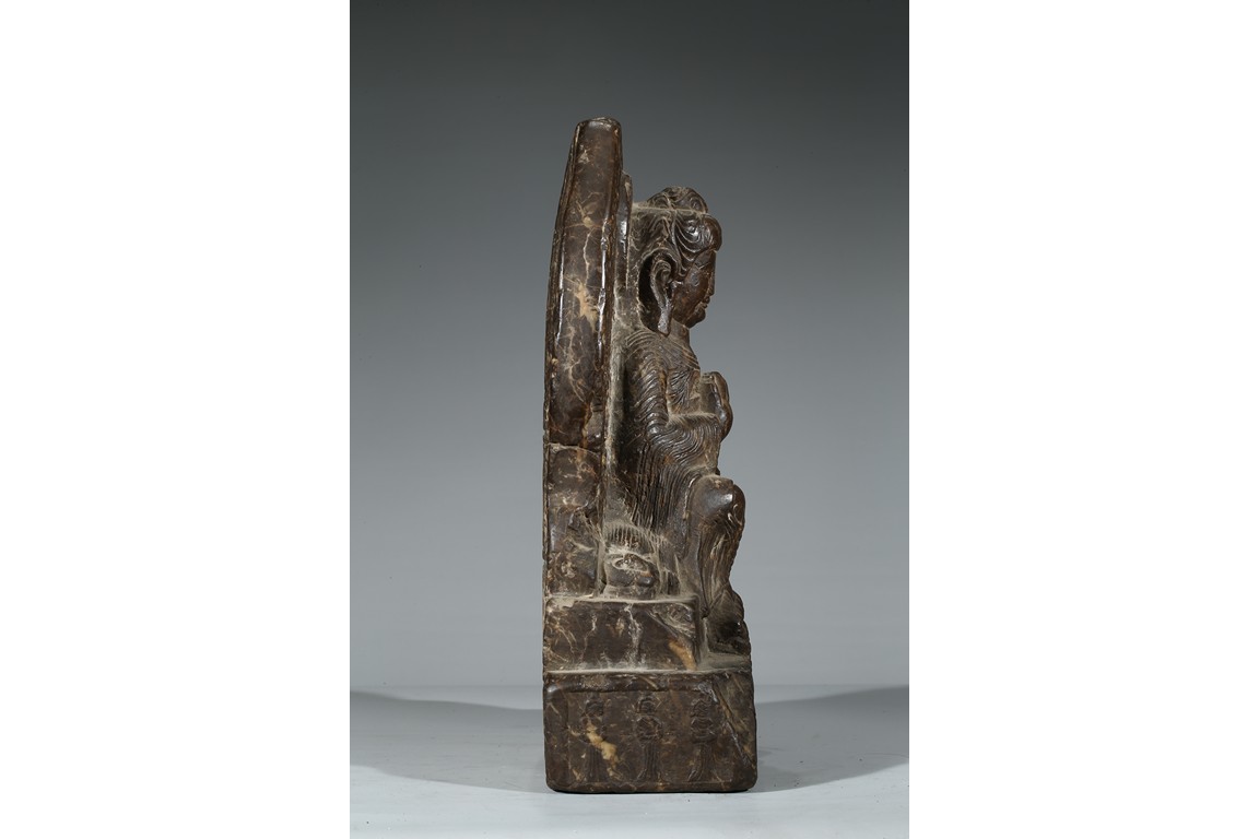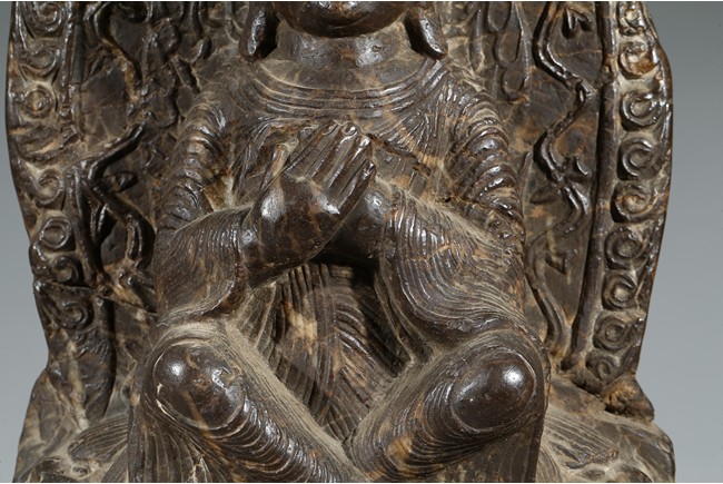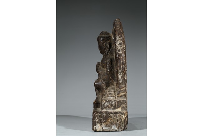 The figure shown sitting cross legs on the top step of three stepped stand, with a large mandorla behind. The face carved with downcast eyes and smiling lips. The ears elongating to shoulders. The hair tied up as a knot. 14th century or later.