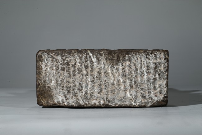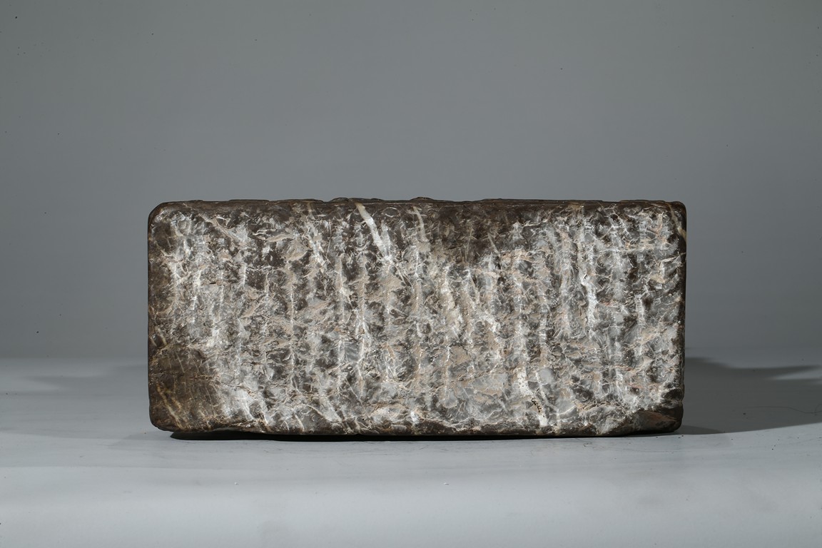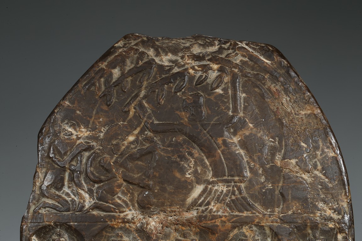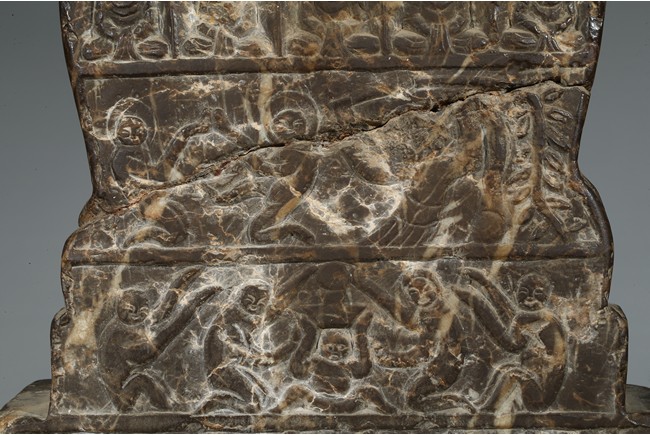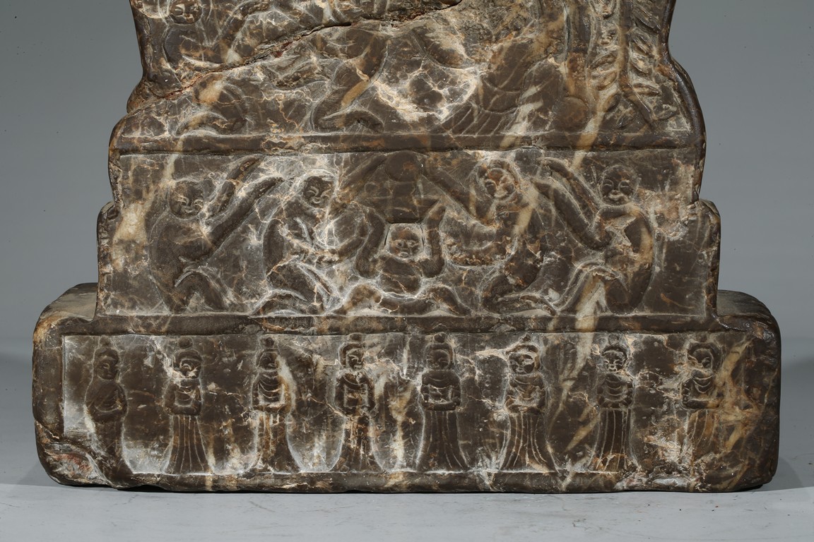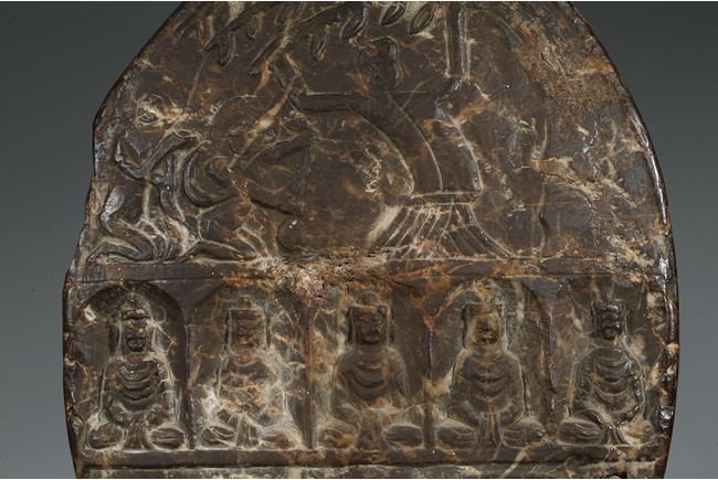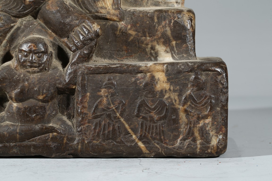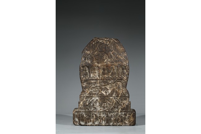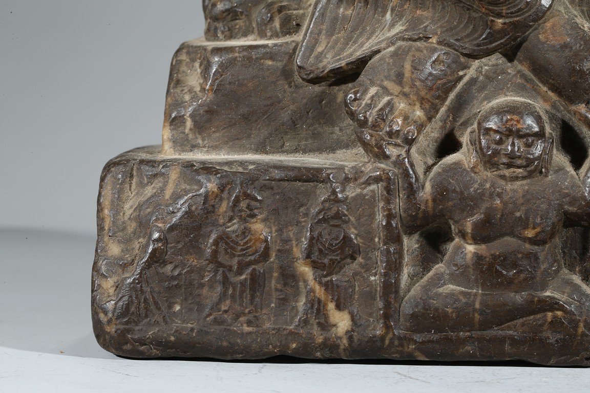The figure shown sitting cross legs on the top step of three stepped stand, with a large mandorla behind. The face carved with downcast eyes and smiling lips. The ears elongating to shoulders. The hair tied up as a knot. 14th century or later.