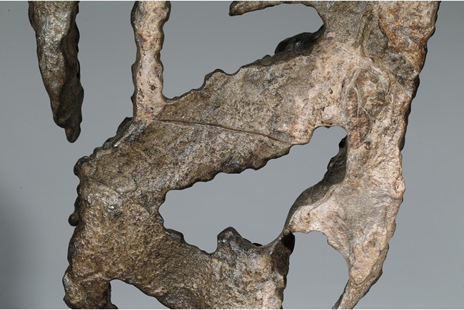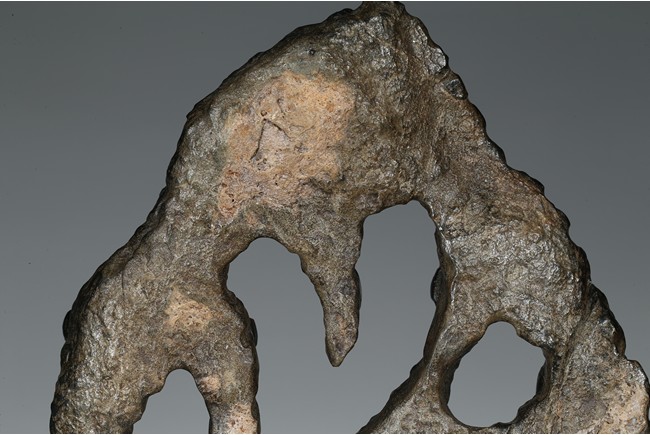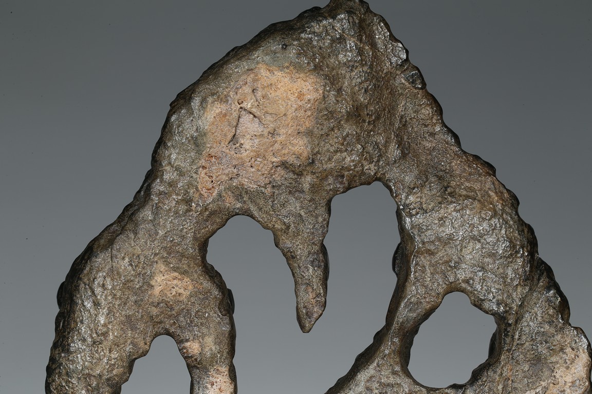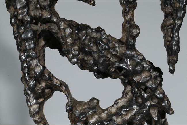 Of irregular shape, the black stone all supported on a hardwood stand.