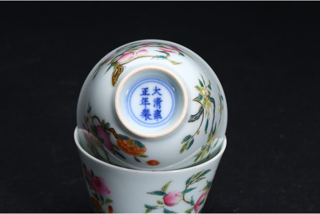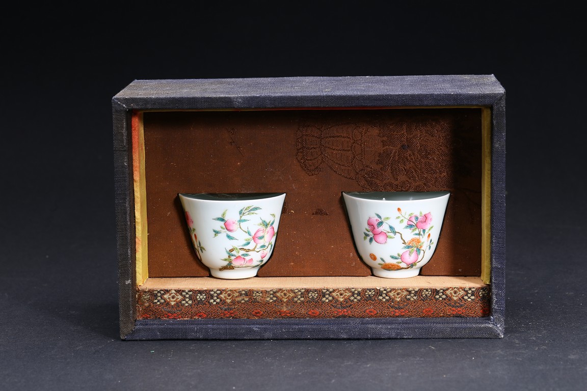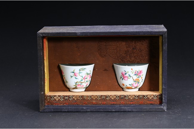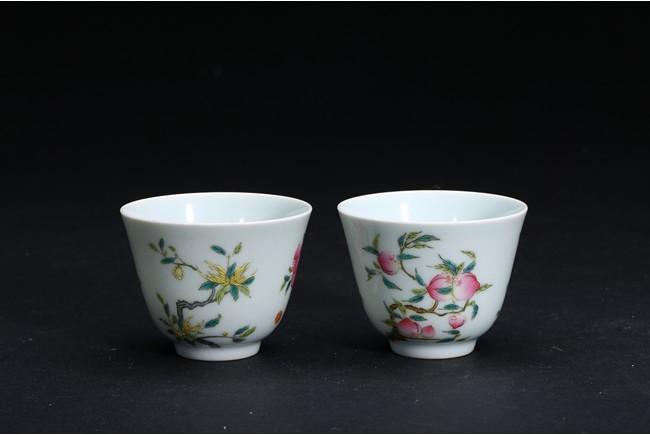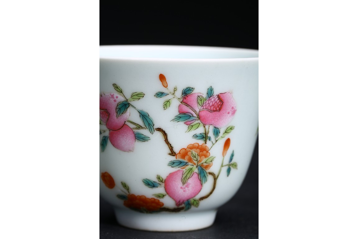 Each cup finely painted a plum tree, a pomegranate tree, and a bergamot tree.