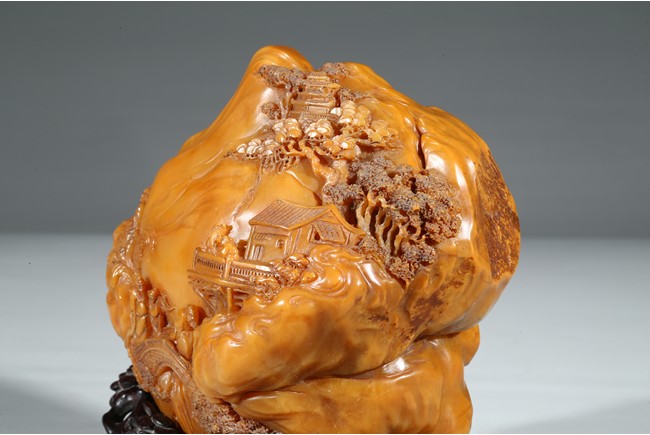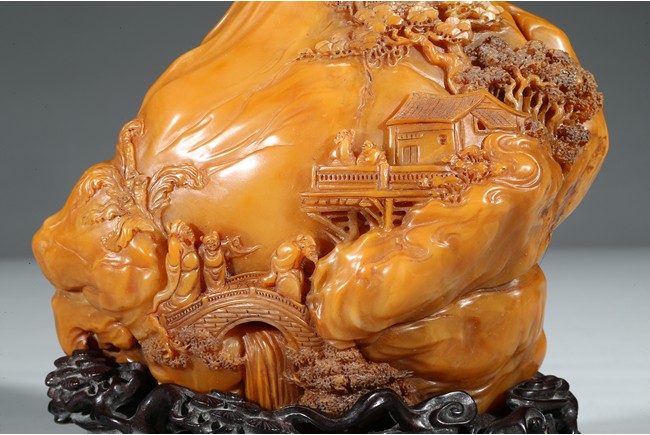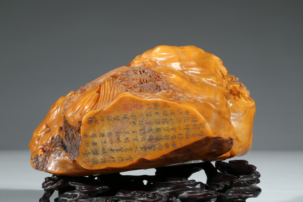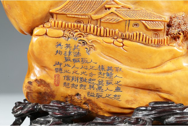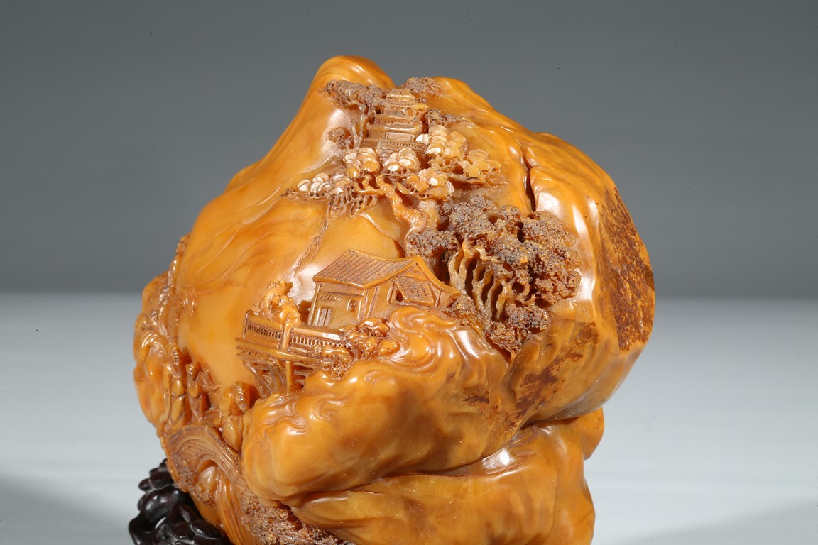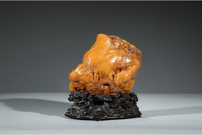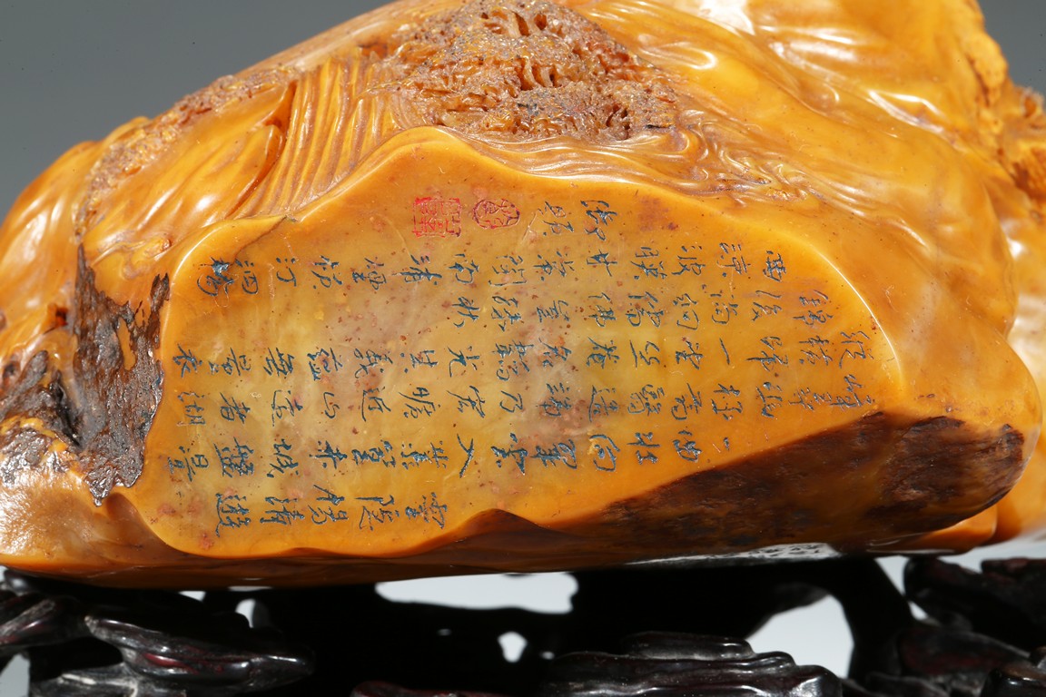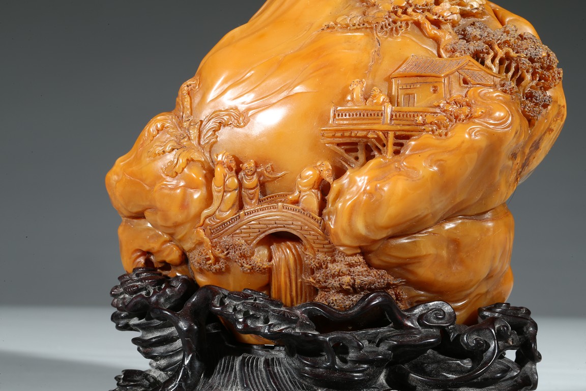 田黄石之所以珍稀的另一个原因是因为在地球上,只有福建寿山村一条小溪两旁数里狭长的水田底下砂层才有。且经过数百年来的连续掘采,寿山村的水田已被翻掘了无数次,如今已开采殆尽,上乘的田黄早已是无价之宝。本次拍品“田黃大山子”重1310克,體大,雕工精細,形態自然。所雕小橋流水,樹木亭閣,栩栩如生,彷彿讓人感覺到了仙境一般的境界,彌足珍貴。背面及底部刻有詩文。配有酸枝木底座。來源: 圣地亞哥著名藏家陳昌師先生提供