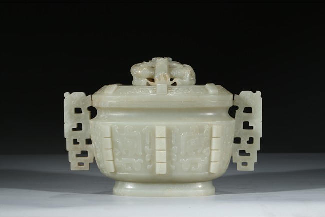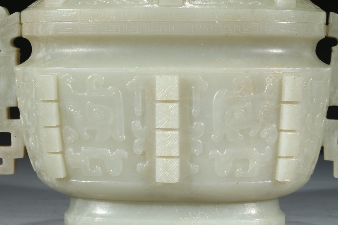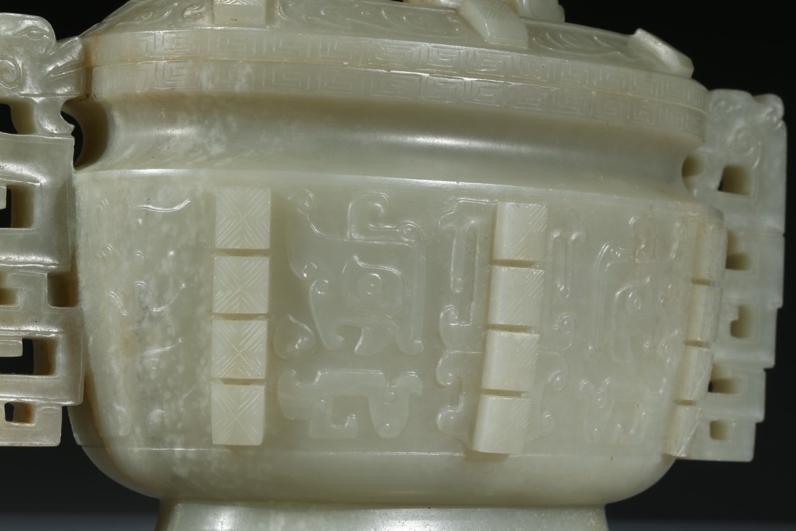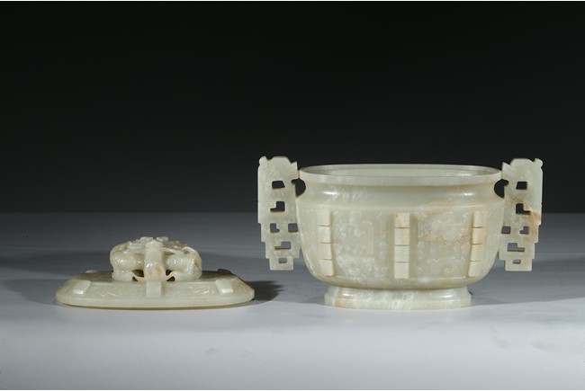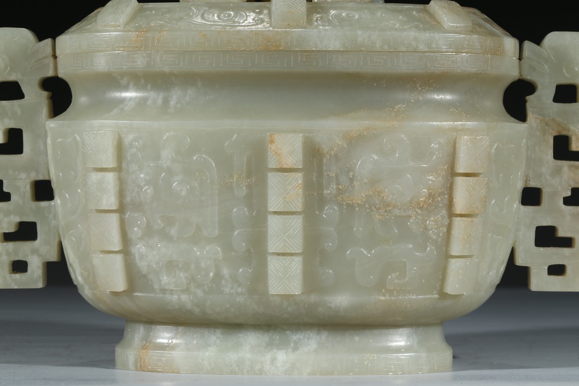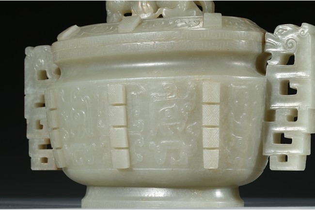 "清宮仿古玉器向來有"造化鐘神秀"之譽,其中又以乾隆一朝為代表,乾隆皇帝愛玉如痴,大興玉器收集、考據、研究、製造之事。在玉器品味方面,以機巧繁縟為俗,以傳襲古典為雅,此件玉簋即是乾隆宮廷仿古玉器品味之詮釋,其藍本出自商周青銅簋,簋身所飾饕餮紋也是三代青銅器之典型紋飾。整器器型和紋飾雖有增減,但著重仿其神韻。此器雕琢上乘,挖膛精細,磨工一絲不苟。紋飾高古風雅,器形端穆致遠,既有上古之樣,又具時代之風,為乾隆宮廷玉作所倡導的仿古玉器之典型。"