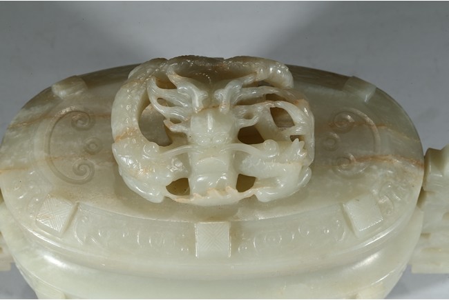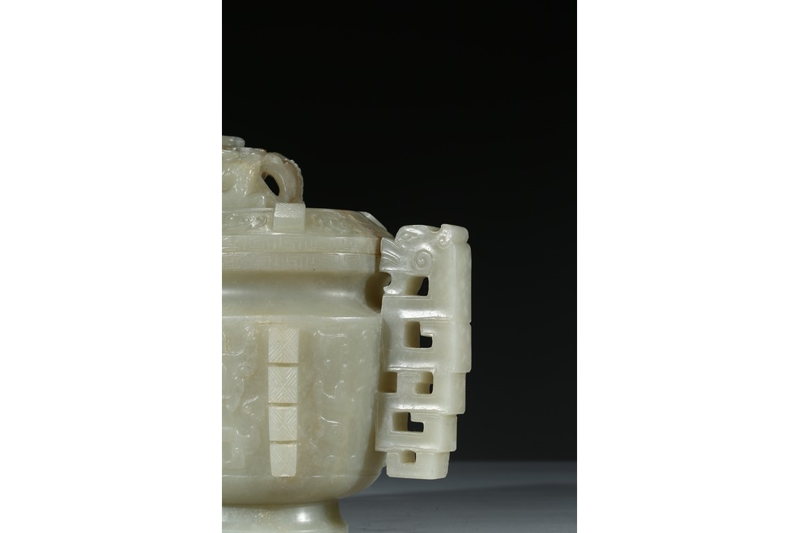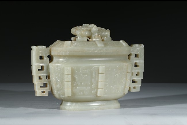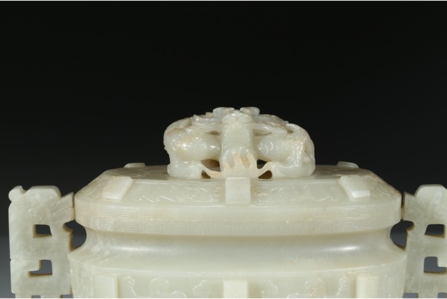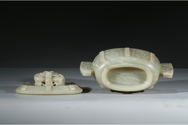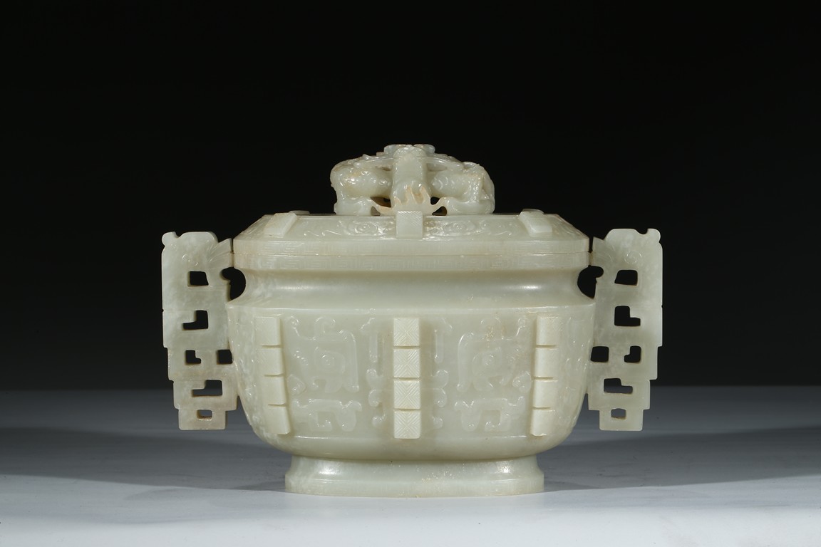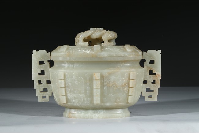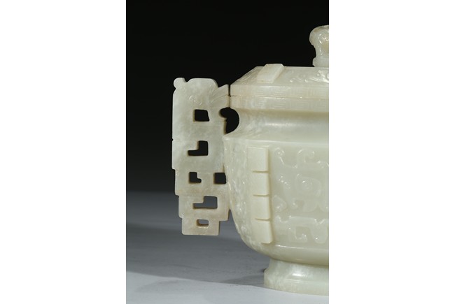 "清宮仿古玉器向來有"造化鐘神秀"之譽,其中又以乾隆一朝為代表,乾隆皇帝愛玉如痴,大興玉器收集、考據、研究、製造之事。在玉器品味方面,以機巧繁縟為俗,以傳襲古典為雅,此件玉簋即是乾隆宮廷仿古玉器品味之詮釋,其藍本出自商周青銅簋,簋身所飾饕餮紋也是三代青銅器之典型紋飾。整器器型和紋飾雖有增減,但著重仿其神韻。此器雕琢上乘,挖膛精細,磨工一絲不苟。紋飾高古風雅,器形端穆致遠,既有上古之樣,又具時代之風,為乾隆宮廷玉作所倡導的仿古玉器之典型。"