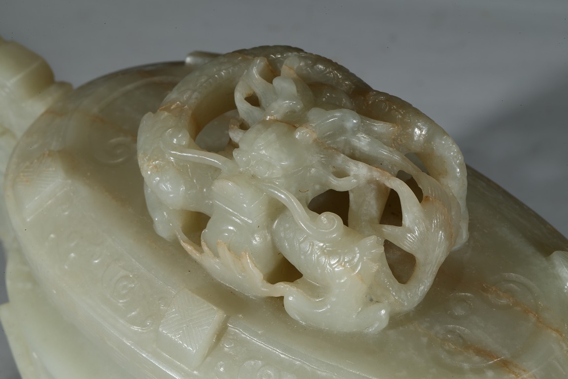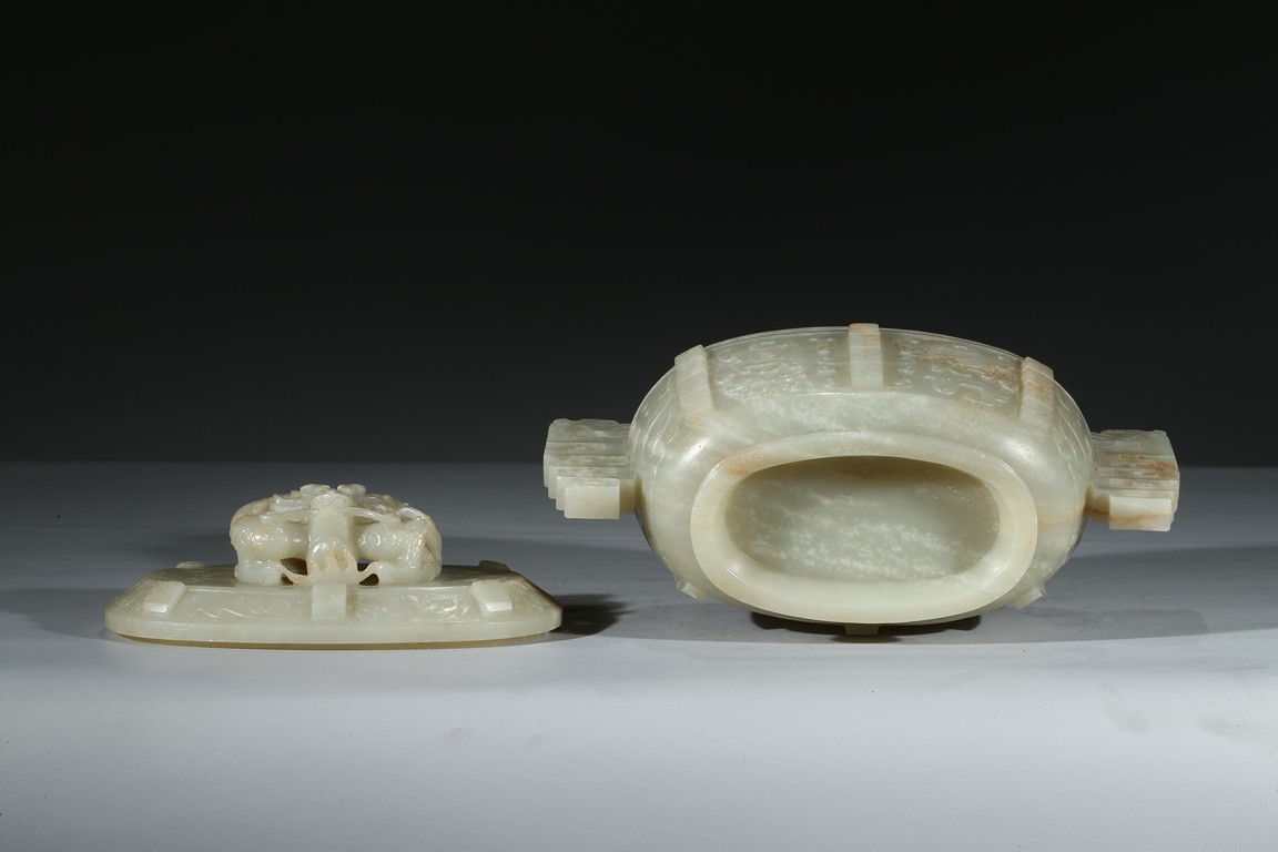 Modelled in the form of archaistic vessel, the body decorated with taotie mask divided by notched flanges, flanked by two stylized mythical beast handles, the cover topped with a recumbent dragon. Qing Dynasty period.
