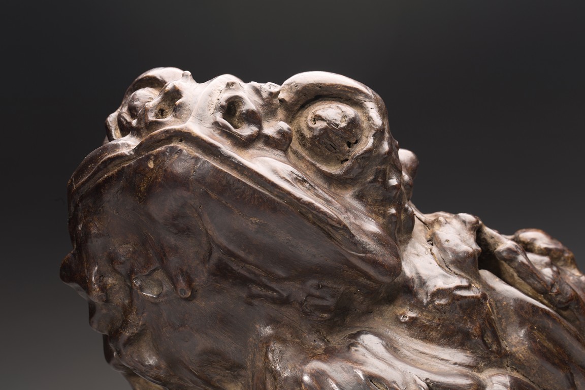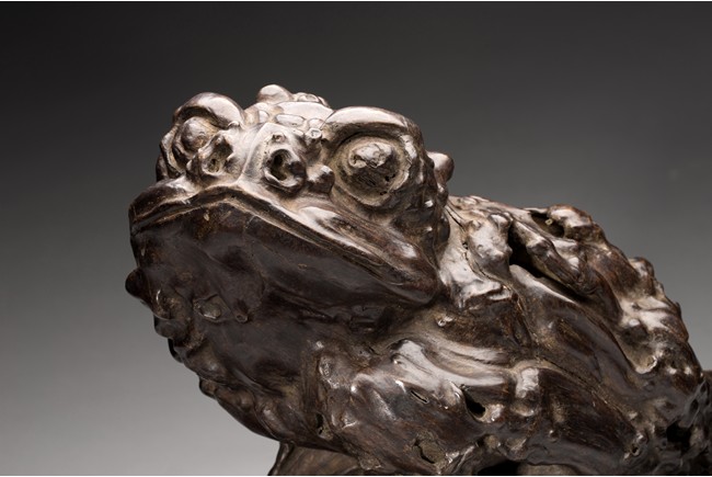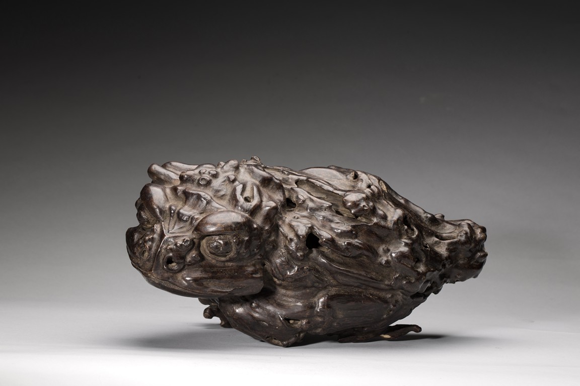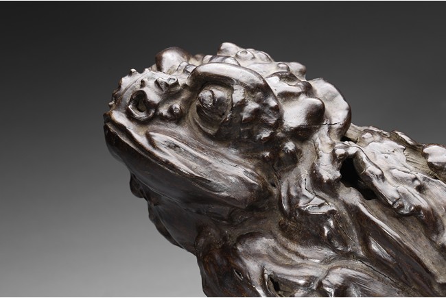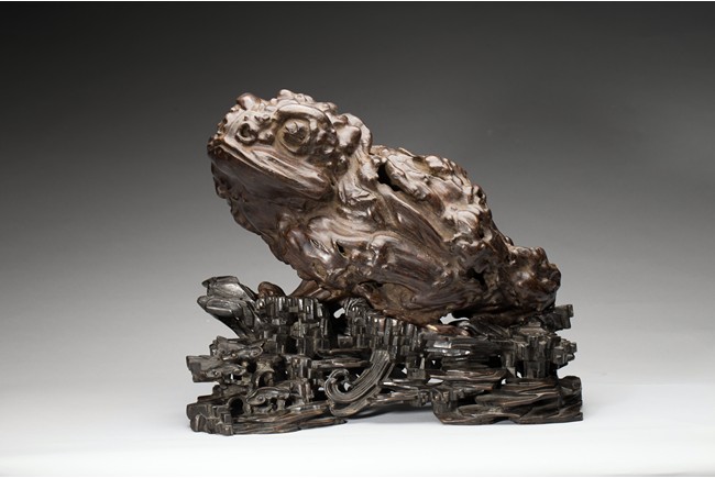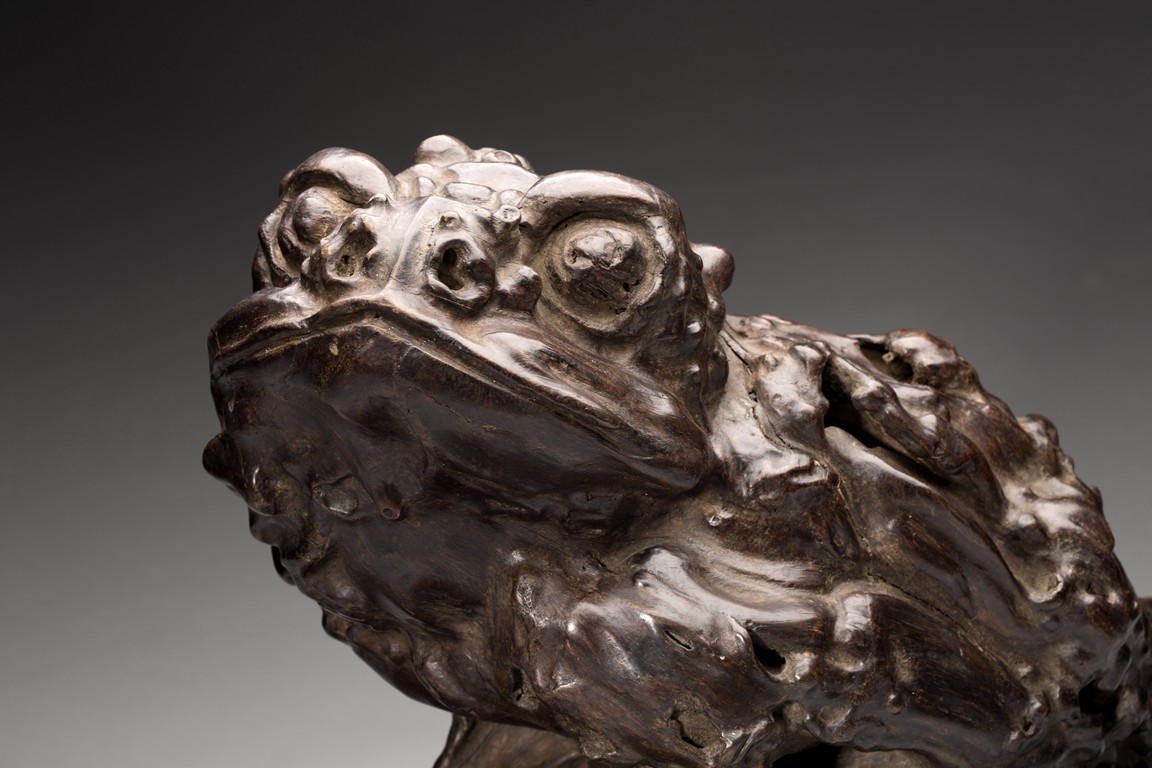 Naturalistically carved out of aloeswood with characteristic aroma, the carving depicts a seated toad with head turned left, the face with large bulging eyes and round nostrils, the front feet stretched, all supported on a hardwood stand. Qing Dynasty period.