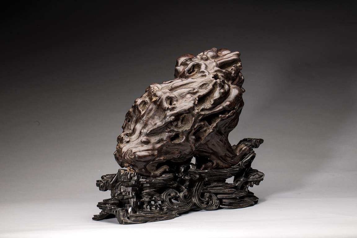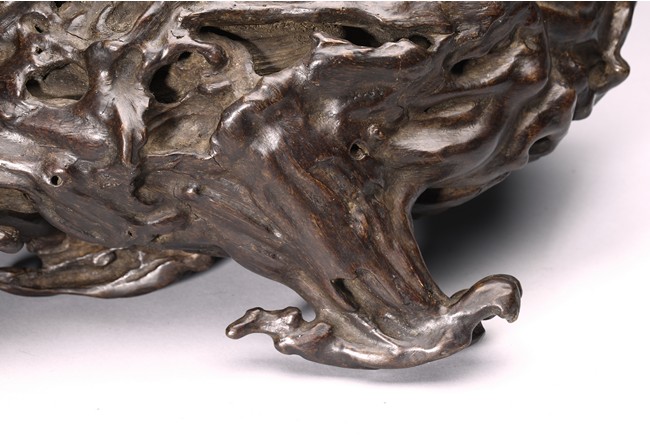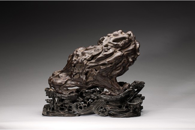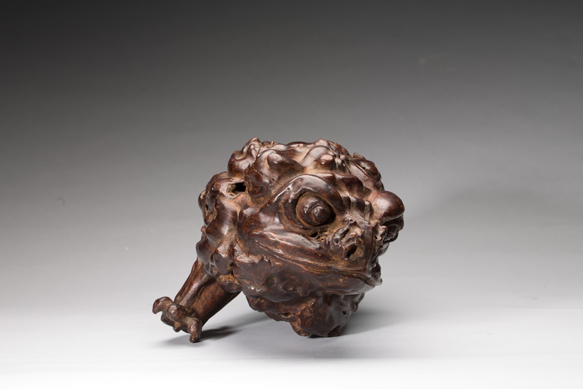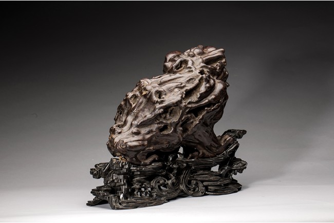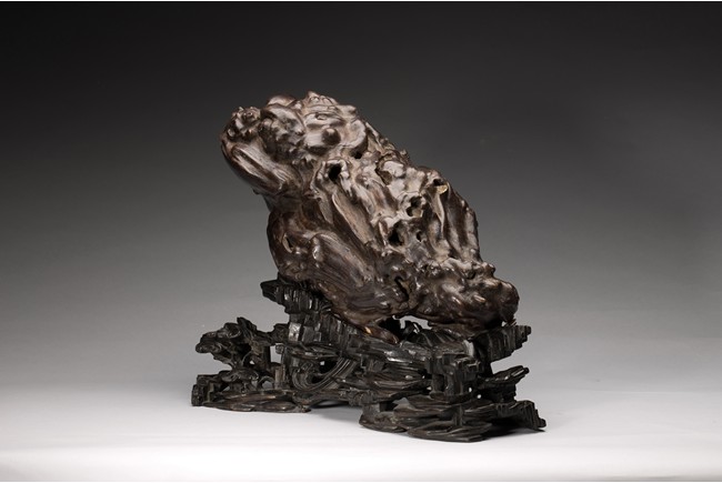 Naturalistically carved out of aloeswood with characteristic aroma, the carving depicts a seated toad with head turned left, the face with large bulging eyes and round nostrils, the front feet stretched, all supported on a hardwood stand. Qing Dynasty period.